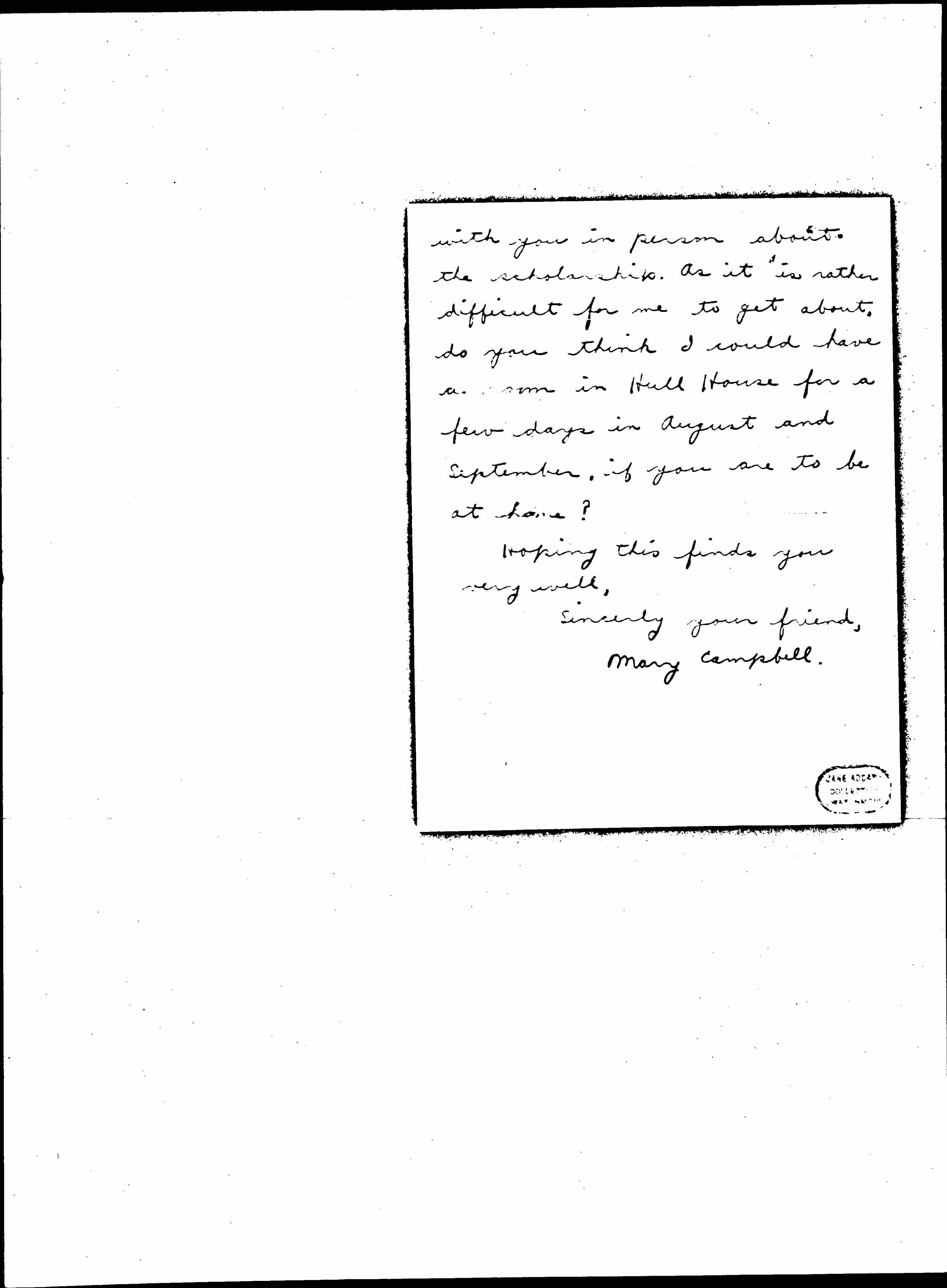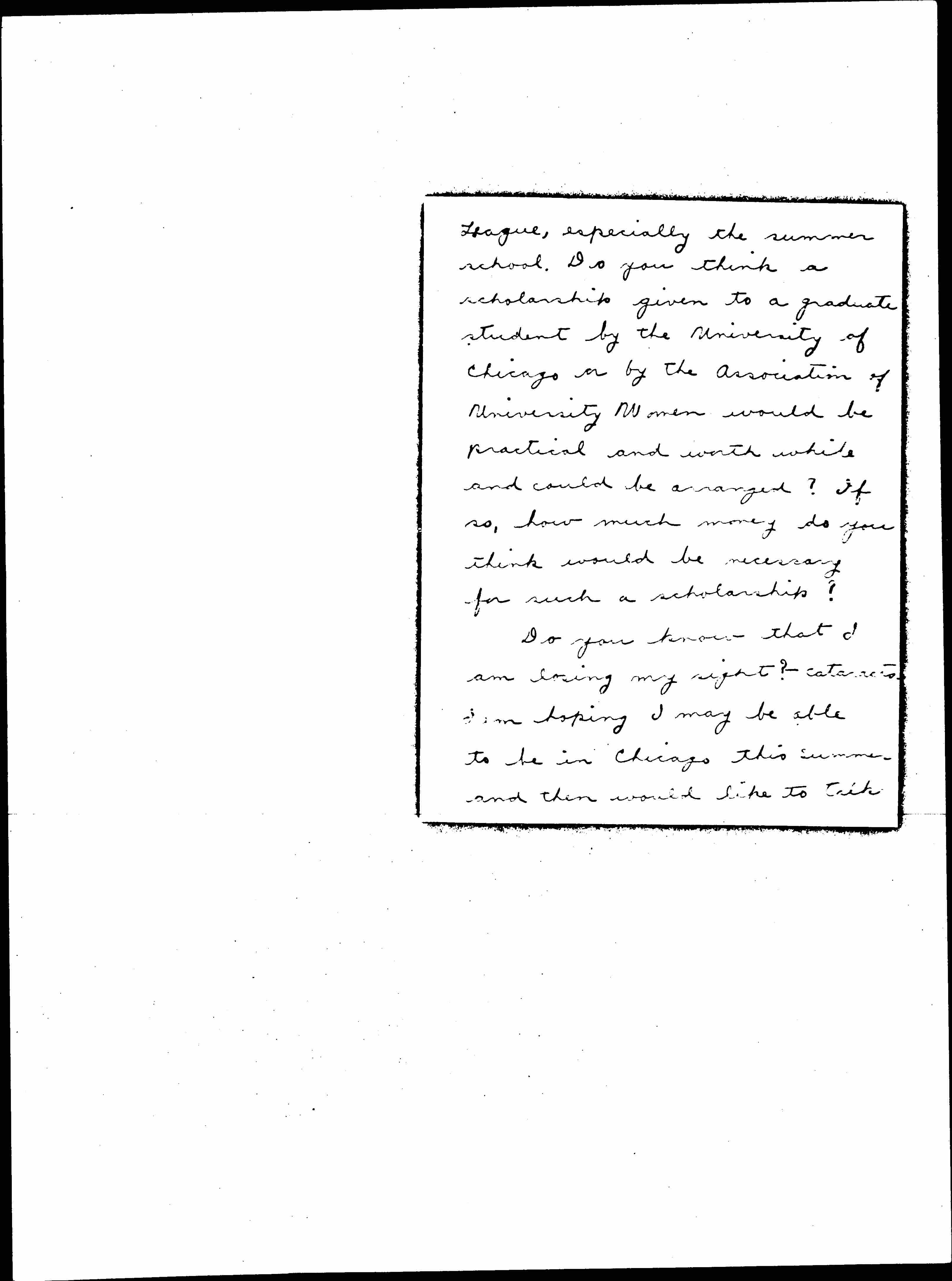 Do you know that I am losing my right? -- cataracts. I am hoping I may be able to be in Chicago this summer and then would like to talk [page 3] with you in person about the scholarship. As it is rather difficult for me to get about, do you think I could have a room in Hull House for a few days in August and September, if you are to be at home?