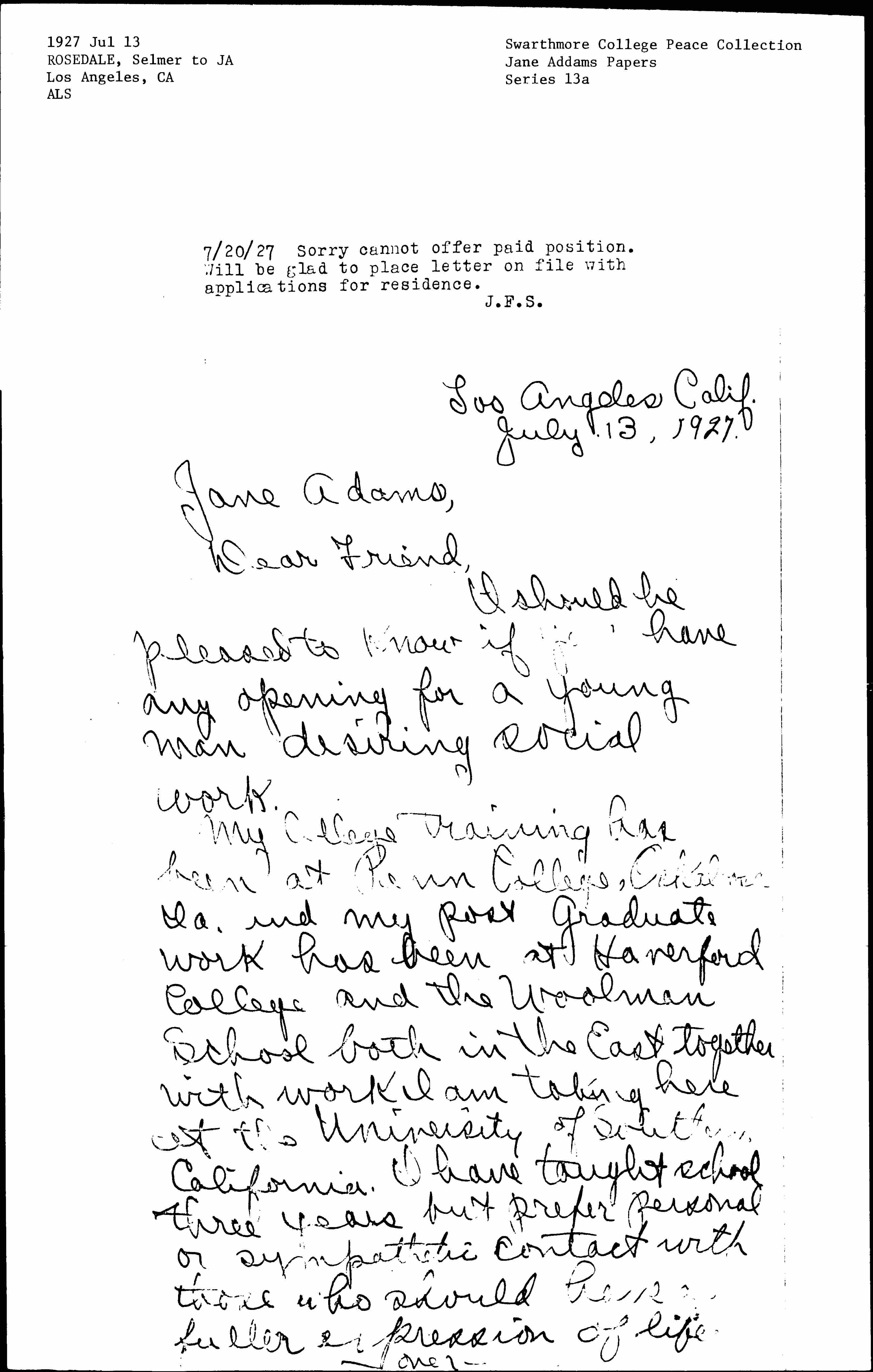 My College training has been at Penn College, Oskaloosa, Ia. and my post graduate work has been at Haverford College and the Woolman School both in the East together with work I am taking here at the University of Southern California. I have taught school three years but prefer personal or sympathetic contact with those who should have a fuller expression of life. [page 2]
