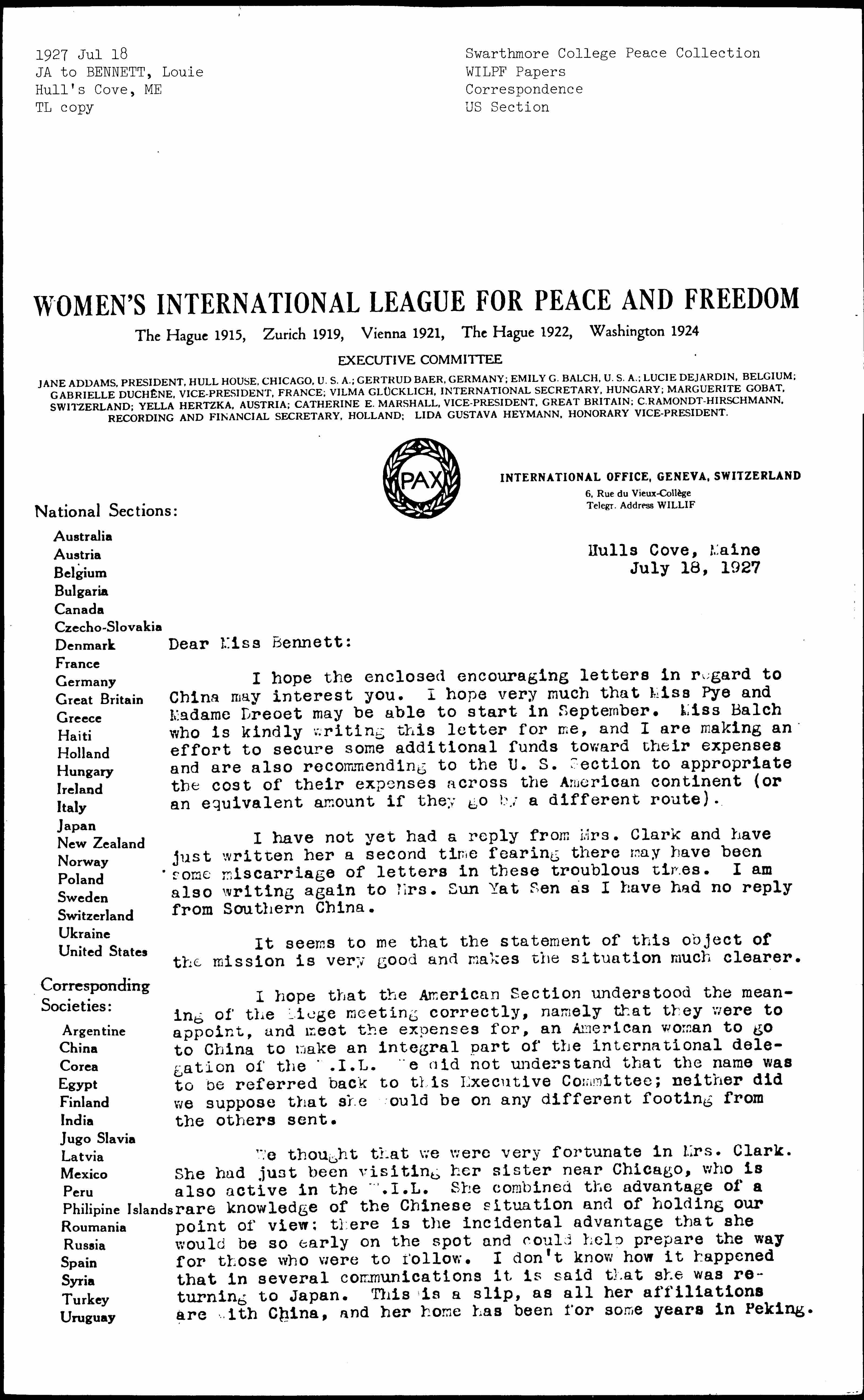 We thought that we were very fortunate in Mrs. Clark. She had just been visiting her sister near Chicago, who is also active in the W.I.L. She combined the advantage of a rare knowledge of the Chinese situation and of holding our point of view; there is the incidental advantage that she would be so early on the spot and could help prepare the way for those who were to follow. I don't know how it happened that in several communications it is said that she was returning to Japan. This is a slip, as all her affiliations are with China, and her home has been for some years in Peking. [page 2]