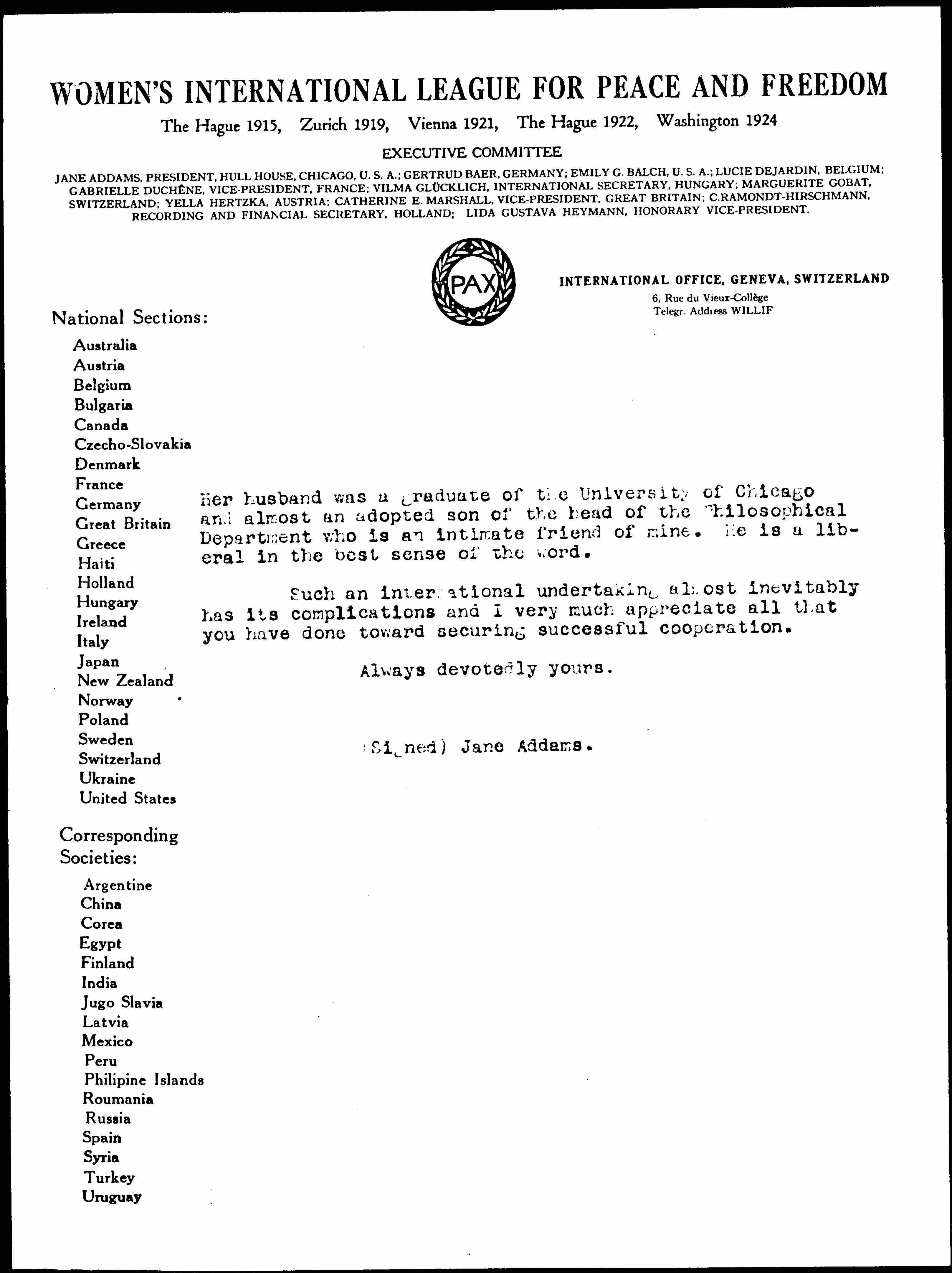 I hope that the American Section understood the meaning of the Liège meeting correctly, namely that they were to appoint, and meet the expenses for, an American woman to go to China to make an integral part of the international delegation of the W.I.L. We did not understand that the name was to be referred back to this Executive Committee; neither did we suppose that she could be on any different footing from the others sent.