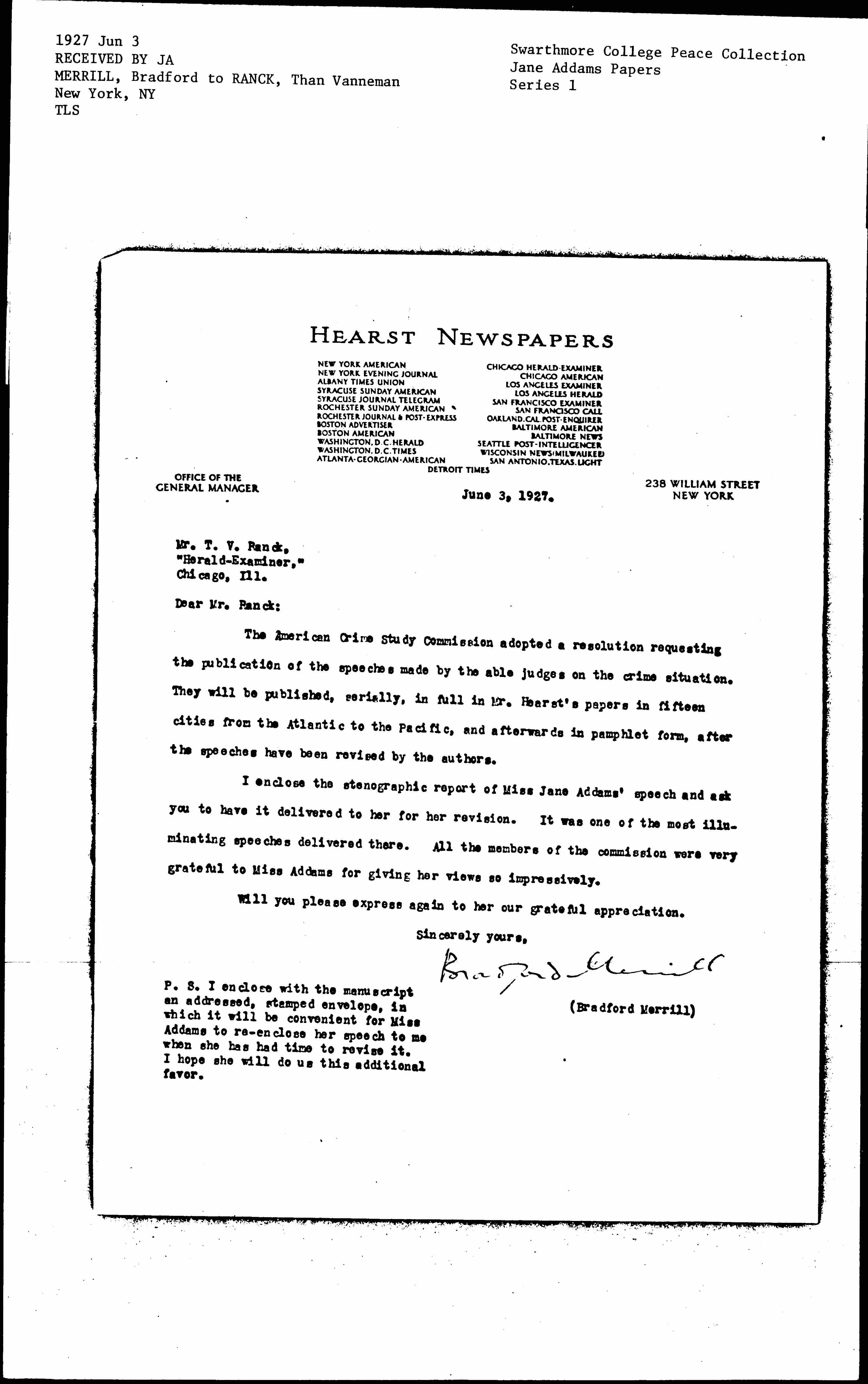 P.S. I enclose with the manuscript an addressed, stamped envelope, in which it will be convenient for Miss Addams to re-enclose her speech to me when she has had time to revise it. I hope she will do us this additional favor.