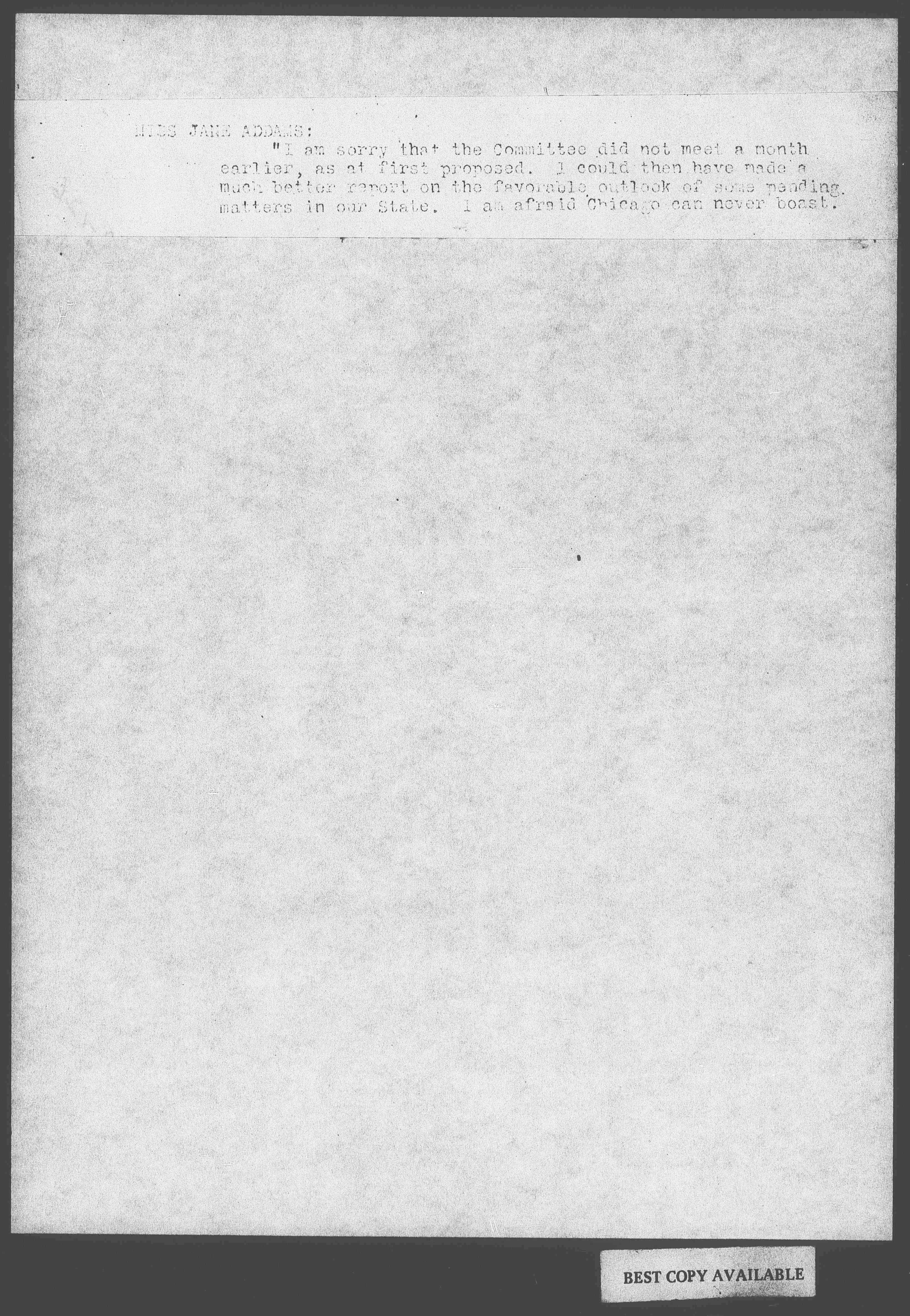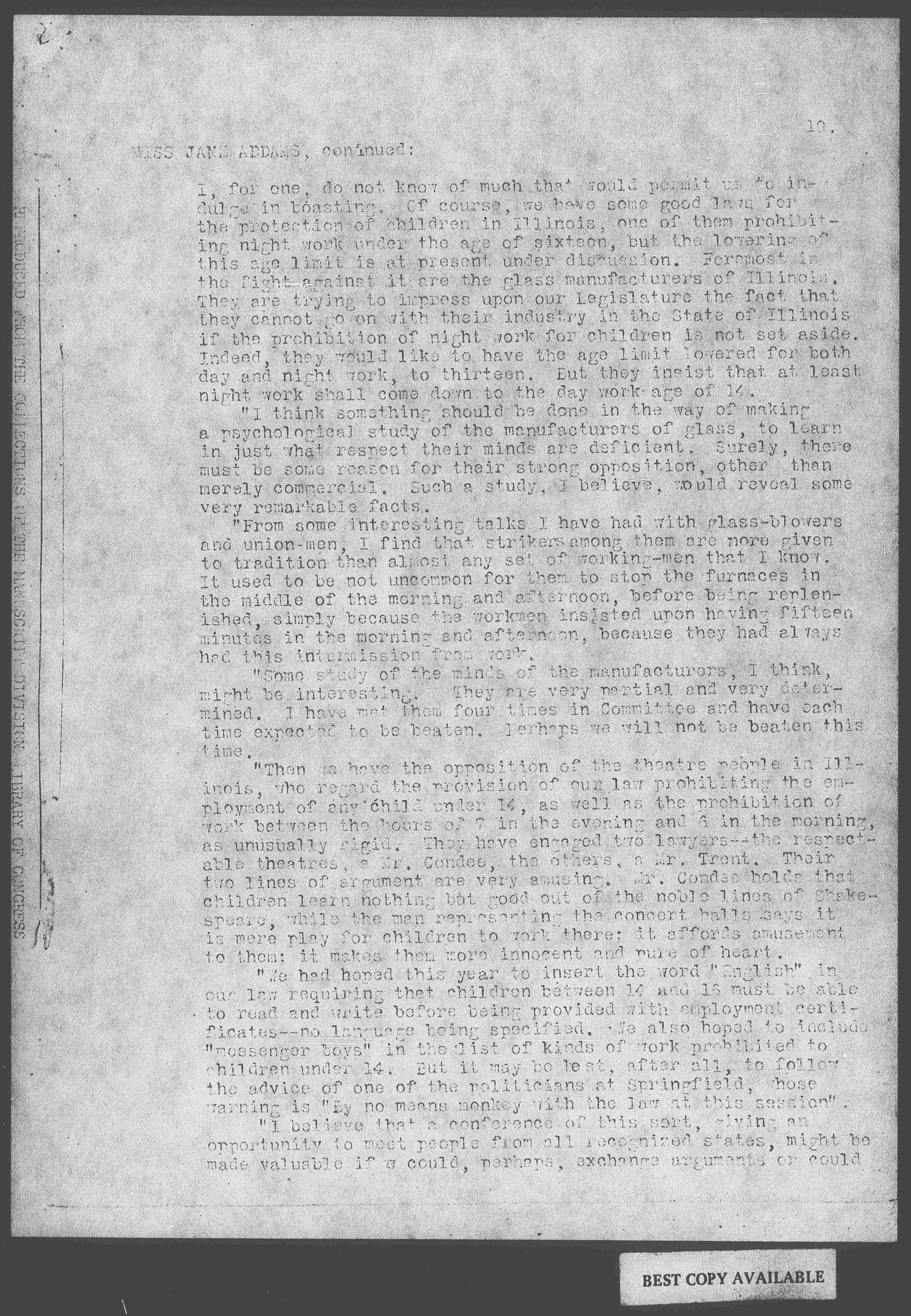 "I am sorry that the Committee did not meet a month earlier, as at first proposed. I could then have made a much better report on the favorable outlook of some pending matters in our State. I am afraid Chicago can never boast. [page 2] I, for one, do not know of much that would permit us to indulge in boasting. Of course, we have some good laws for the protection of children in Illinois, one of them prohibiting night work under the age of sixteen, but the lowering of this age limit is at present under discussion. Foremost in the fight against it are the glass manufacturers of Illinois. They are trying to impress upon our Legislature the fact that they cannot go on with their industry in the State of Illinois if the prohibition of night work for children is not set aside. Indeed, they would like to have the age limit lowered for both day and night work, to thirteen. But they insist that at least night work shall come down to the day work age of 14.