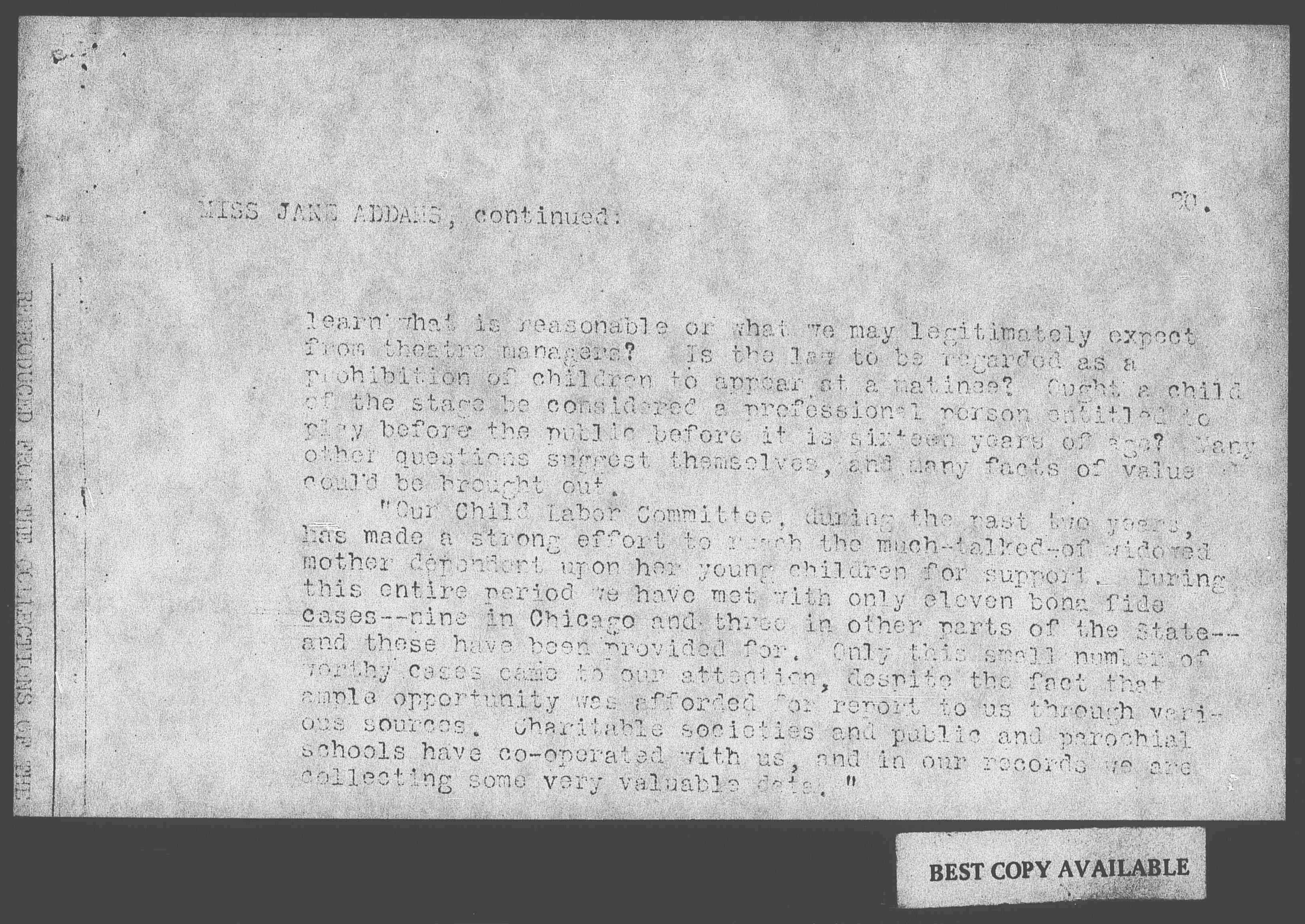 "Our Child Labor Committee, during the past two years, has made a strong effort to reach the much-talked-of widowed mother dependent upon her young children for support. During this entire period we have met with only eleven bona fide cases – nine in Chicago and three in other parts of the State – and these have been provided for. Only this small number of worthy cases came to our attention, despite the fact that ample opportunity was afforded for report to us through various sources. Charitable societies and public and parochial schools have [cooperated] with us, and in our records we are collecting some very valuable data."