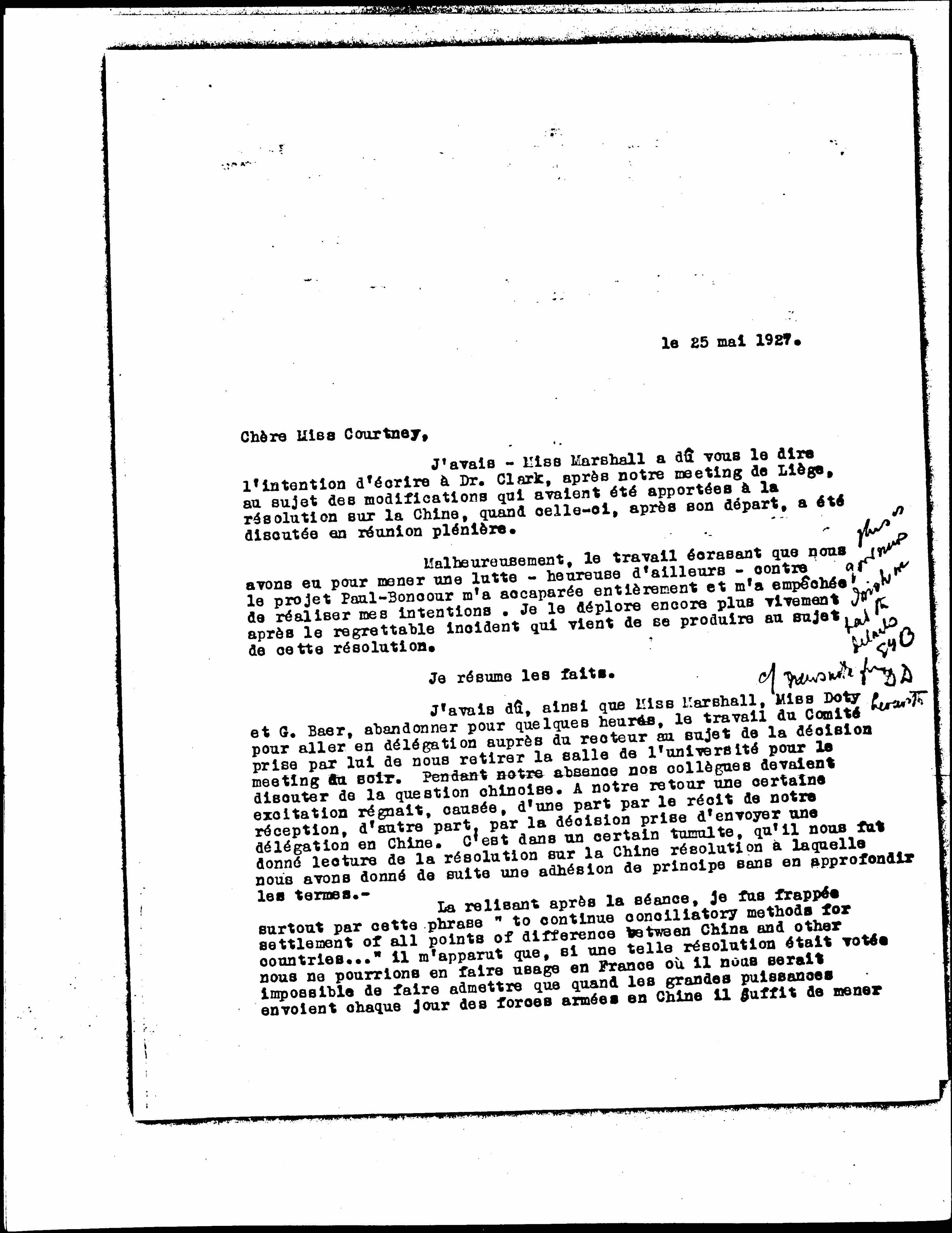 I had- Miss Marshall must have told you intended to write to Dr. Clark after our Liege meeting about the changes that had been made to the resolution on China when this after his departure was discussed in plenary meeting.