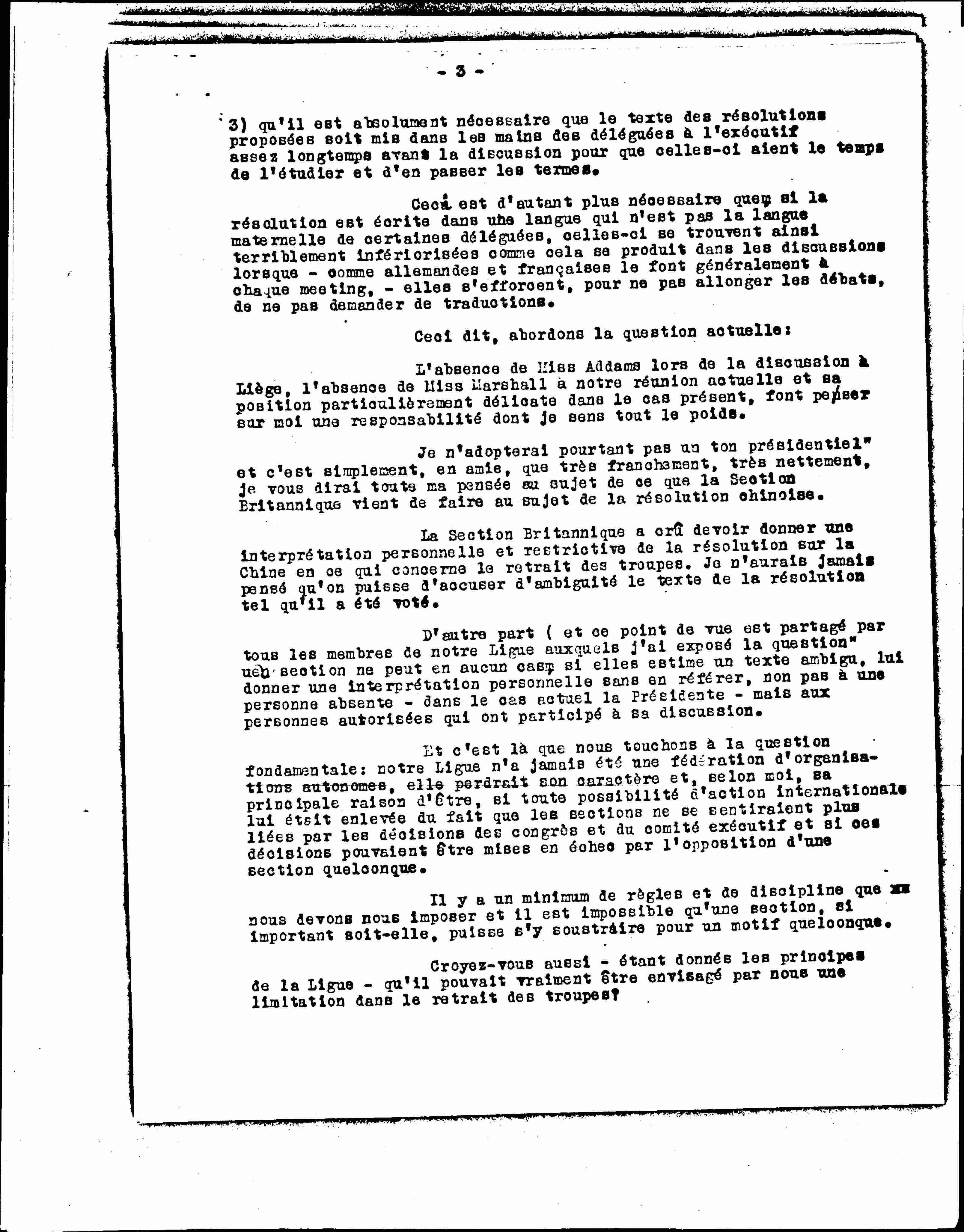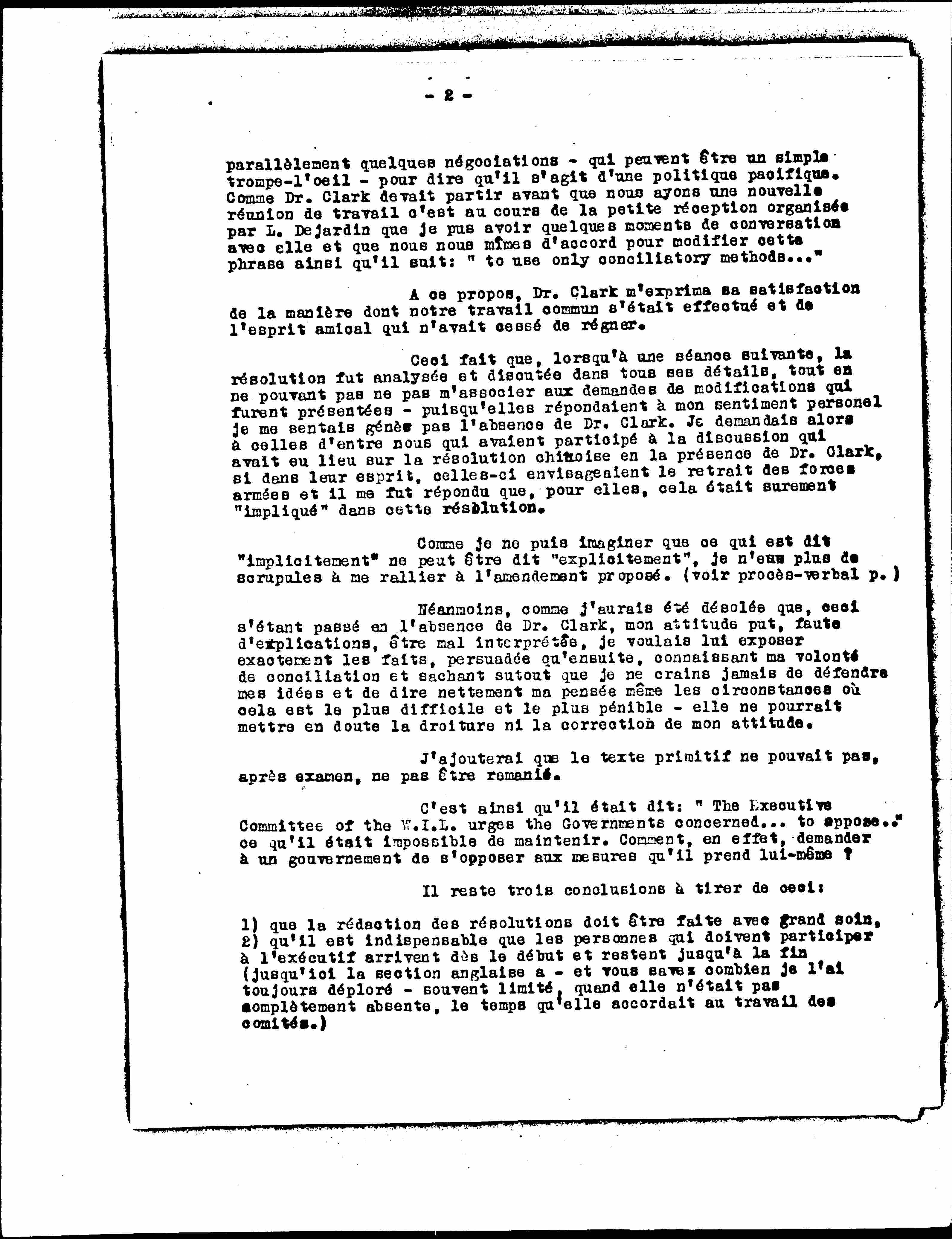 I will add that the original text could not, after examination, not be reworked. Thus it was said: "The Executive Committee of the W.I.L. urges the Governments concerned...to oppose..." which it was impossible to maintain. How indeed can a government be asked to oppose the measures it takes itself?