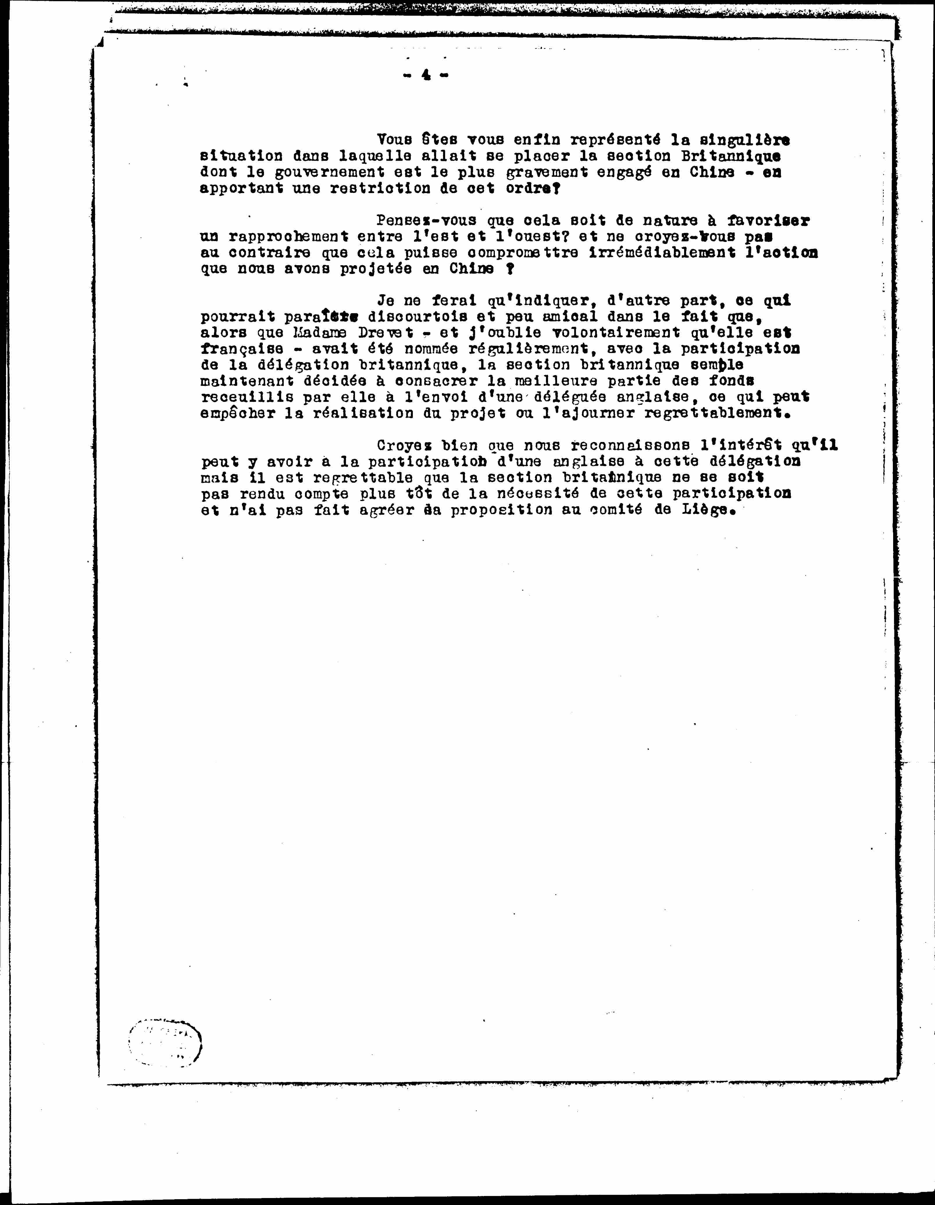 Mrs Drevet - and I voluntarily forget that she is French - had been appointed regularly with the participation of the British delegation, the British section now seems determined to devote the best part of the funds raised by it to sending a delegate English which can prevent the realization of the project or postpone it regrettably.