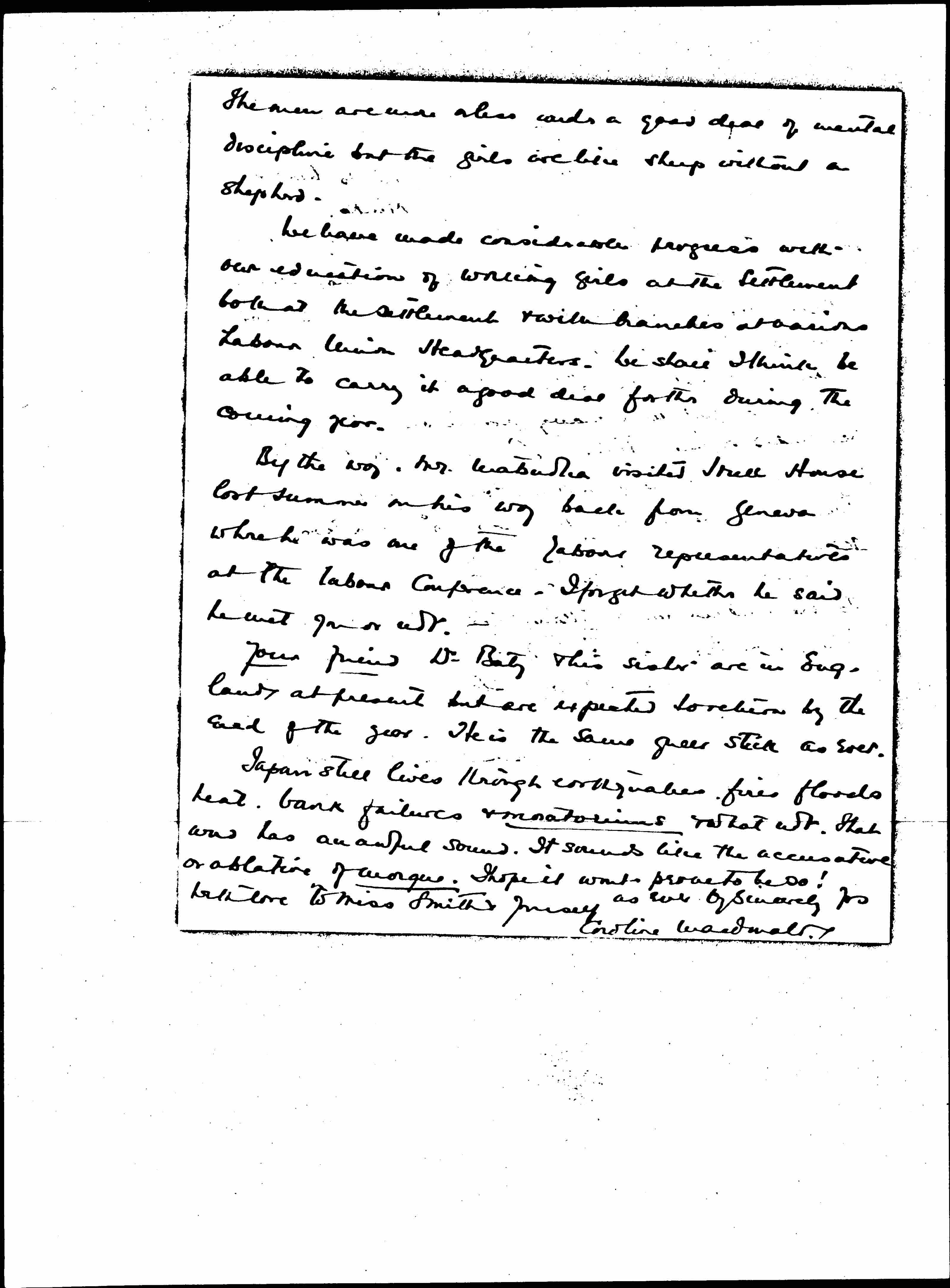 I have been doing some "soap box" oratory recently to the strikers in a cotton mill on the outskirts of Tokyo, where the majority of the workers are women or girls. Mr. Matsuoka whom I took to visit you in the hospital you will remember (the general secretary of the Federation of Labour), asked me to go out with him, so I went two or three times -- spoke to groups of the strikers here & there as there was no real meeting place of any size. The strike was fortunately settled a few days ago -- to the advantage to some extent of the strikers. [page 2] The men are more or less under a good deal of mental discipline but the girls are like sheep without a shepherd.