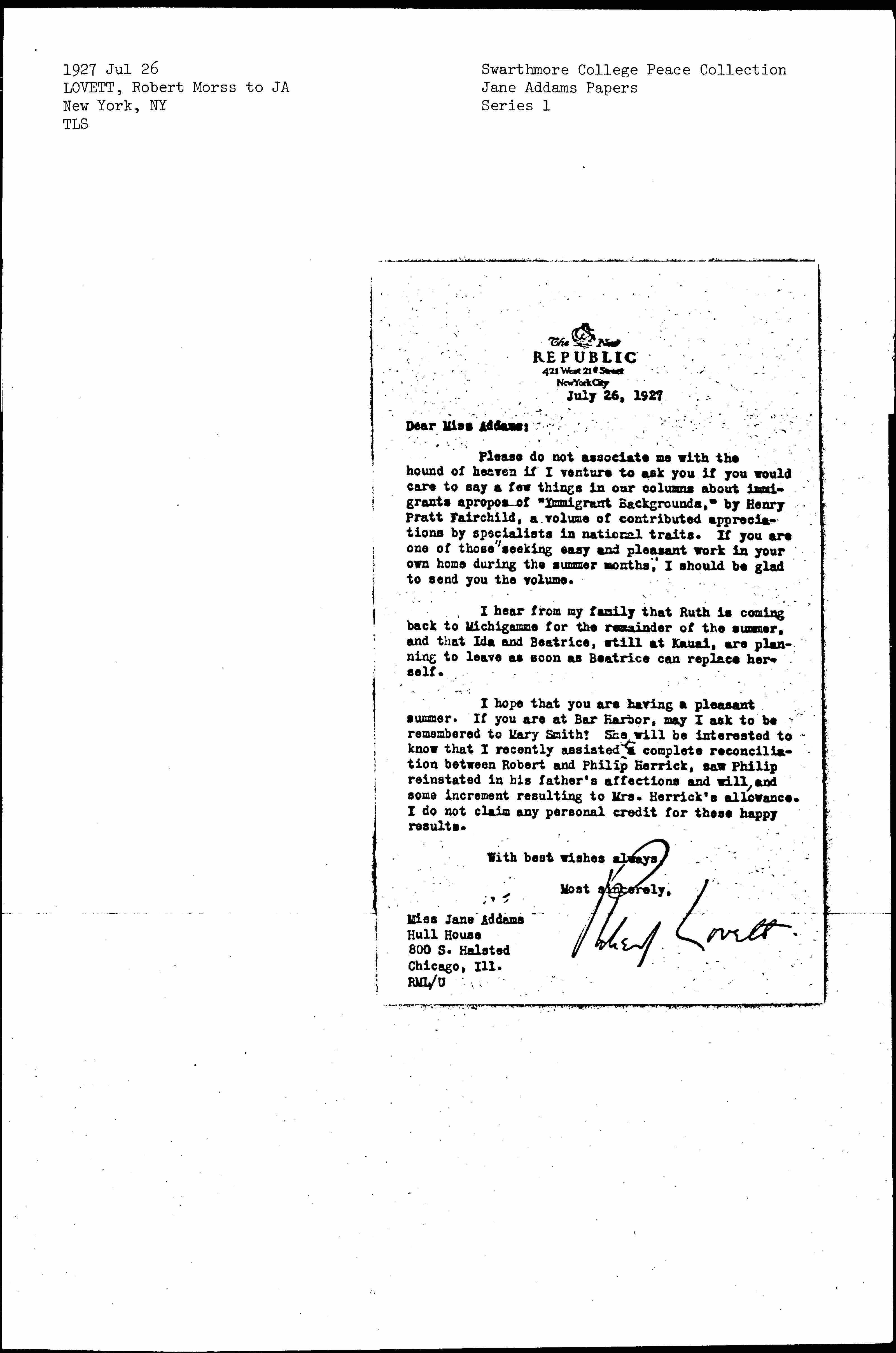 I hope that you are having a pleasant summer. If you are at Bar Harbor, may I ask to be remembered to Mary Smith? She will be interested to know that I recently assisted ↑[at?]↓ [a?] complete reconciliation between Robert and Philip Herrick, saw Philip reinstated in his father's affections and will, and some increment resulting to Mrs. Herrick's allowance. I do not claim any personal credit for these happy results.