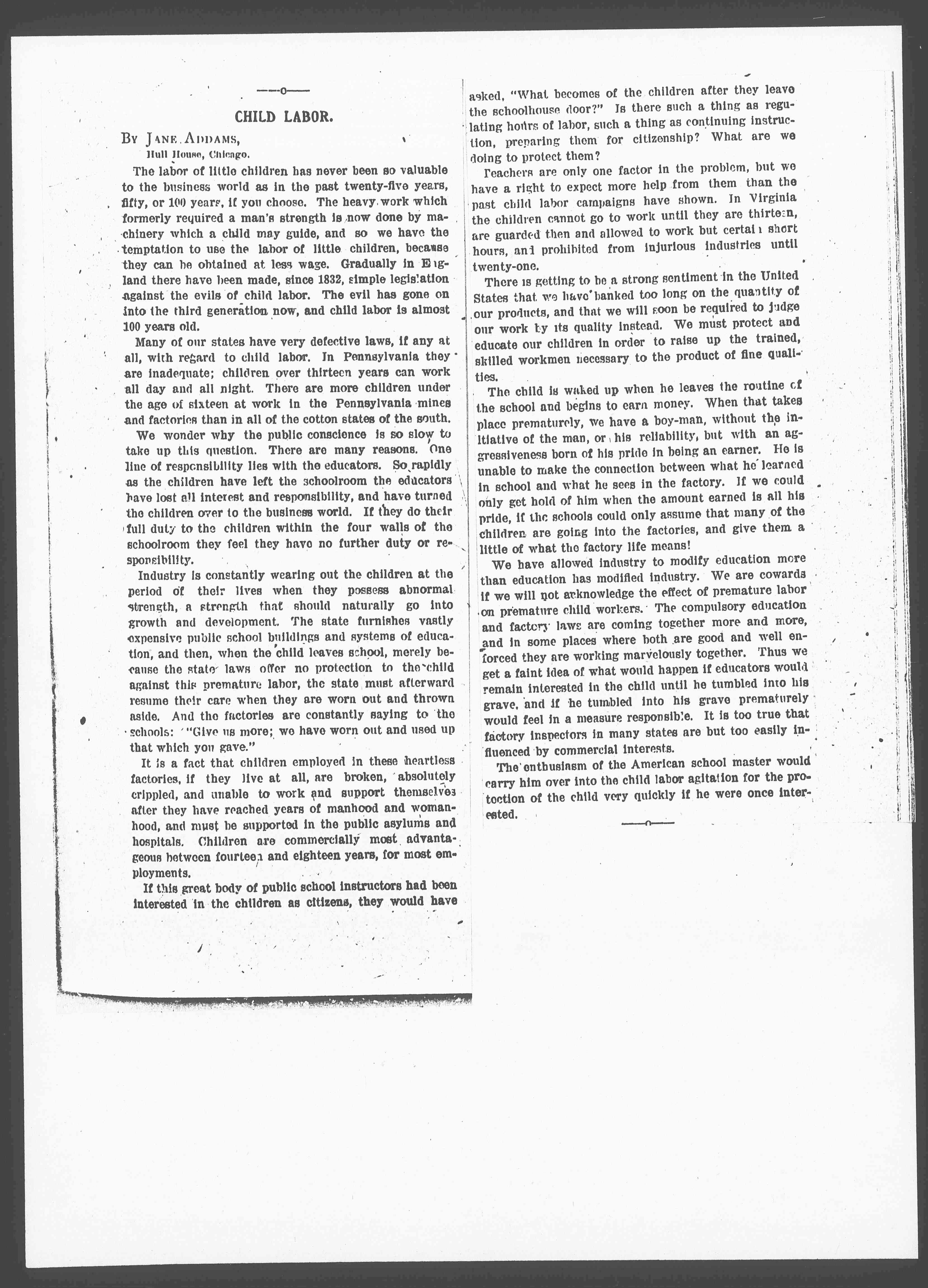 Many of our states have very defective laws, if any at all, with regard to child labor. In Pennsylvania they are inadequate; children over thirteen years can work all day and all night. There are more children under the age of sixteen at work in the Pennsylvania mines and factories than in all of the cotton states of the south.