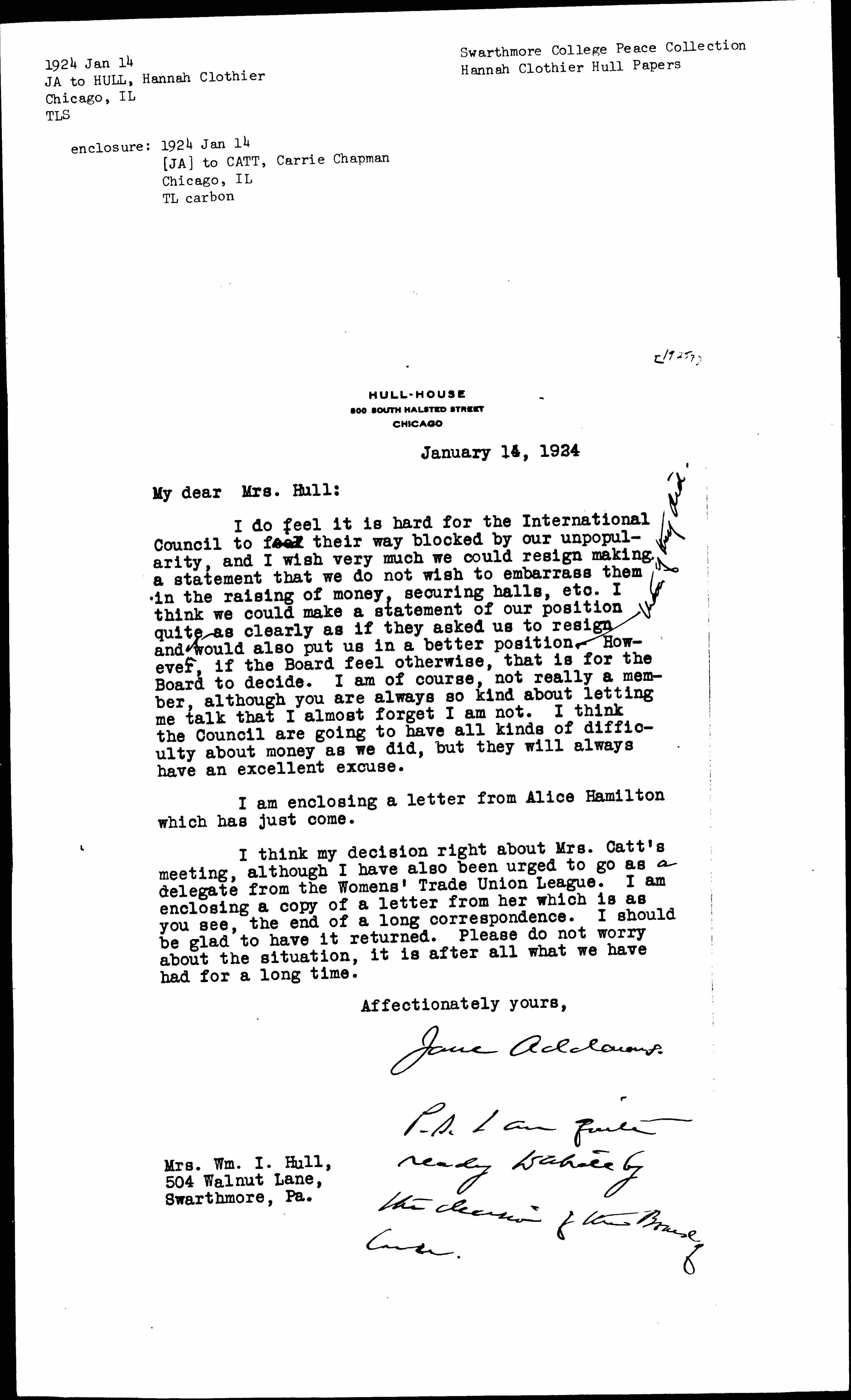 I think my decision right about Mrs. Catt's meeting, although I have also been urged to go as ↑a↓ delegate from the Women's Trade Union League. I am enclosing a copy of a letter from her which is as you see, the end of a long correspondence. I should be glad to have it returned. Please do not worry about the situation, it is after all what we have had for a long time.
