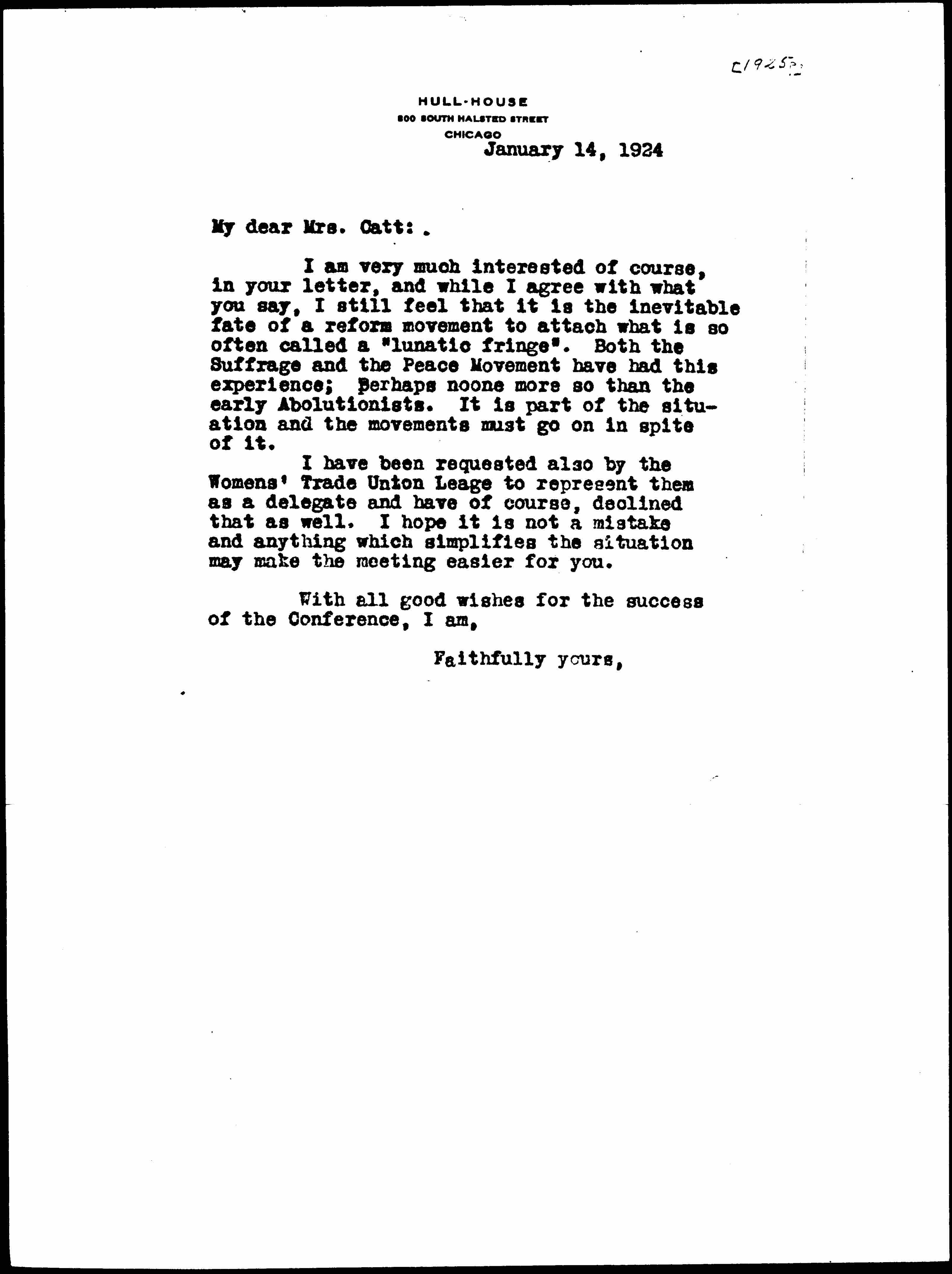 I have been requested also by the Women's Trade Union League to represent them as a delegate and have of course, declined that as well. I hope it is not a mistake and anything which simplifies the situation may make the meeting easier for you.