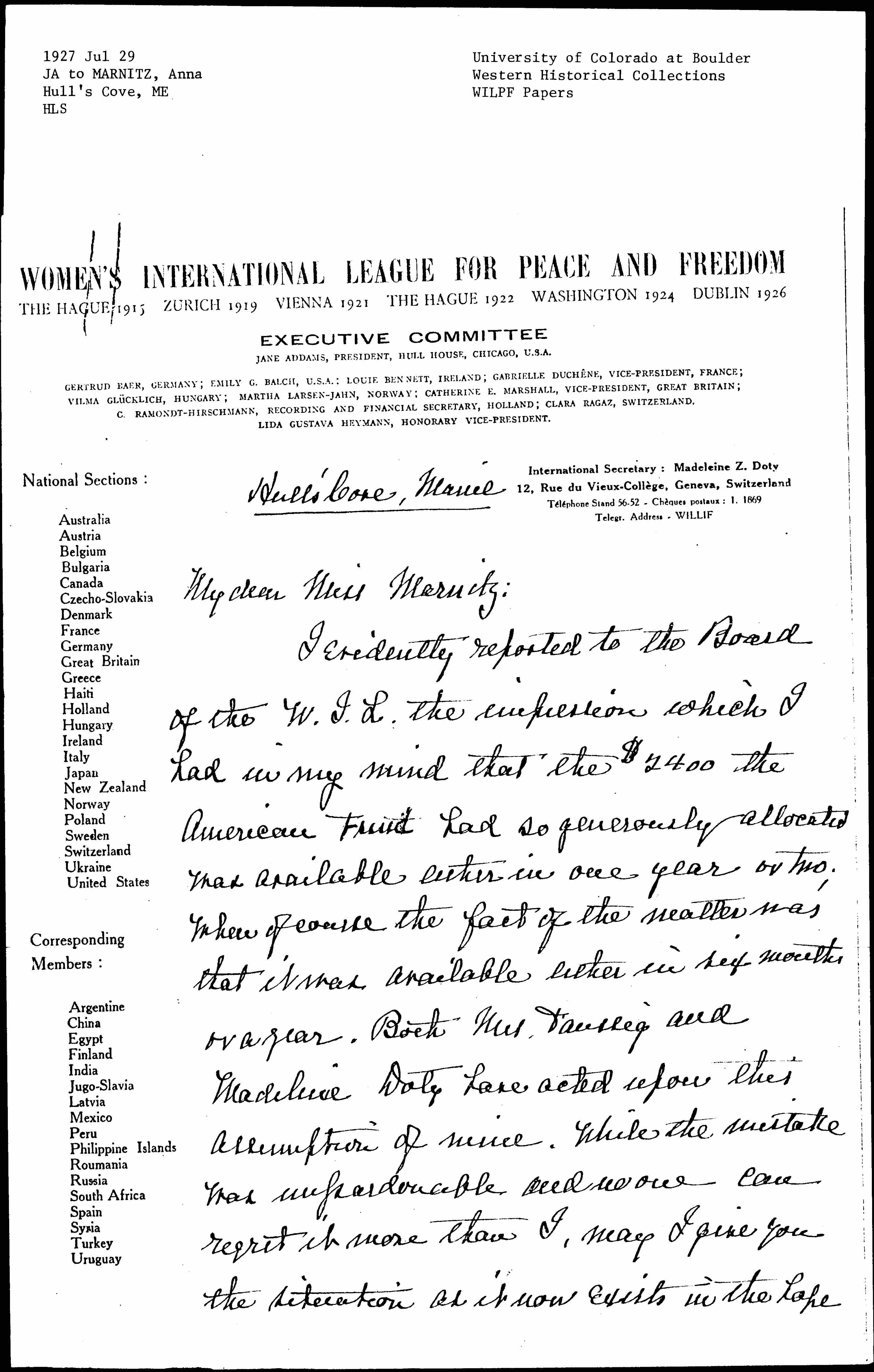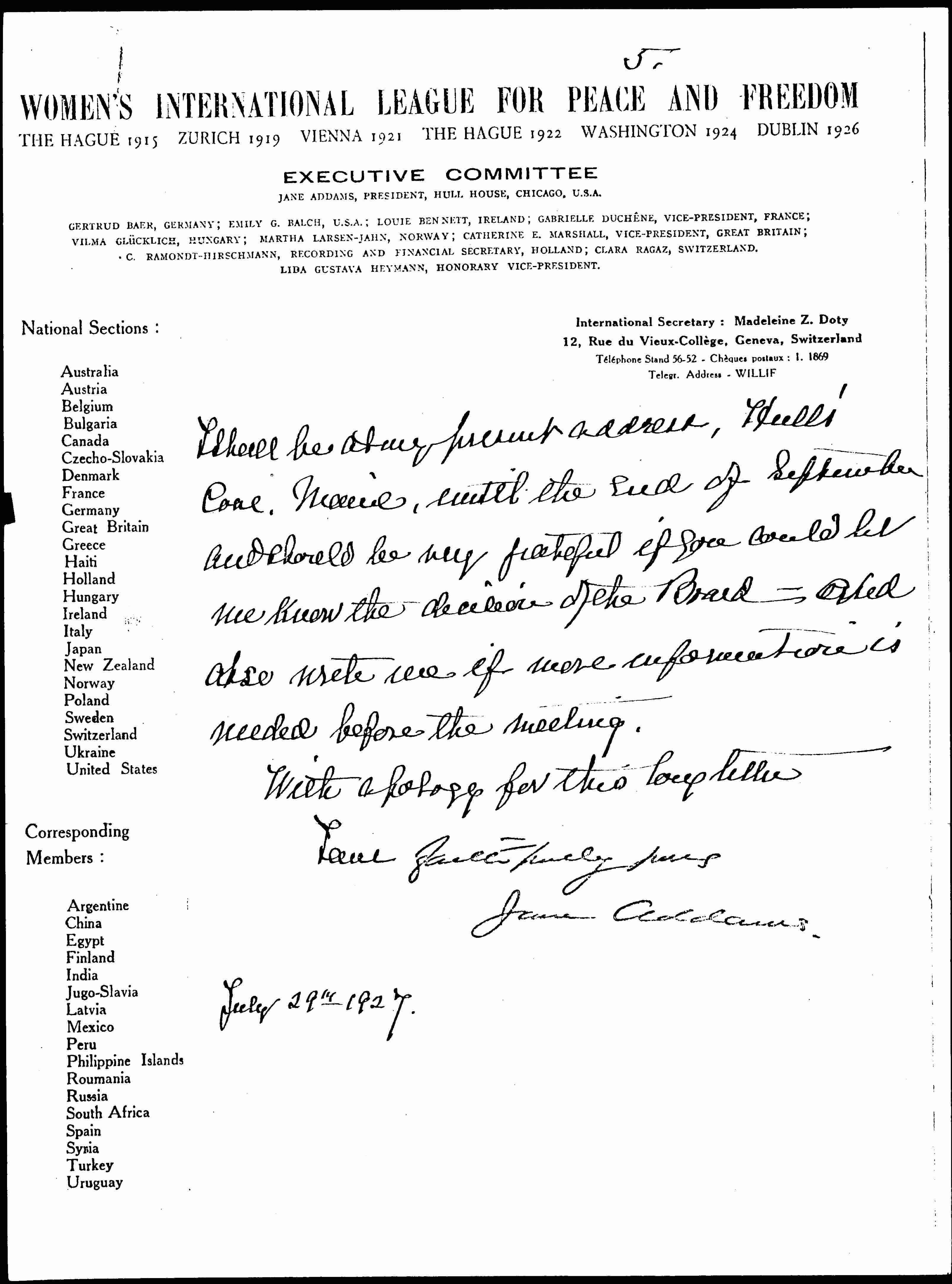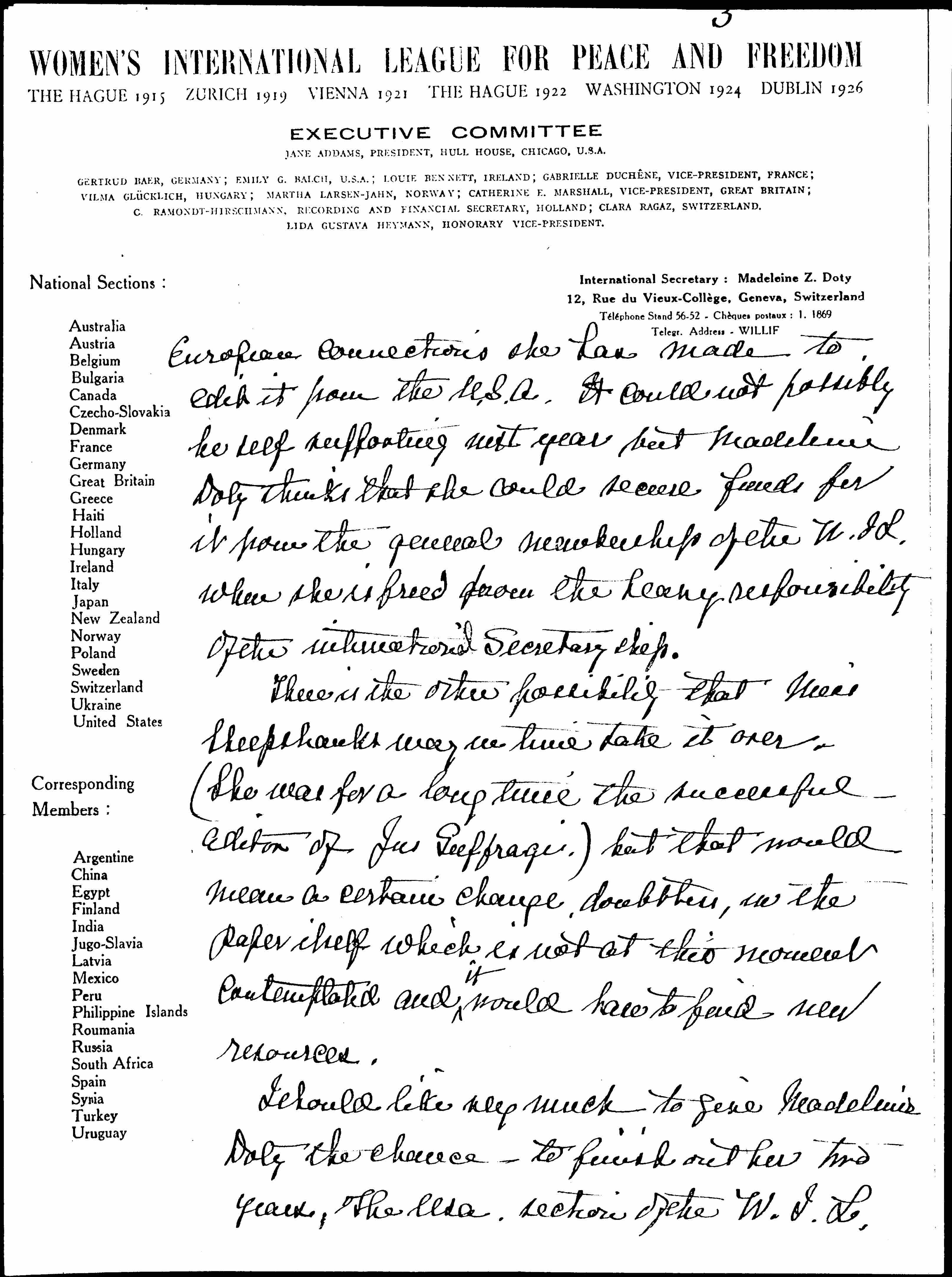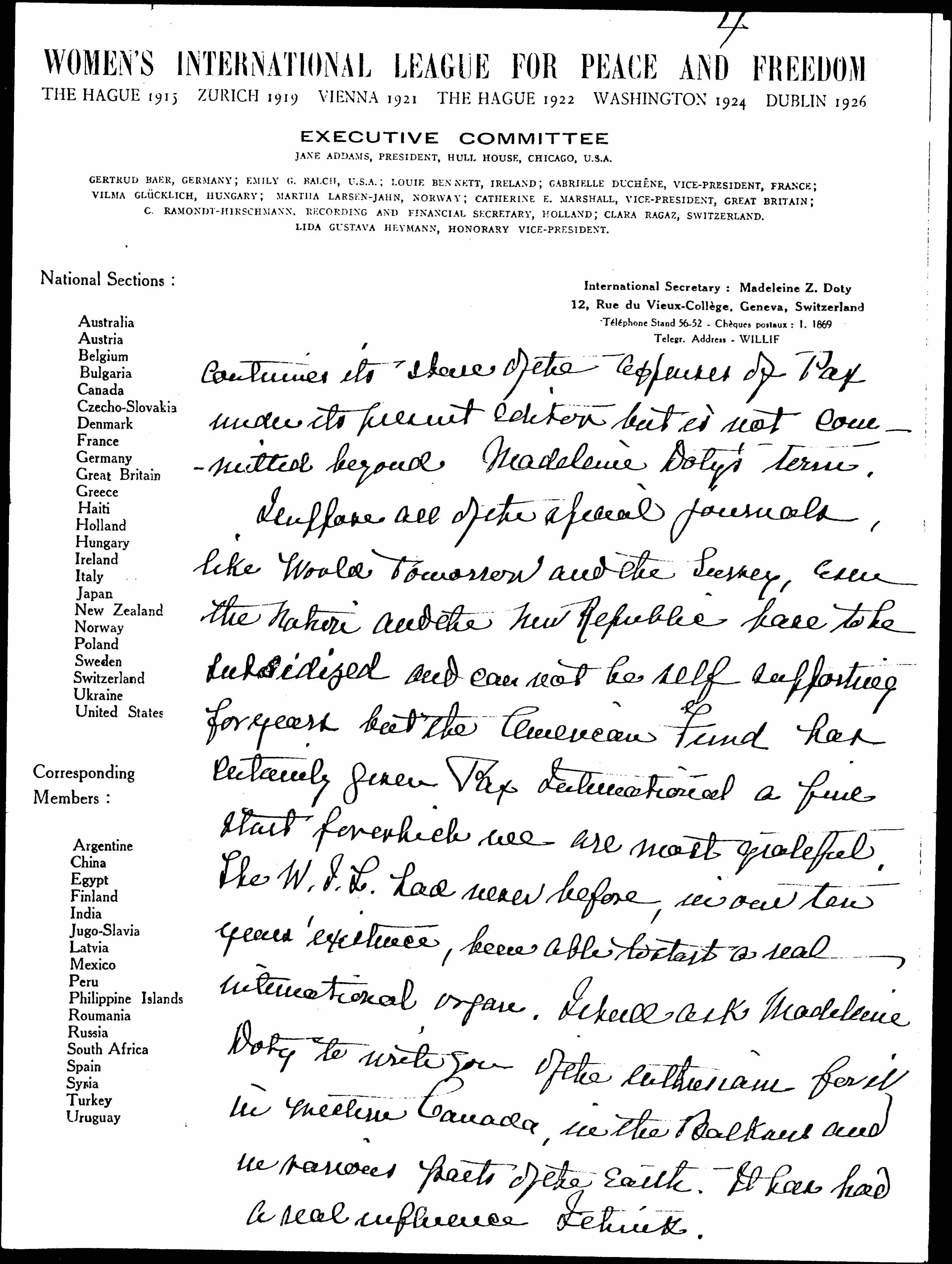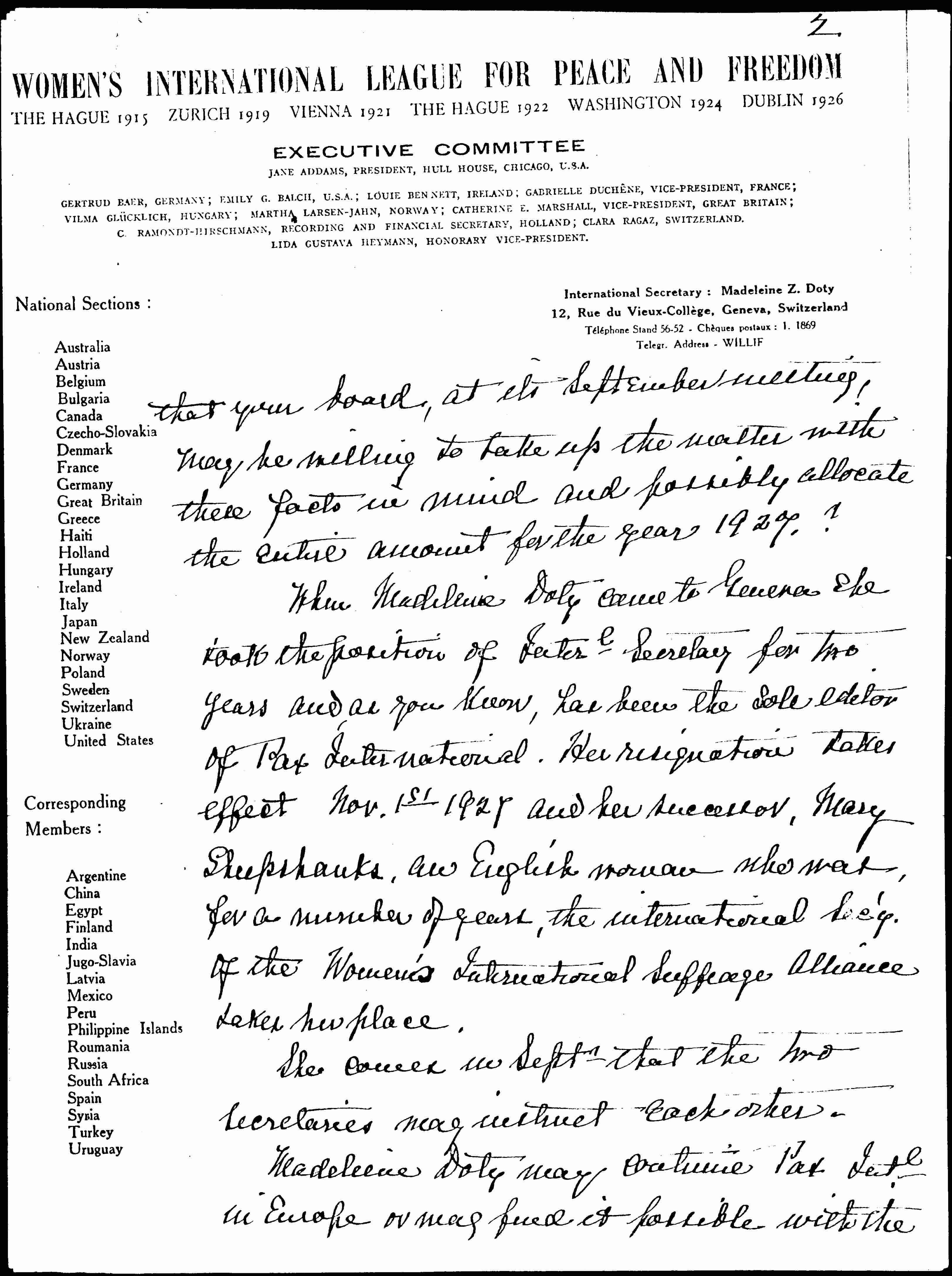 When Madeleine Doty came to Geneva she took the position of Interl Secretary for two years and, as you know, has been the sole editor of Pax International. Her resignation takes effect Nov. 1st 1927 and her successor, Mary Sheepshanks, an English woman who was, for a number of years, the international Sec'y of the Women's International Suffrage Alliance takes her place.