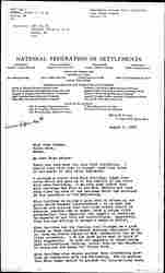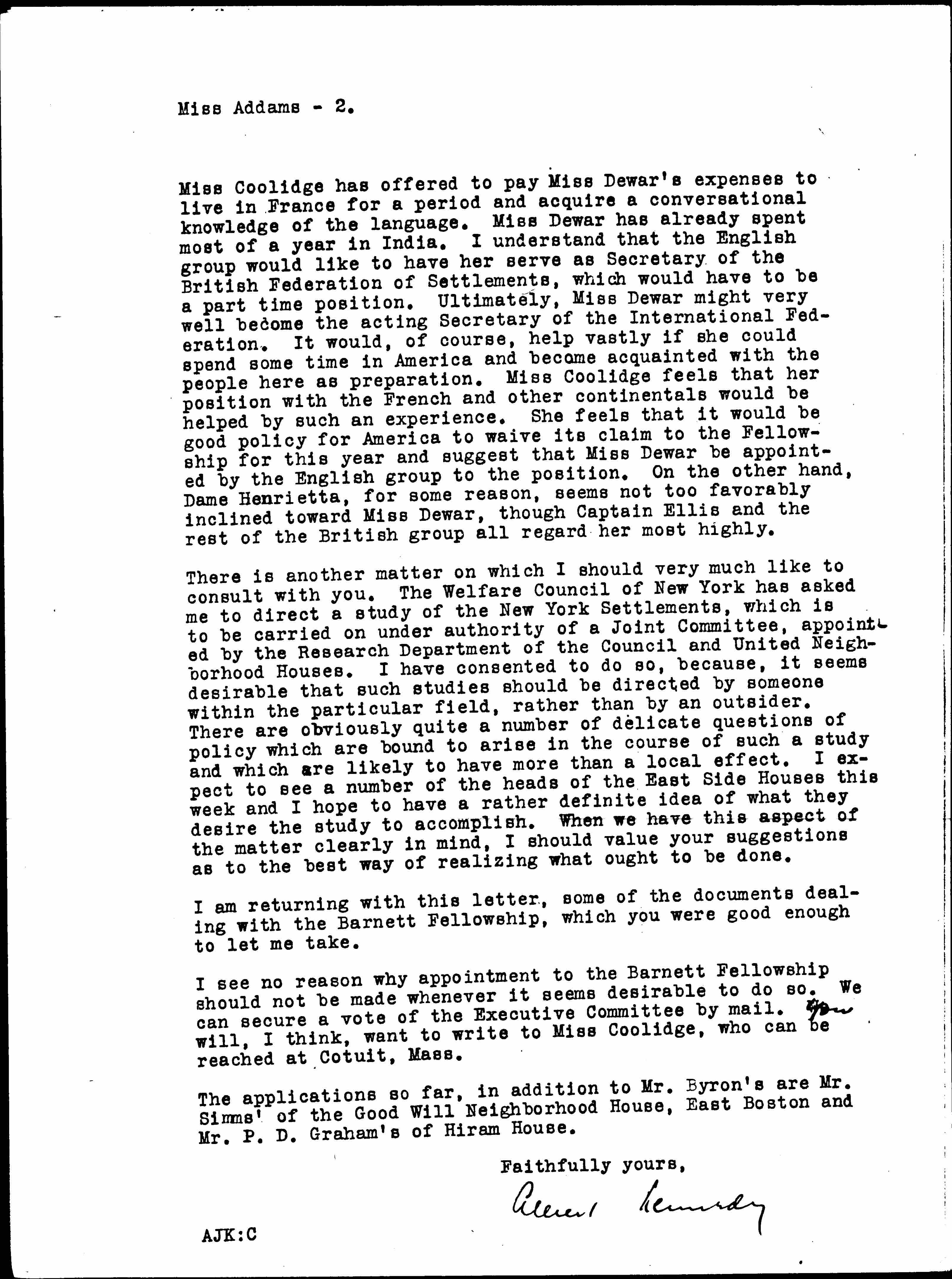 Miss Coolidge also raises another very interesting question in connection with the Fellowship. She is anxious that Miss Dewar should be groomed for international work. [page 2] Miss Coolidge has offered to pay Miss Dewar's expenses to live in France for a period and acquire a conversational knowledge of the language. Miss Dewar has already spent most of a year in India. I understand that the English group would like to have her serve as Secretary of the British Federation of Settlements, which would have to be a part time position. Ultimately, Miss Dewar might very well become the acting Secretary of the International Federation. It would, of course, help vastly if she could spend some time in America and become acquainted with the people here as preparation. Miss Coolidge feels that her position with the French and other continentals would be helped by such an experience. She feels that it would be good policy for America to waive its claim to the Fellowship for this year and suggest that Miss Dewar be appointed by the English group to the position. On the other hand, Dame Henrietta, for some reason, seems not too favorably inclined toward Miss Dewar, though Captain Ellis and the rest of the British group all regard her most highly.