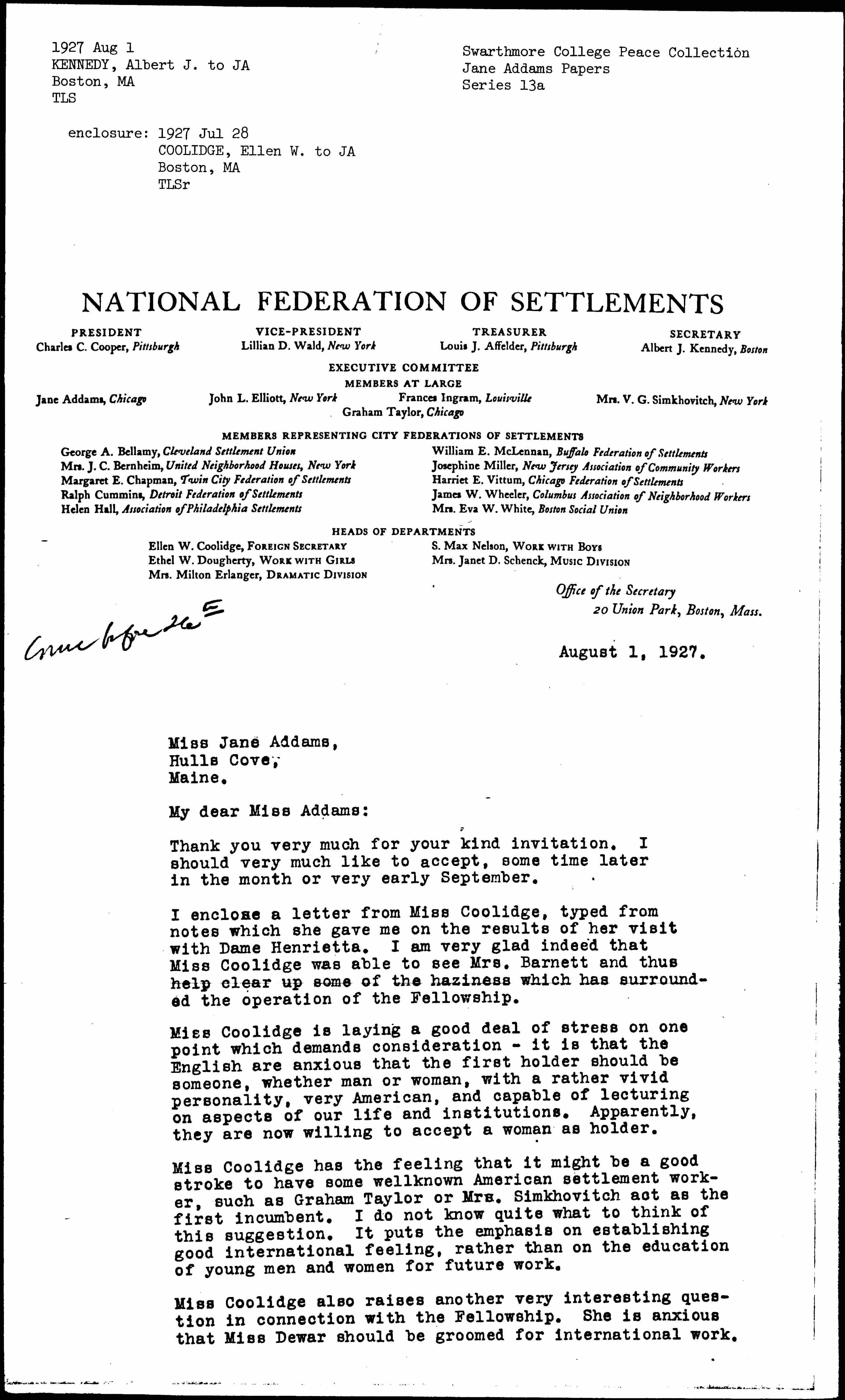 Miss Coolidge has the feeling that it might be a good stroke to have some [well-known] American settlement worker, such as Graham Taylor or Mrs. Simkhovitch act as the first incumbent. I do not know quite what to think of this suggestion. It puts the emphasis on establishing good international feeling, rather than on the education of young men and women for future work.