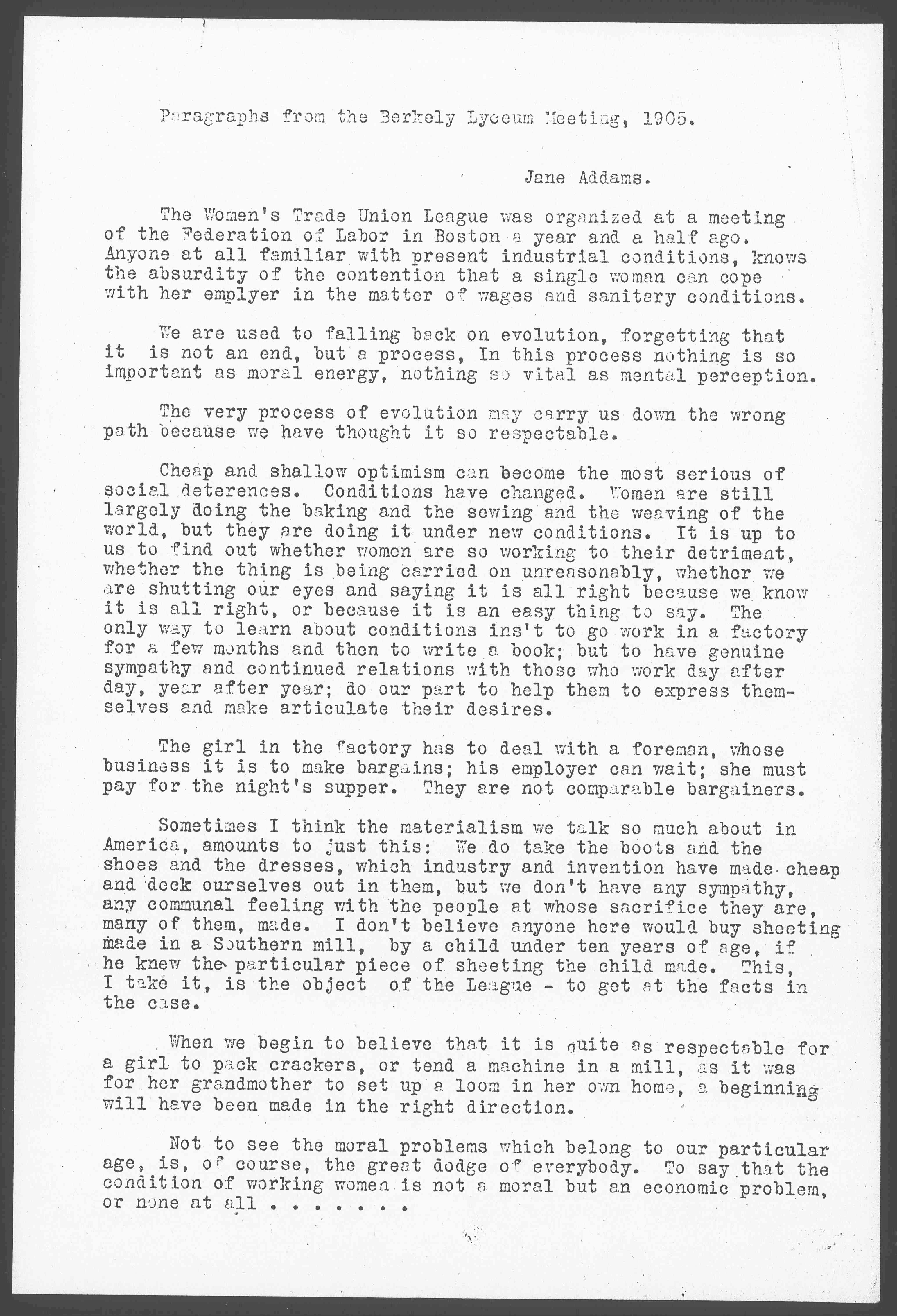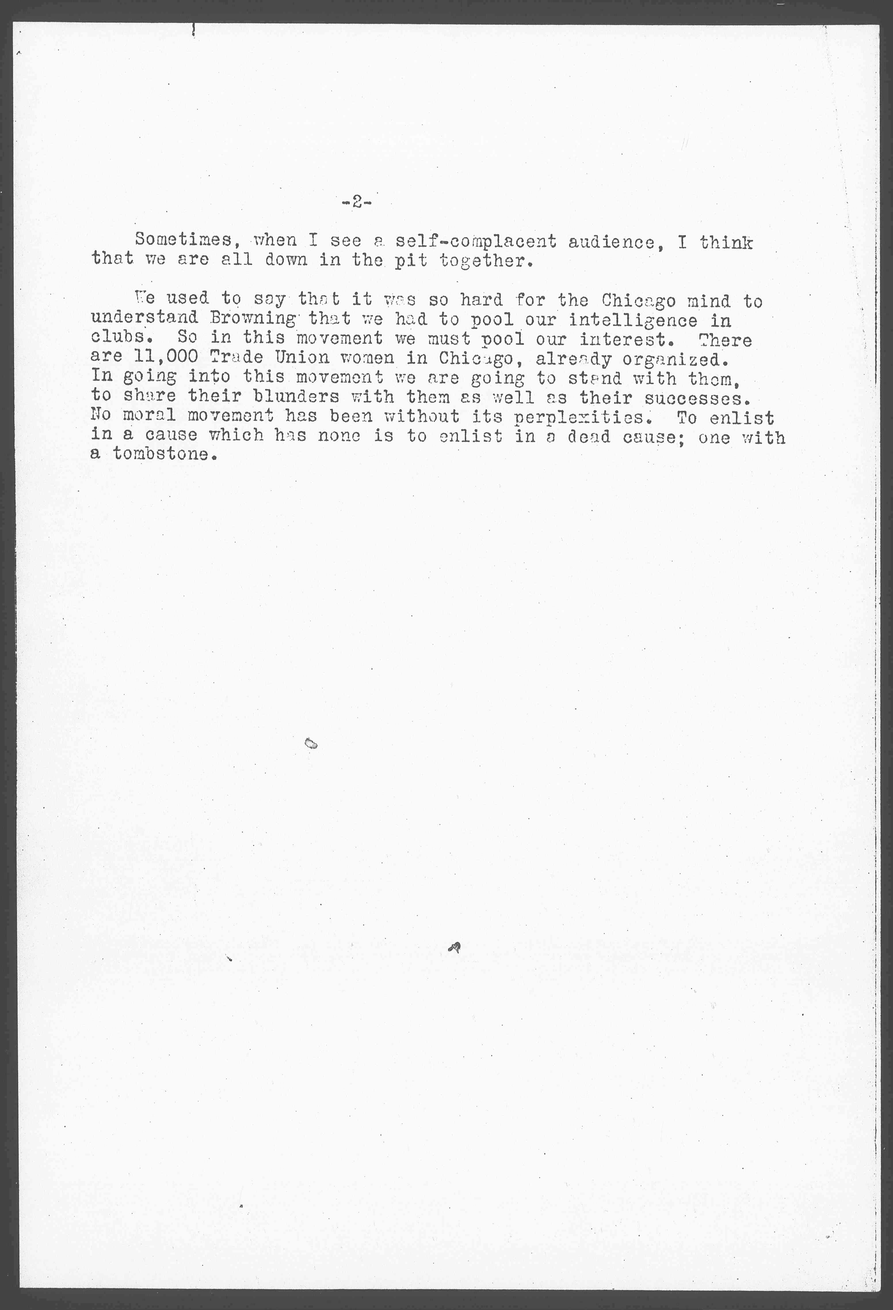 We used to say that it was so hard for the Chicago mind to understand Browning that we had to pool our intelligence in clubs. So in this movement we must pool our interest. There are 11,000 Trade Union women in Chicago, already organized. In going into this movement we are going to stand with them, to share their blunders with them as well as their successes. No moral movement has been without its perplexities. To enlist in a cause which has none is to enlist in a dead cause; one with a tombstone.