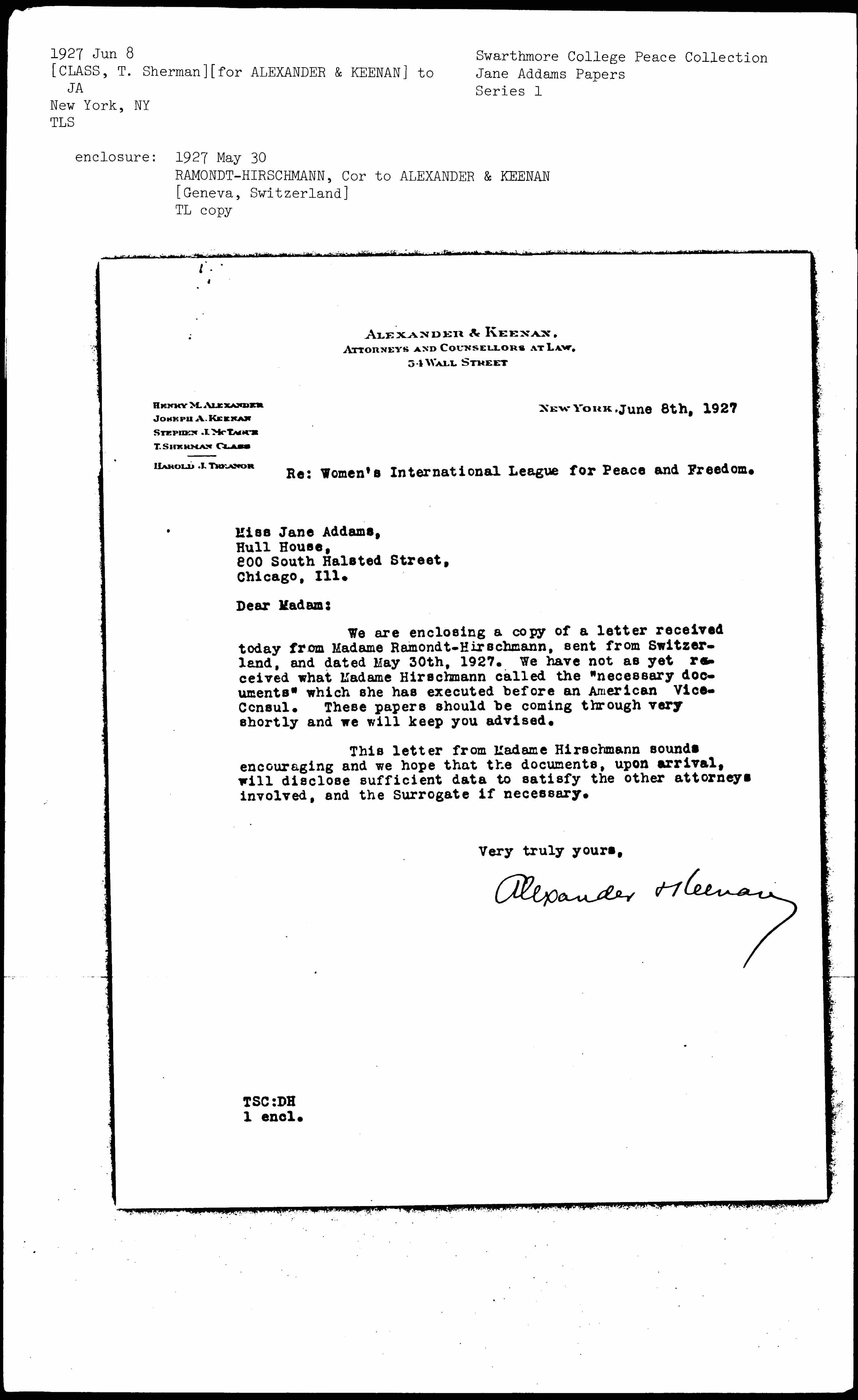We are enclosing a copy of a letter received today from Madame Ramondt-Hirschmann, sent from Switzerland, and dated May 30th, 1927. We have not as yet received what Madame Hirschmann called the "necessary documents" which she has executed before an American Vice-Consul. These papers should be coming through very shortly and we will keep you advised.