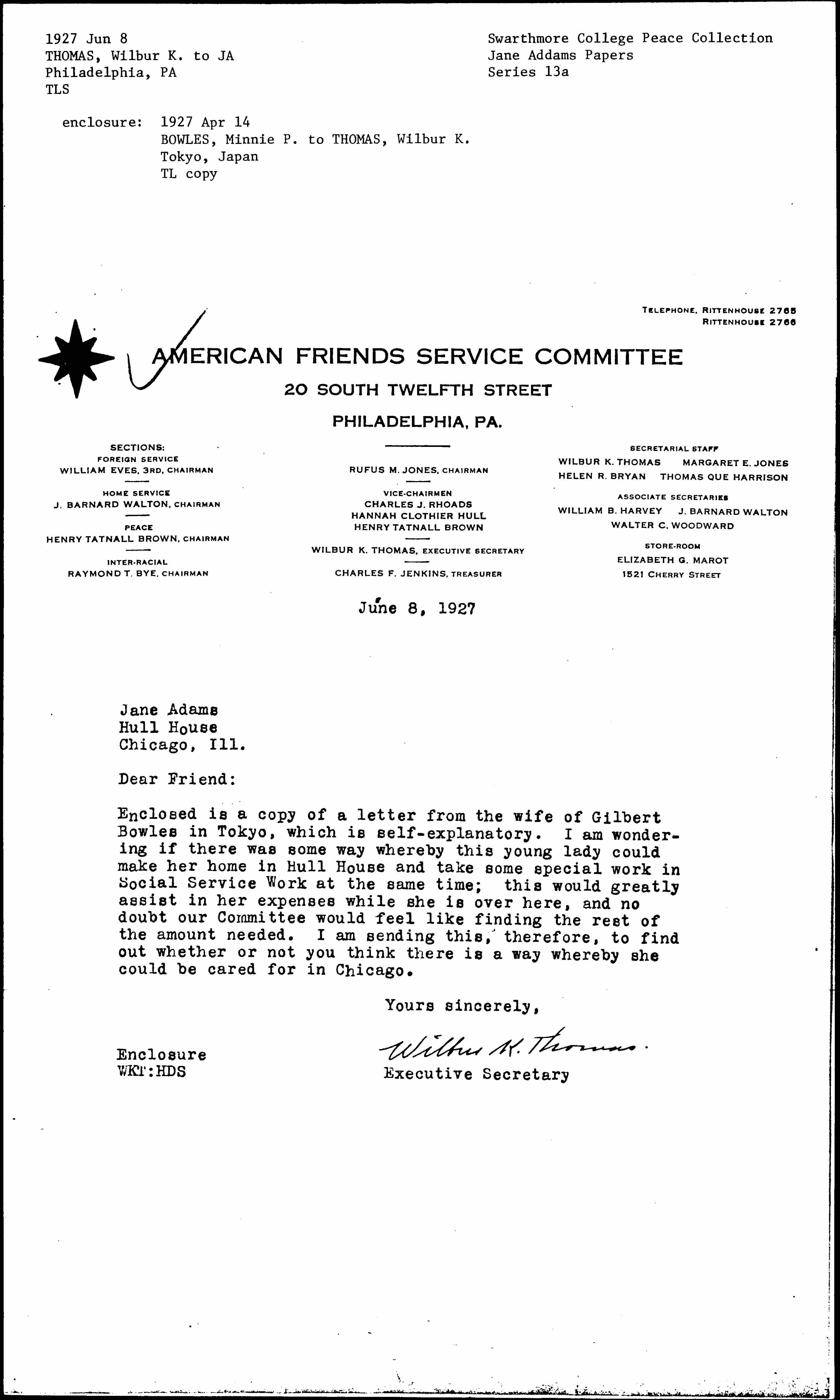 Enclosed is a copy of a letter from the wife of Gilbert Bowles in Tokyo, which is self-explanatory. I am wondering if there was some way whereby this young lady could make her home in Hull House and take some special work in Social Service Work at the same time; this would greatly assist in her expenses while she is over here, and no doubt our Committee would feel like finding the rest of the amount needed. I am sending this, therefore, to find out whether or not you think there is a way whereby she could be cared for in Chicago.