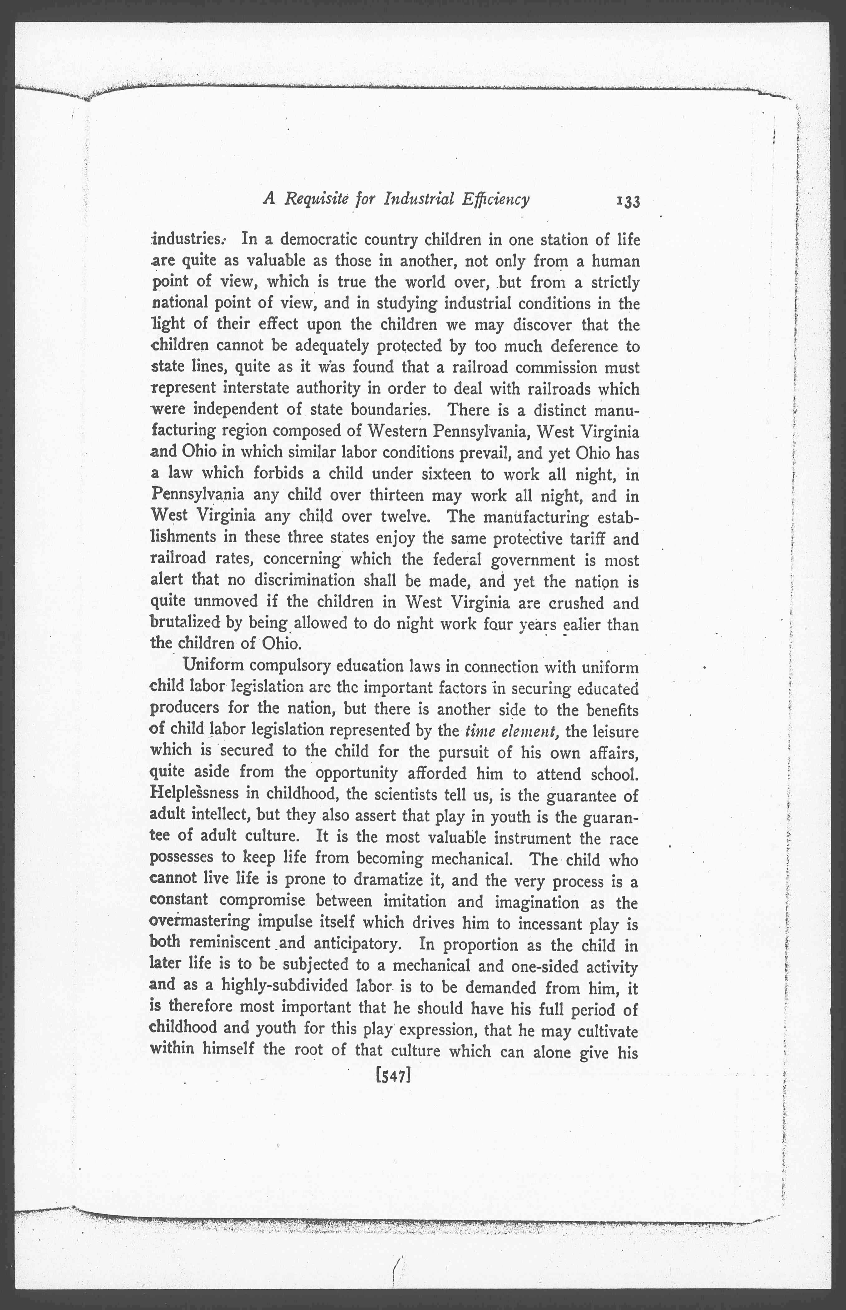 Mr. Edgar Gardner Murphy, a member of the National Child Labor Committee, has said that child labor is a national problem, even as public education is a national duty. The children of Alabama, of Rhode Island and Pennsylvania belong to the nation quite as much as they belong to each state, and the nation has an interest in the children at least in relation to its industrial efficiency, quite as it has an interest in enacting protective tariffs for the preservation of American [page 6] industries. In a democratic country children in one station of life are quite as valuable as those in another, not only from a human point of view, which is true the world over, but from a strictly national point of view, and in studying industrial conditions in the light of their effect upon the children we may discover that the children cannot be adequately protected by too much deference to state lines, quite as it was found that a railroad commission must represent interstate authority in order to deal with railroads which were independent of state boundaries. There is a distinct manufacturing region composed of Western Pennsylvania, West Virginia and Ohio in which similar labor conditions prevail, and yet Ohio has a law which forbids a child under sixteen to work all night, in Pennsylvania any child over thirteen may work all night, and in West Virginia any child over twelve. The manufacturing establishments in these three states enjoy the same protective tariff and railroad rates, concerning which the federal government is most alert that no discrimination shall be made, and yet the nation is quite unmoved if the children in West Virginia are crushed and brutalized by being allowed to do night work four years earlier than the children of Ohio.