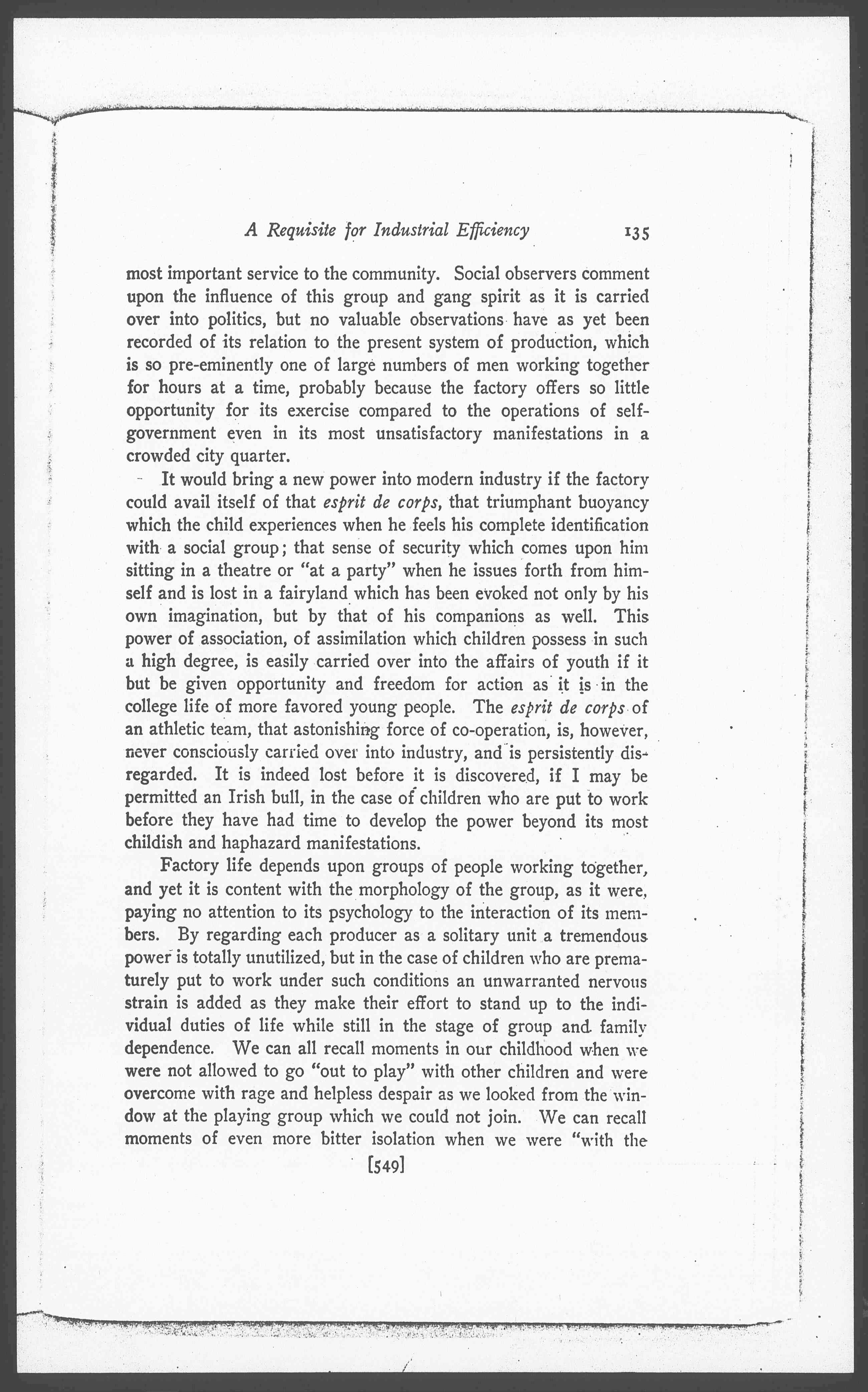 It would bring a new power into modern industry if the factory could avail itself of that esprit de corps, that triumphant buoyancy which the child experiences when he feels his complete identification with a social group; that sense of security which comes upon him sitting in a theatre or "at a party" when he issues forth from himself and is lost in a fairyland which has been evoked not only by his own imagination, but by that of his companions as well. This power of association, of assimilation which children possess in such a high degree, is easily carried over into the affairs of youth if it but be given opportunity and freedom for action as it is in the college life of more favored young people. The esprit de corps of an athletic team, that astonishing force of [cooperation], is, however, never consciously carried over into industry, and is persistently disregarded. It is indeed lost before it is discovered, if I may be permitted an Irish bull, in the case of children who are put to work before they have had time to develop the power beyond its most childish and haphazard manifestations.