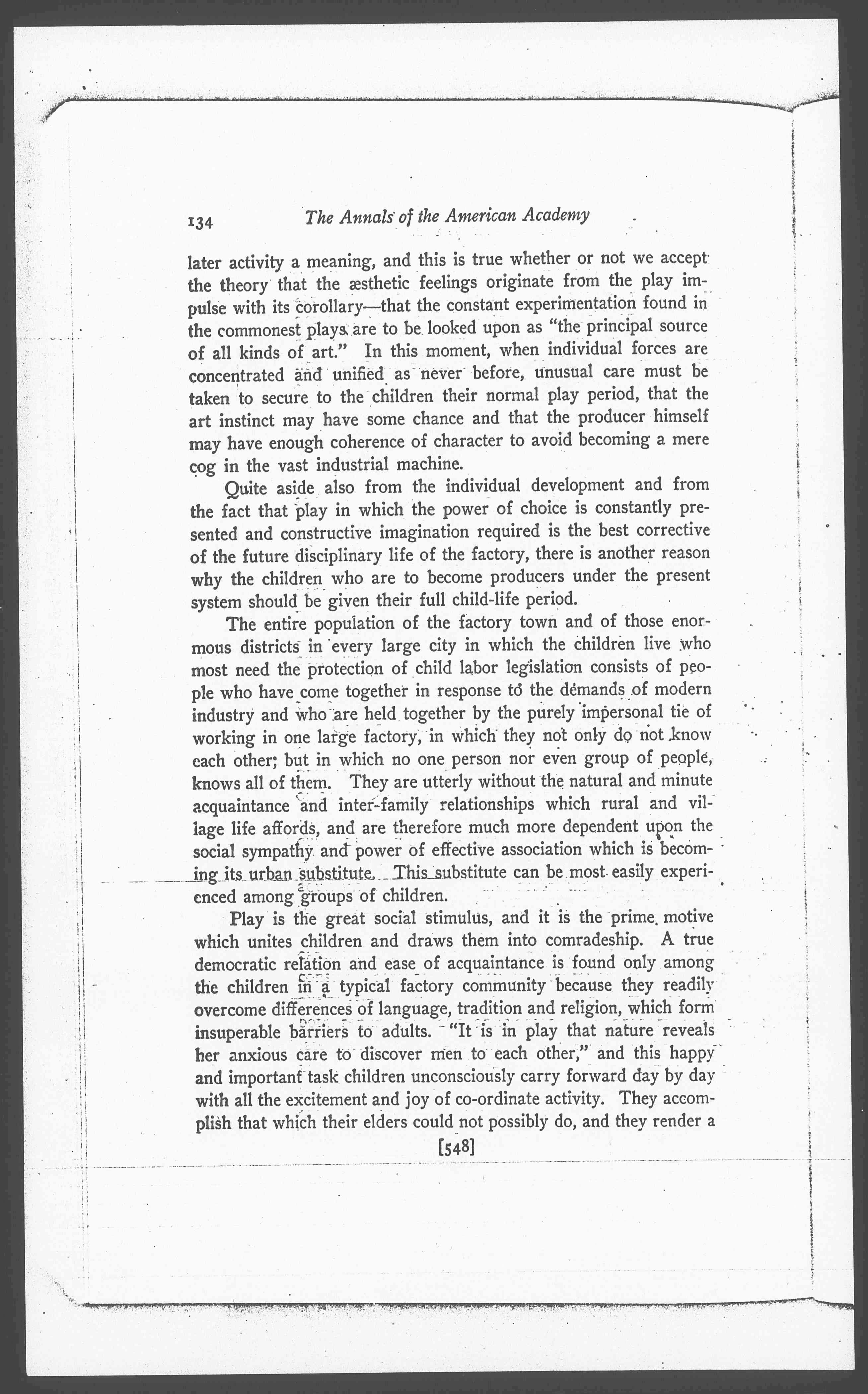 Uniform compulsory education laws in connection with uniform child labor legislation are the important factors in securing educated producers for the nation, but there is another side to the benefits of child labor legislation represented by the time element, the leisure which is secured to the child for the pursuit of his own affairs, quite aside from the opportunity afforded him to attend school. Helplessness in childhood, the scientists tell us, is the guarantee of adult intellect, but they also assert that play in youth is the guarantee of adult culture. It is the most valuable instrument the race possesses to keep life from becoming mechanical. The child who cannot live life is prone to dramatize it, and the very process is a constant compromise between imitation and imagination as the overmastering impulse itself which drives him to incessant play is both reminiscent and anticipatory. In proportion as the child in later life is to be subjected to a mechanical and one-sided activity and as a highly-subdivided labor is to be demanded from him, it is therefore most important that he should have his full period of childhood and youth for this play expression, that he may cultivate within himself the root of that culture which can alone give his [page 7] later activity a meaning, and this is true whether or not we accept the theory that the [aesthetic] feelings originate from the play impulse with its corollary-–that the constant experimentation found in the commonest plays are to be looked upon as "the principal source of all kinds of art." In this moment, when individual forces are concentrated and unified as never before, unusual care must be taken to secure to the children their normal play period, that the art instinct may have some chance and that the producer himself may have enough coherence of character to avoid becoming a mere cog in the vast industrial machine.