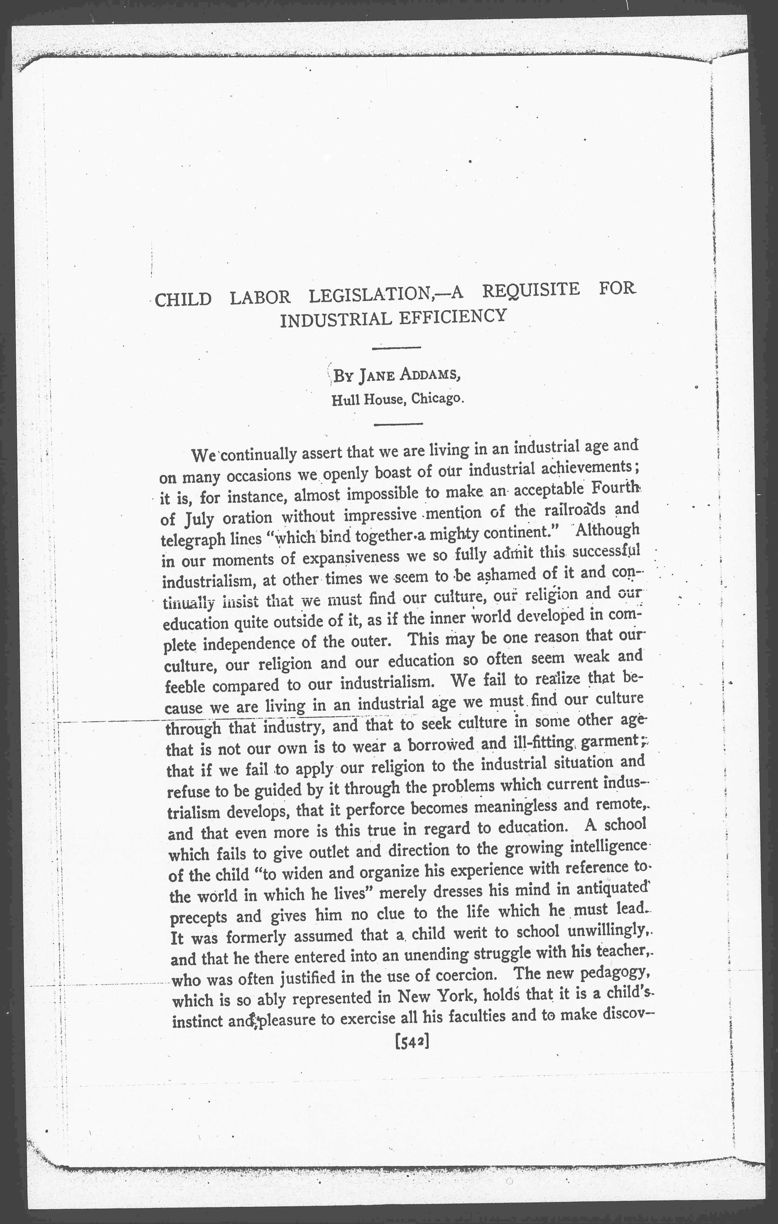 We may in time learn to be discontented with the pleas which we continually put forth on behalf of more adequate child labor legislation, demanding, as we continually do, that the child be secured his normal period of growth and his full chance to acquire such education as the state is able to provide; we may in time add to that, that we are imperiling our civilization because at the moment of its most marked materialism we wantonly sacrifice to it that eternal spirit of youth, that power of variation which alone prevents it from degenerating into a mere mechanism; that in the interests of industrial efficiency we will be obliged to extend legislation for the protection of working children.