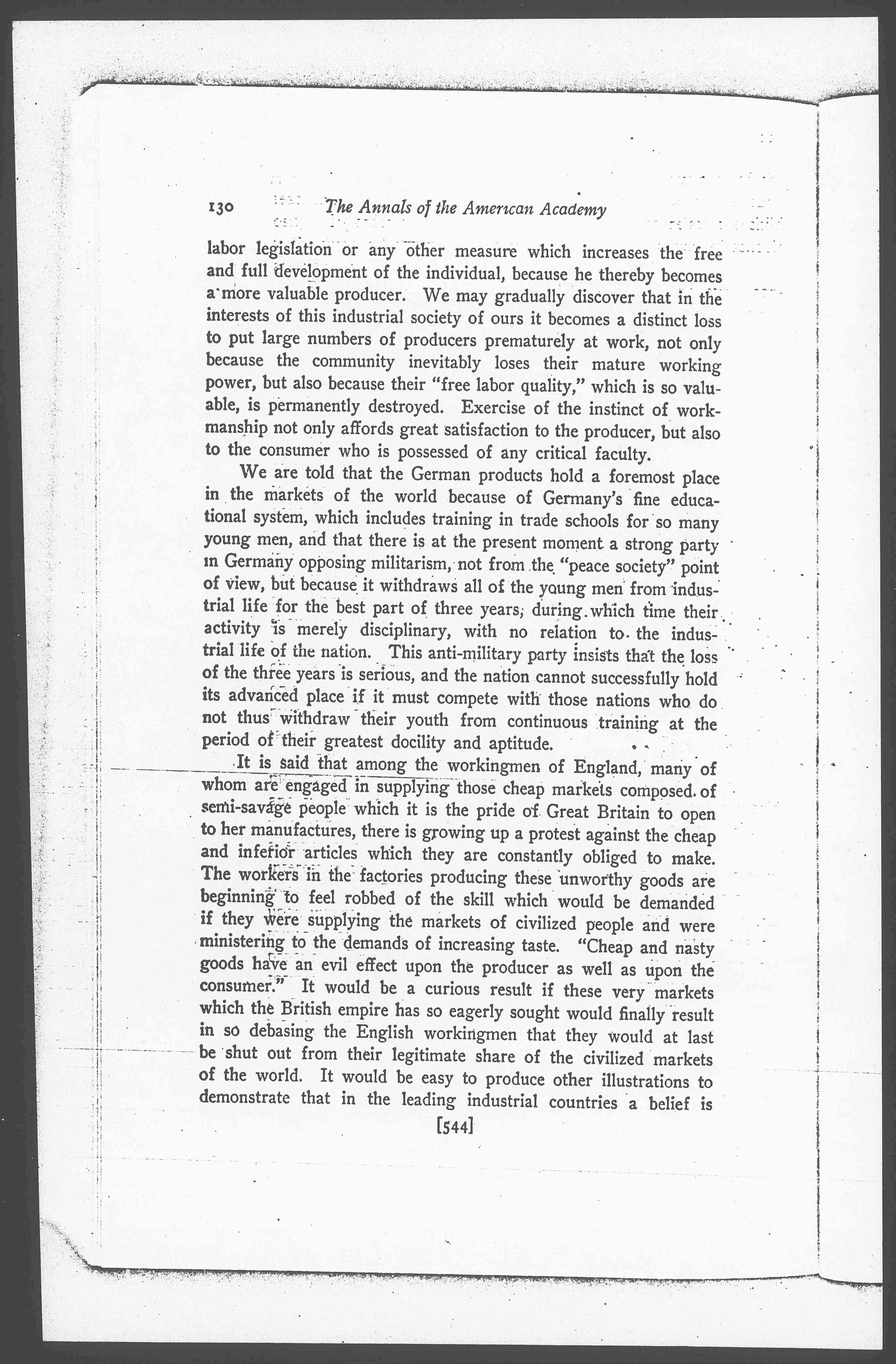 It is said that among the workingmen of England, many of whom are engaged in supplying those cheap markets composed of semi-savage people which it is the pride of Great Britain to open to her manufactures, there is growing up a protest against the cheap and inferior articles which they are constantly obliged to make. The workers in the factories producing these unworthy goods are beginning to feel robbed of the skill which would be demanded if they were supplying the markets of civilized people and were ministering to the demands of increasing taste. "Cheap and nasty goods have an evil effect upon the producer as well as upon the consumer." It would be a curious result if these very markets which the British empire has so eagerly sought would finally result in so debasing the English workingmen that they would at last be shut out from their legitimate share of the civilized markets of the world. It would be easy to produce other illustrations to demonstrate that in the leading industrial countries a belief is [page 4] slowly developing that the workman himself is the chief asset, and that the intelligent interest of skilled men, that power of self-direction and [cooperation] which is only possible among the free born and educated, is exactly the only thing which will hold out in the markets of the world. As the foremen of factories will testify again and again, factory discipline is valuable only up to a certain point, after which they must depend upon something else if they would achieve the best results.