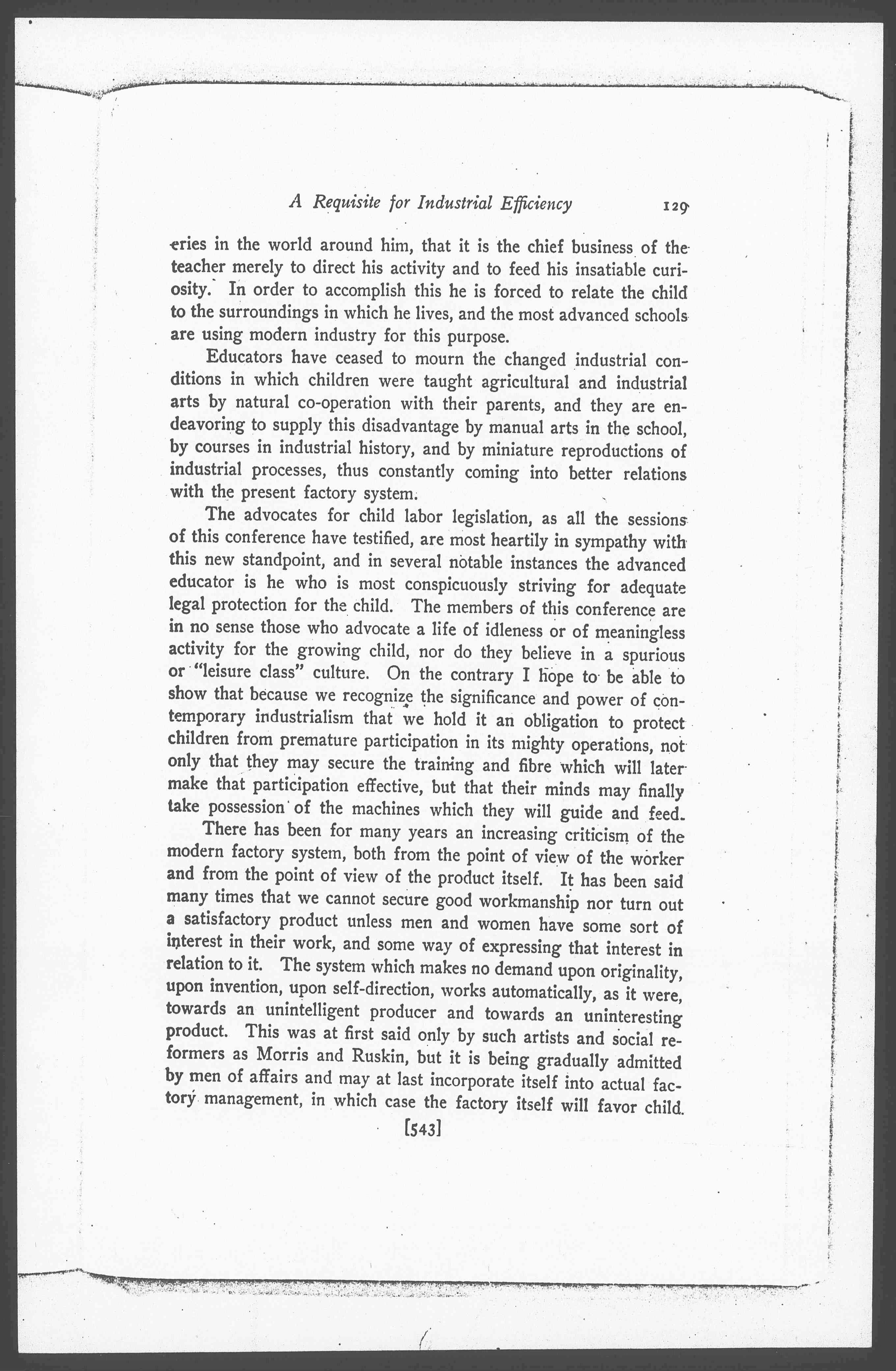 The advocates for child labor legislation, as all the sessions of this conference have testified, are most heartily in sympathy with this new standpoint, and in several notable instances the advanced educator is he who is most conspicuously striving for adequate legal protection for the child. The members of this conference are in no sense those who advocate a life of idleness or of meaningless activity for the growing child, nor do they believe in a spurious or "leisure class" culture. On the contrary I hope to be able to show that because we recognize the significance and power of contemporary industrialism that we hold it an obligation to protect children from premature participation in its mighty operations, not only that they may secure the training and fiber which will later make that participation effective, but that their minds may finally take possession of the machines which they will guide and feed.