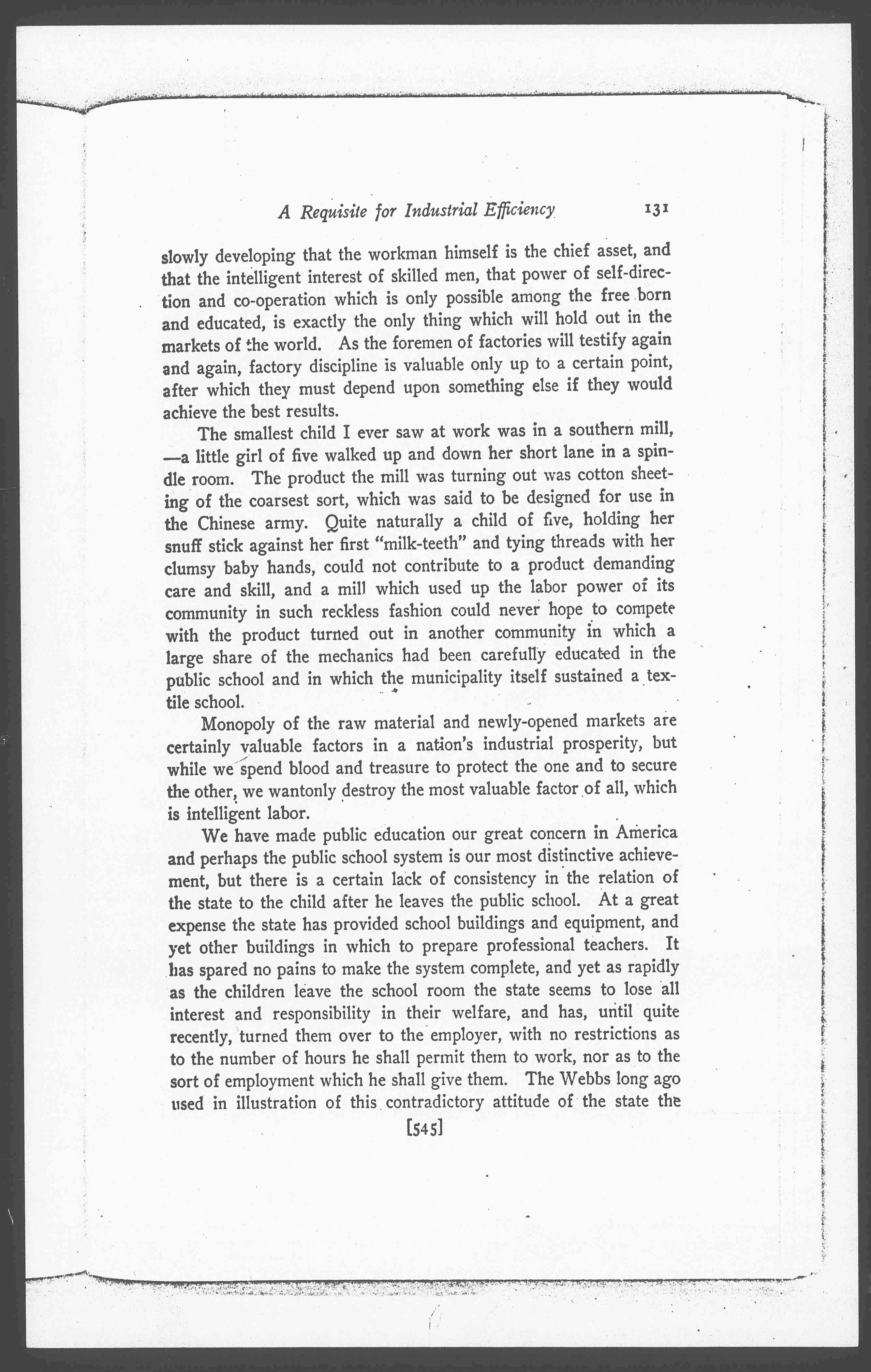 The smallest child I ever saw at work was in a southern mill,–-a little girl of five walked up and down her short lane in a spindle room. The product the mill was turning out was cotton sheeting of the coarsest sort, which was said to be designed for use in the Chinese army. Quite naturally a child of five, holding her snuff stick against her first "milk teeth" and tying threads with her clumsy baby hands, could not contribute to a product demanding care and skill, and a mill which used up the labor power of its community in such reckless fashion could never hope to compete with the product turned out in another community in which a large share of the mechanics had been carefully educated in the public school and in which the municipality itself sustained a textile school.