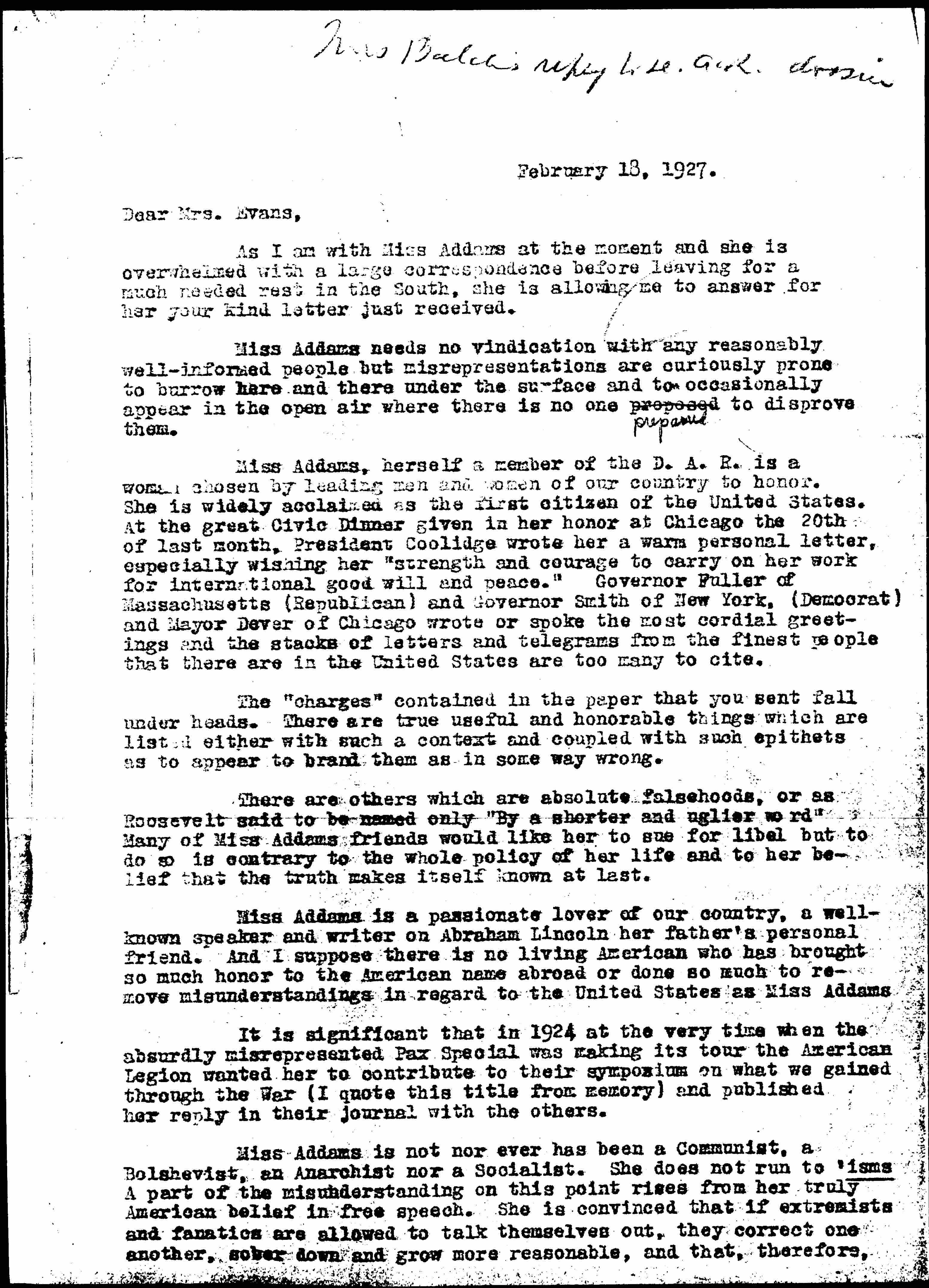 Miss Addams, herself a member of the D.A.R. is a woman chosen by leading men and women of our country to honor. She is widely acclaimed as the first citizen of the United States. At the great Civic Dinner given in her honor at Chicago the 20th of last month, President Coolidge wrote her a warm personal letter, especially wishing her "strength and courage to carry on her work for international good will and peace." Governor Fuller of Massachusetts (Republican) and Governor Smith of New York, (Democrat) and Mayor Dever of Chicago wrote or spoke the most cordial greetings and the stacks of letters and telegrams from the finest people that there are in the United States are too many to cite.