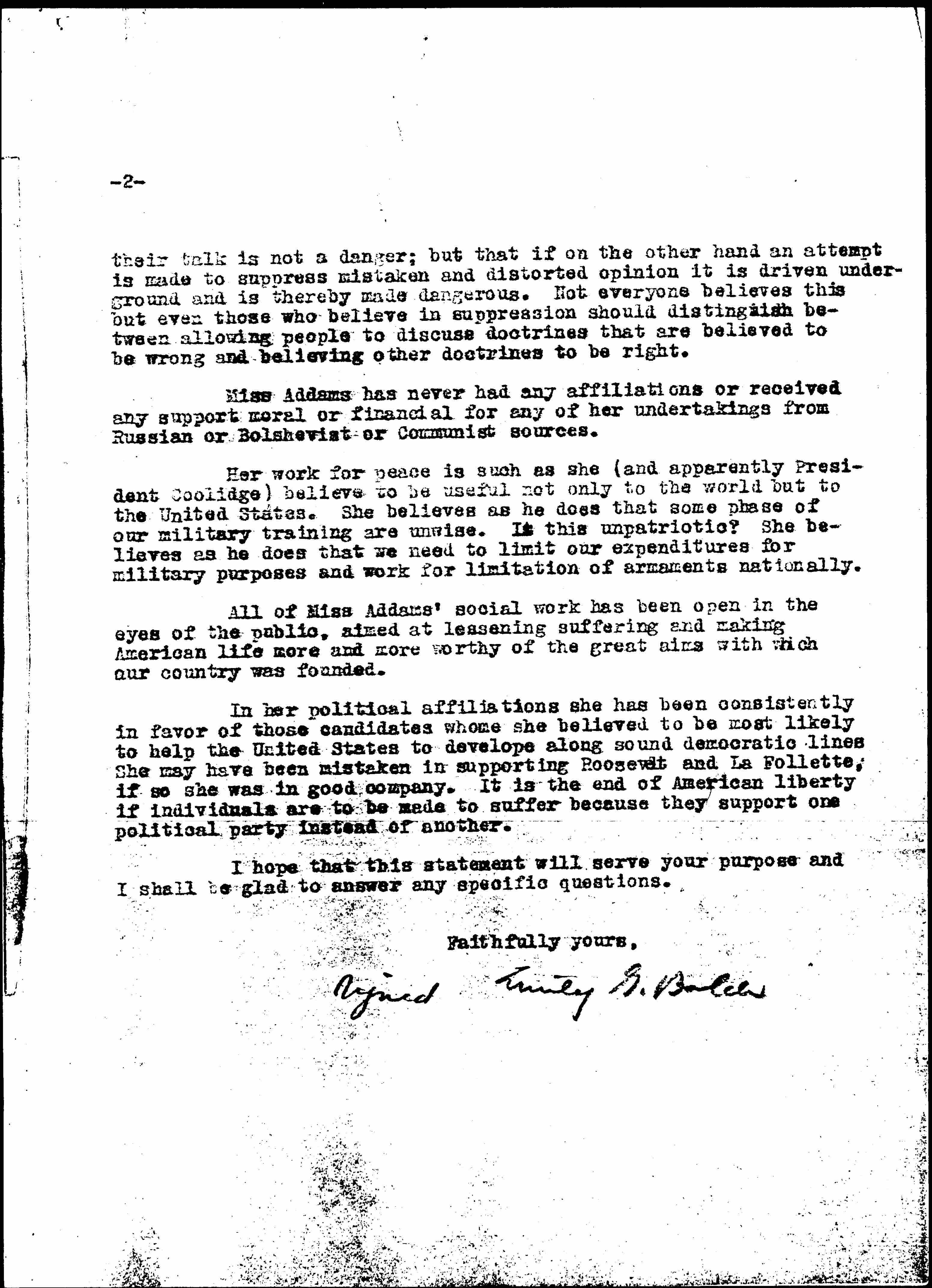 Miss Addams is not nor ever has been a Communist, a Bolshevist, an Anarchist nor a Socialist. She does not run to 'isms. A part of the misunderstanding on this point rises from her truly American belief in free speech. She is convinced that if extremists and fanatics are allowed to talk themselves out, they correct one another, sober down and grow more reasonable, and that, therefore, [page 2] their talk is not a danger; but that if on the other hand an attempt is made to suppress mistaken and distorted opinion it is driven underground and is thereby made dangerous. Not everyone believes this but even those who believe in suppression should distinguish between allowing people to discuss doctrines that are believed to be wrong and believing other doctrines to be right.