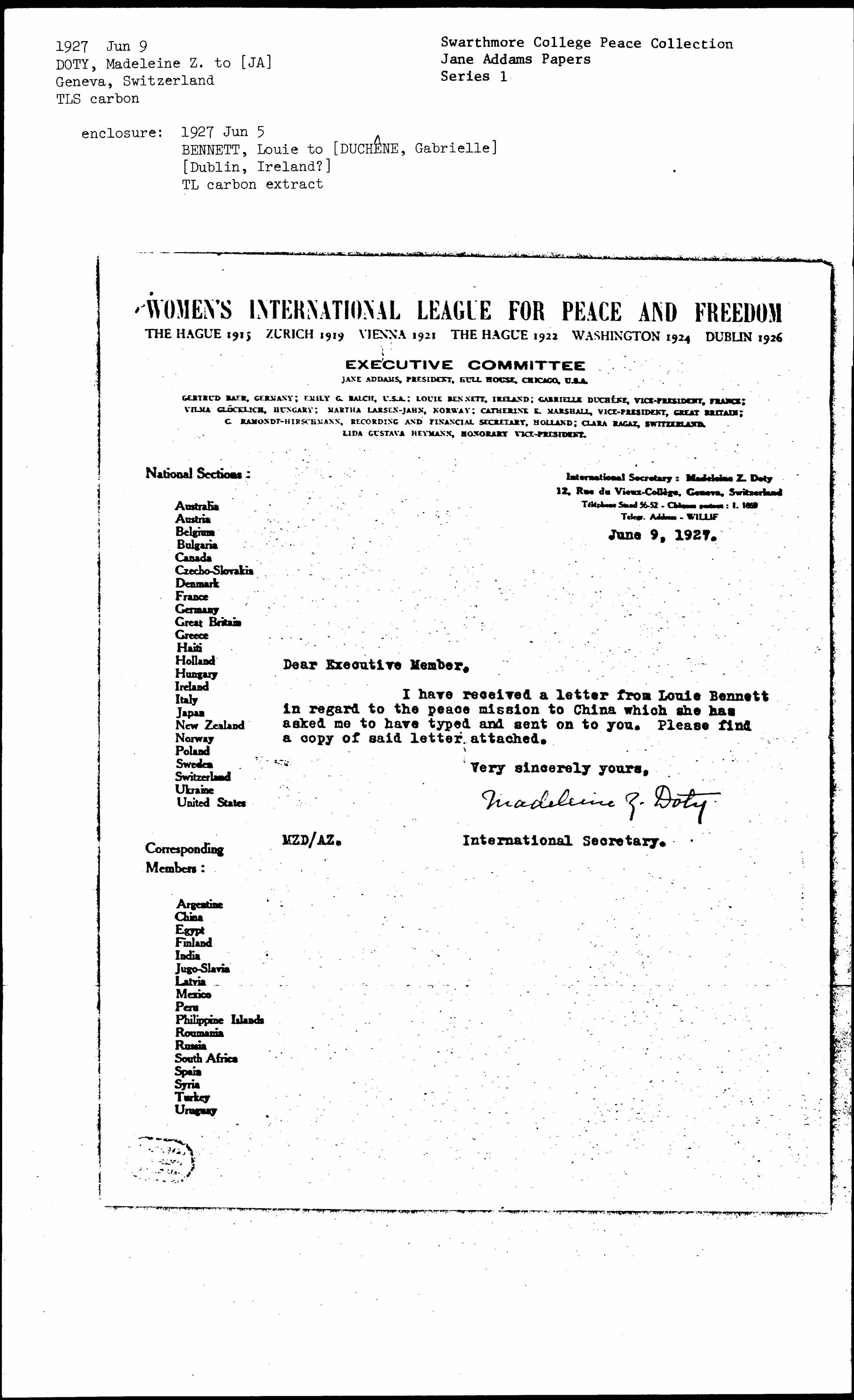 I have received a letter from Louie Bennett in regard to the peace mission to China which she has asked me to have typed and sent on to you. Please find a copy of said letter attached.