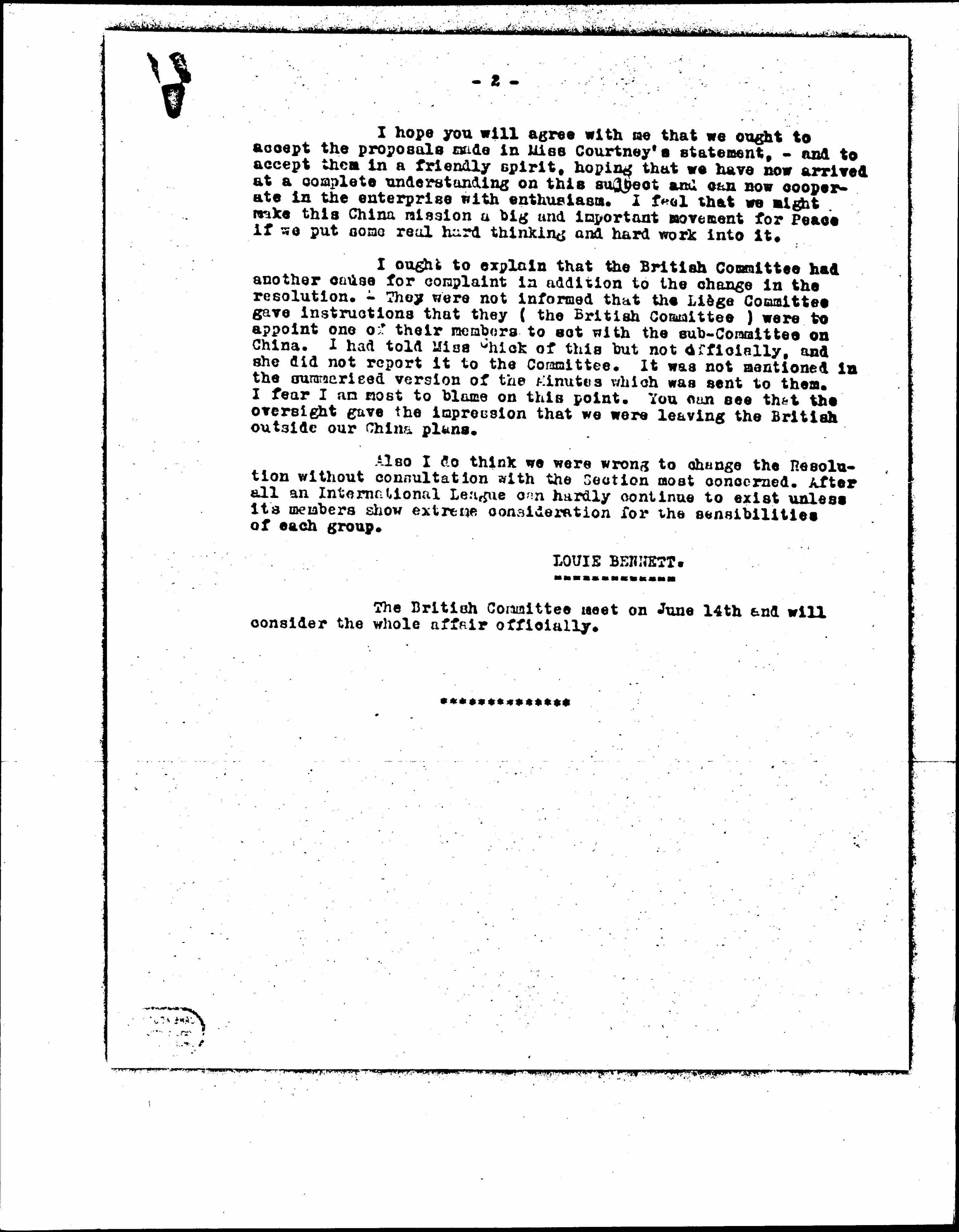 I ought to explain that the British Committee had another cause for complaint in addition to the change in the resolution. They were not informed that the Liège Committee gave instructions that they (the British Committee) were to appoint one of their members to act with the [subcommittee] on China. I had told Miss Chick of this but not officially, and she did not report it to the Committee. It was not mentioned in the [summarized] version of the Minutes which was sent to them. I fear I am most to blame on this point. You can see that the oversight gave the impression that we were leaving the British outside our China plans.