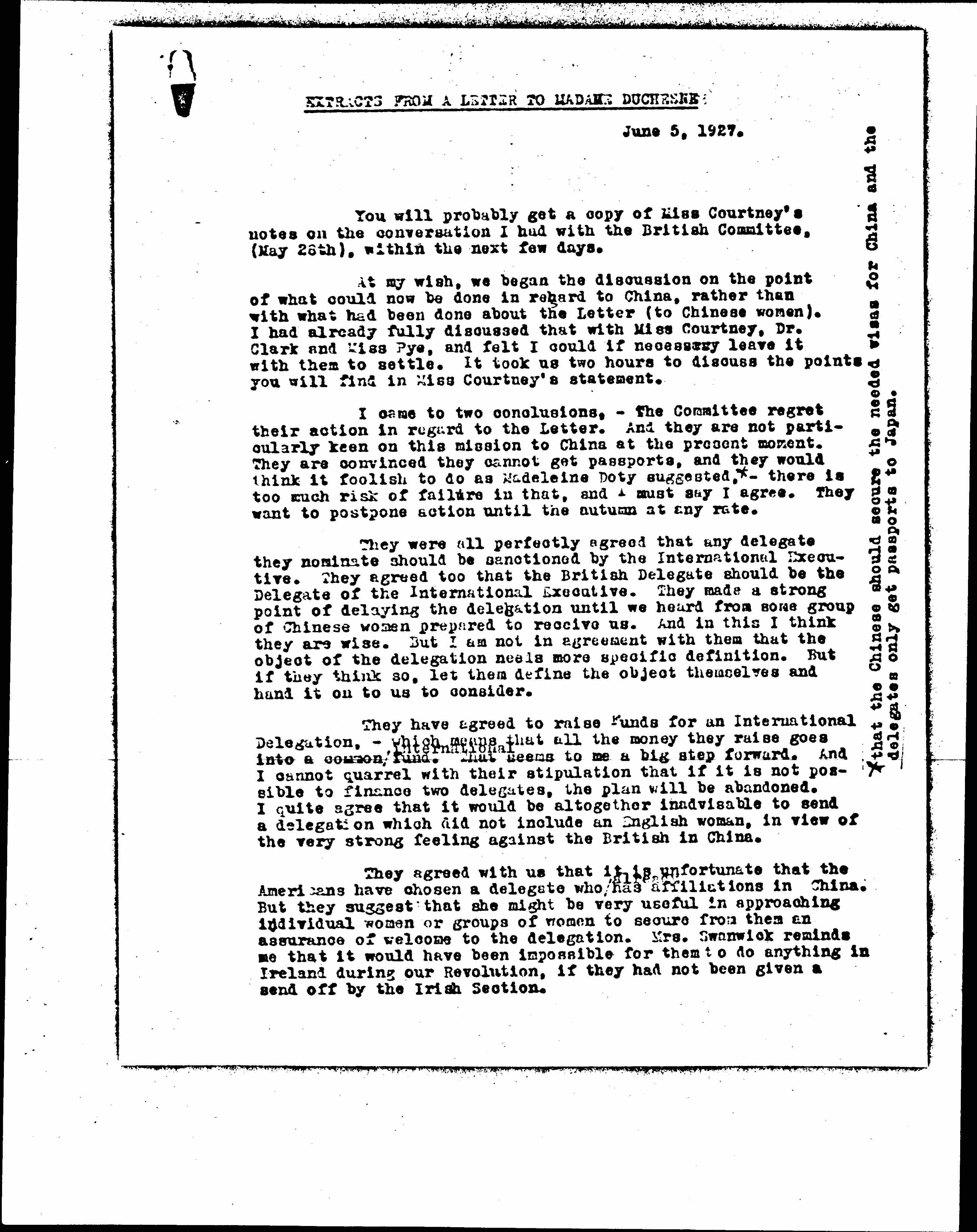 I came to two conclusions, -- the Committee regret their action in regard to the Letter. And they are not particularly keen on this mission to China at the present moment. They are convinced they cannot get passports, and they would think it foolish to do as Madeleine Doty suggested, [typed up right margin] ↑that the Chinese should secure the needed visas for China and the delegates only get passports to Japan.↓ -- There is too much risk of failure in that, and I must say I agree. They want to postpone action until the autumn at any rate.