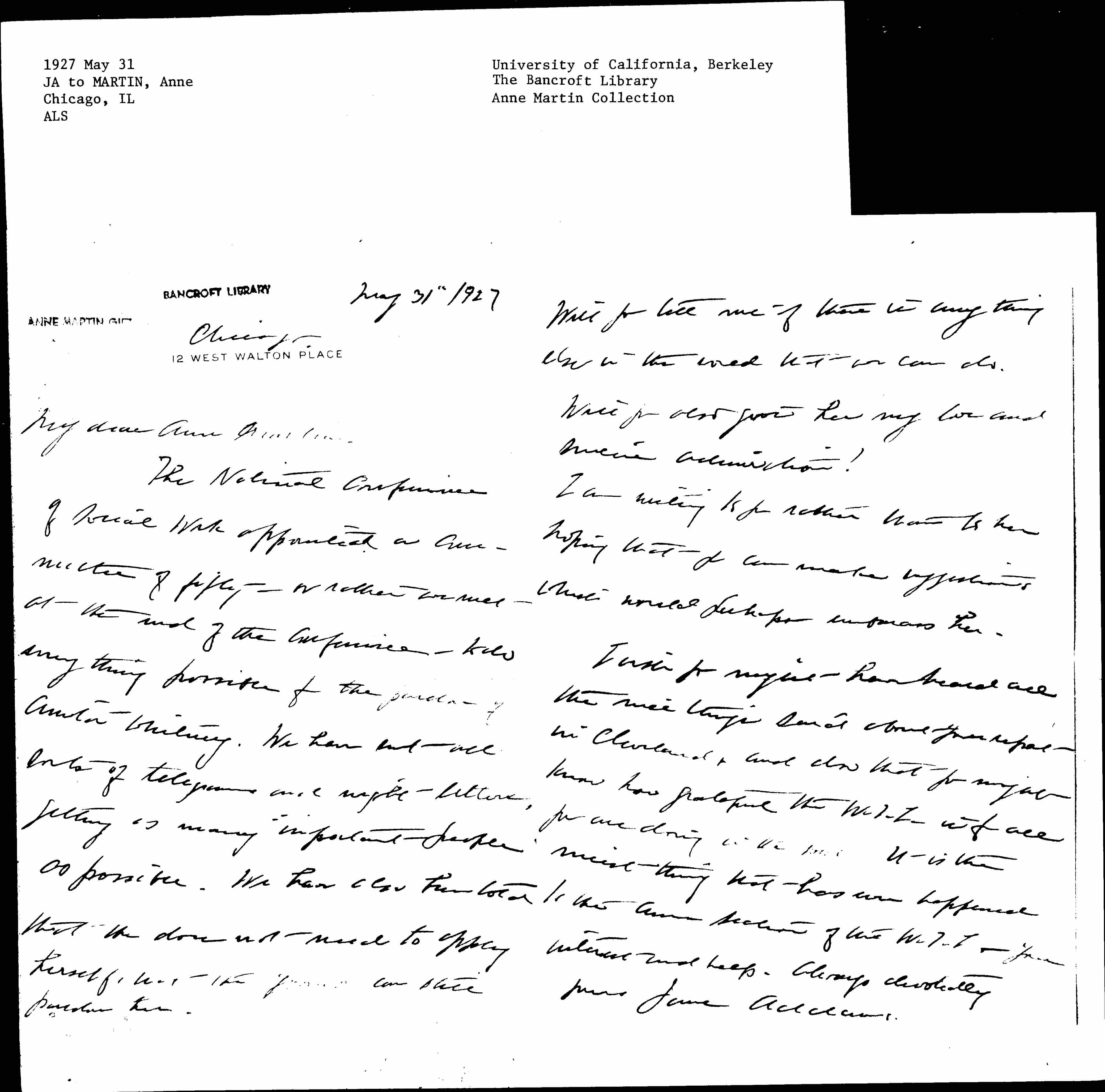 I wish you might have heard all the nice things said about your report in Cleveland, and also that you might know how grateful the W.I.L. is for all you are doing in the [world?]. It is the nicest thing that has ever happened to the [Amer] Section of the W.I.L. -- your interest and help. Always devotedly yours Jane Addams.