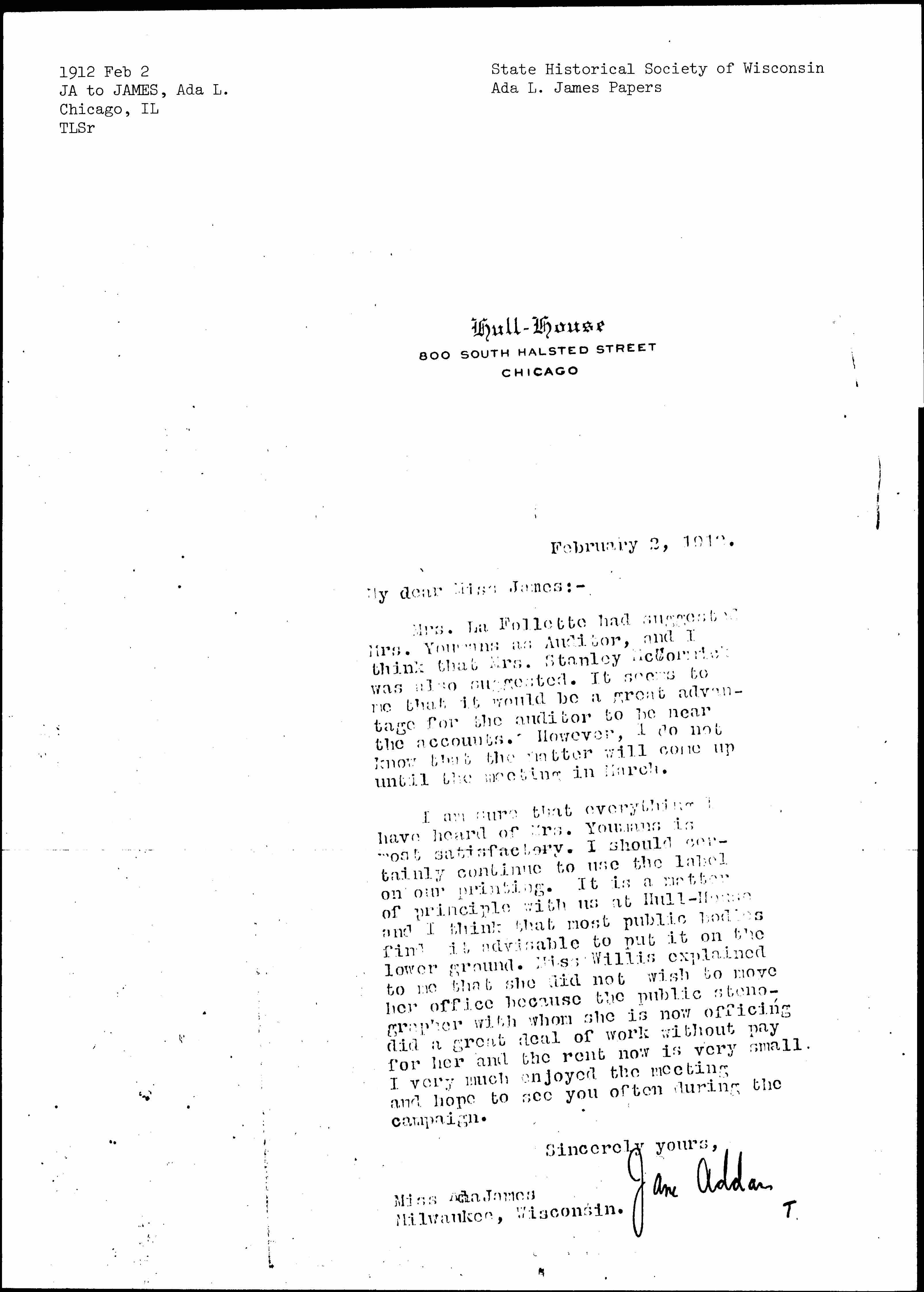 I am sure that everything I have heard of Mrs. Youmans is most satisfactory. I should certainly continue to use the label on our printing. It is a matter of principle with us at Hull-House and I think that most public bodies find it advisable to put it on the lower ground. Miss Willis explained to me that she did not wish to move her office because the public stenographer with whom she is now officing did a great deal of work without pay for her and the rent now is very small. I very much enjoyed the meeting and hope to see you often during the campaign.