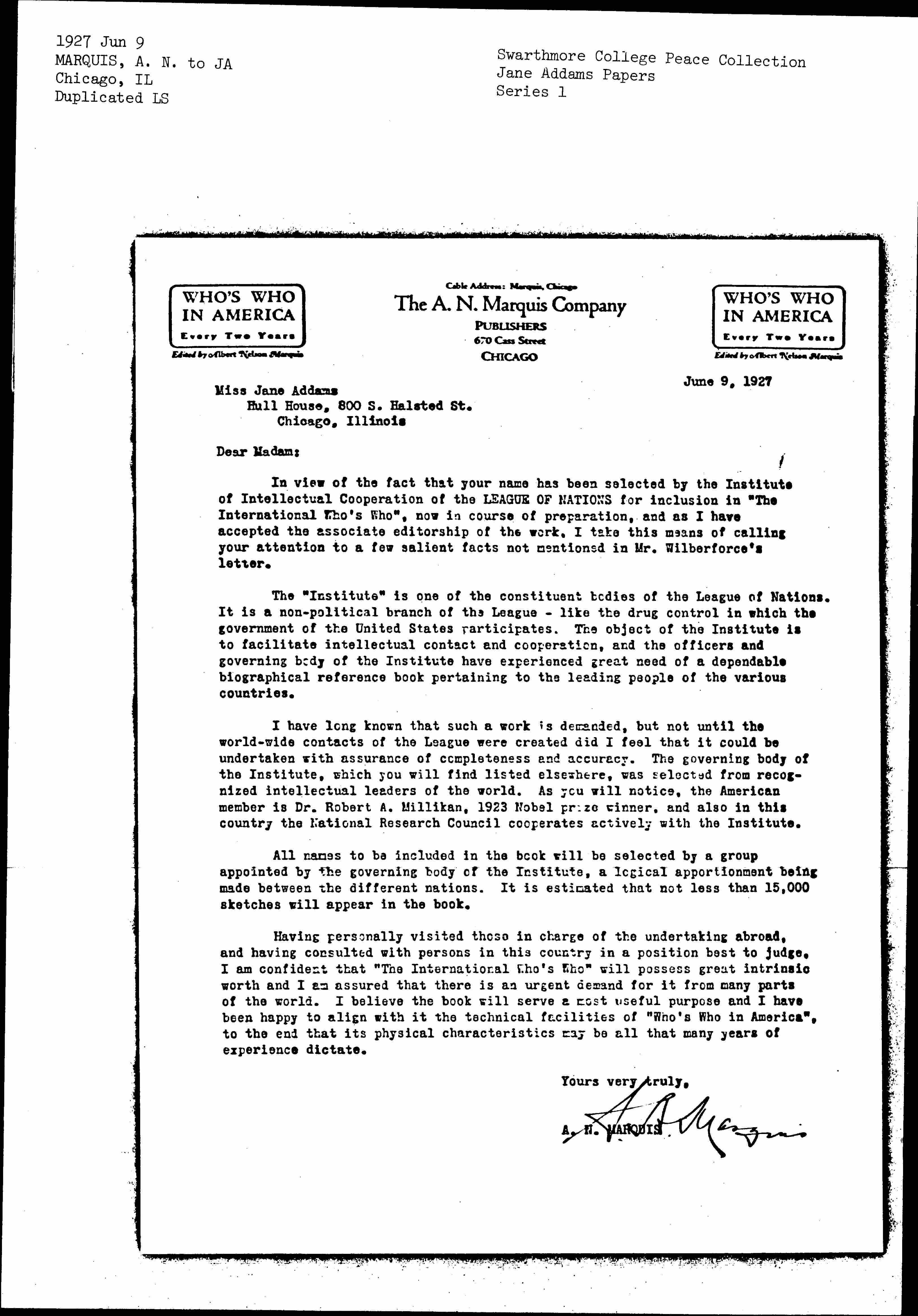 In view of the fact that your name has been selected by the Institute of Intellectual Cooperation of the LEAGUE OF NATIONS for inclusion in "The International Who's Who," now in course of preparation, and as I have accepted the associate editorship of the work, I take this means of calling your attention to a few salient facts not mentioned in Mr. Wilberforce's letter.