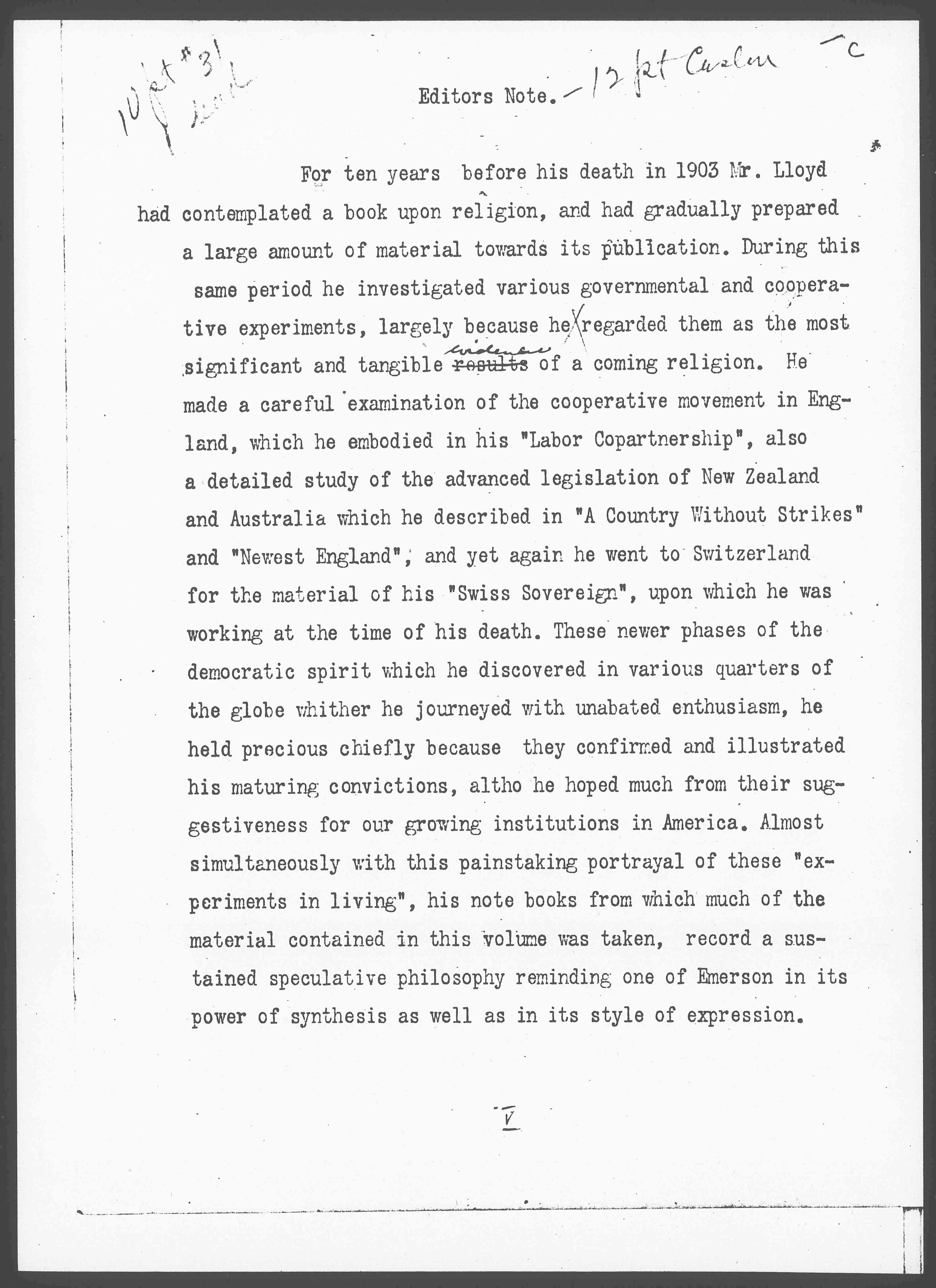 For ten years before his death in 1903 Mr. Lloyd had contemplated a book upon religion, and had gradually prepared a large amount of material towards its publication. During this same period he investigated various governmental and cooperative experiments, largely because he regarded them as the most significant and tangible results <evidence> of a coming religion. He made a careful examination of the cooperative movement in England, which he embodied in his "Labor Copartnership", also a detailed study of the advanced legislation of New Zealand and Australia which he described in "A Country Without Strikes" and "Newest England", and yet again he went to Switzerland for the material of his "Swiss Sovereign", upon which he was working at the time of his death. These newer phases of the democratic spirit which he discovered in various quarters of the globe whither he journeyed with unbated enthusiasm, he held precious chiefly because they confirmed and illustrated his maturing convictions, [although] he hoped much from their suggestiveness for our growing institutions in America. Almost simultaneously with this painstaking portrayal of these "experiments in living", his note books from which much of the material contained in this volume was taken, record a sustained speculative philosphy remindind one of Emerson in its power of synthesis as well as in its style of expression.
