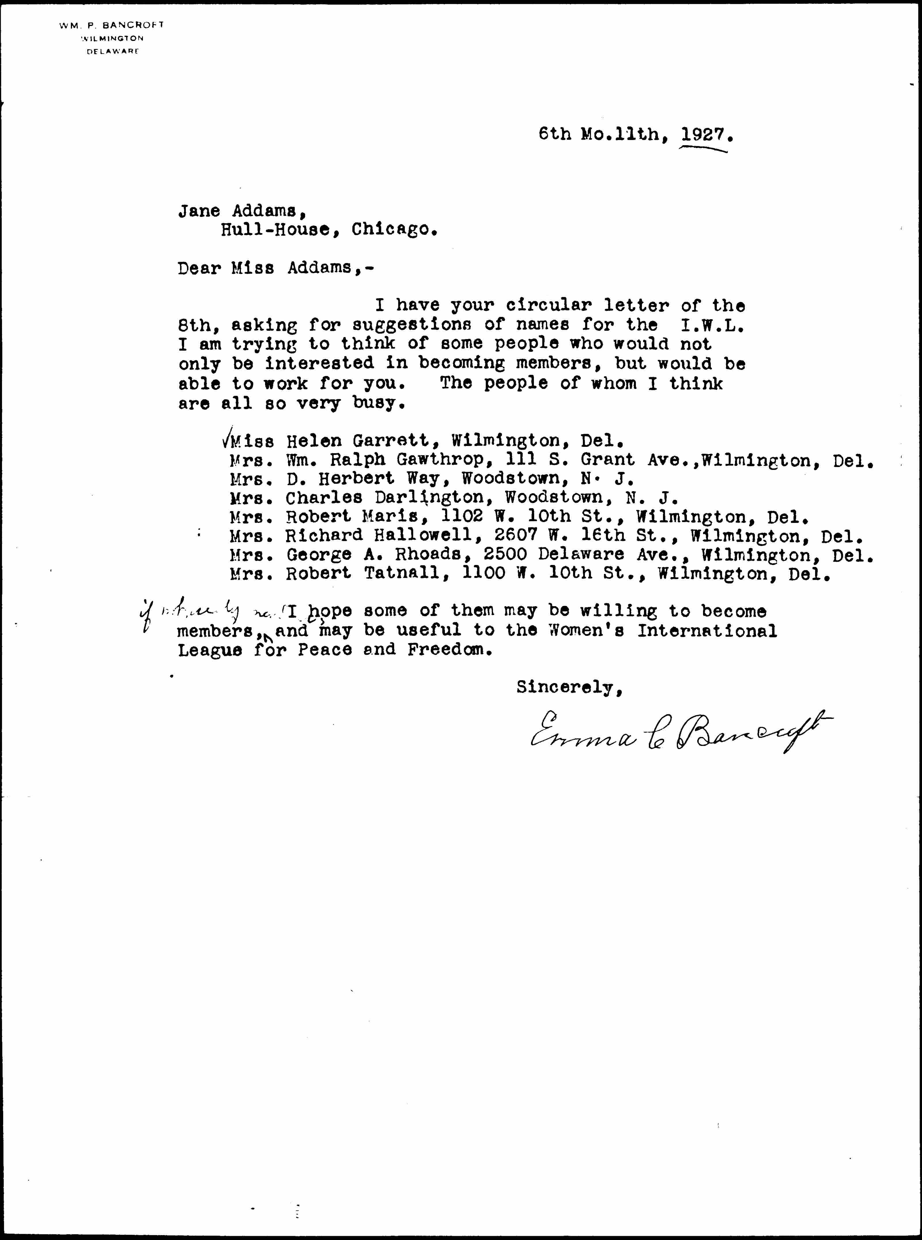 I have your circular letter of the 8th, asking for suggestions of names for the I.W.L. I am trying to think of some people who would not only be interested in becoming members, but would be able to work for you. The people of whom I think are all so very busy.