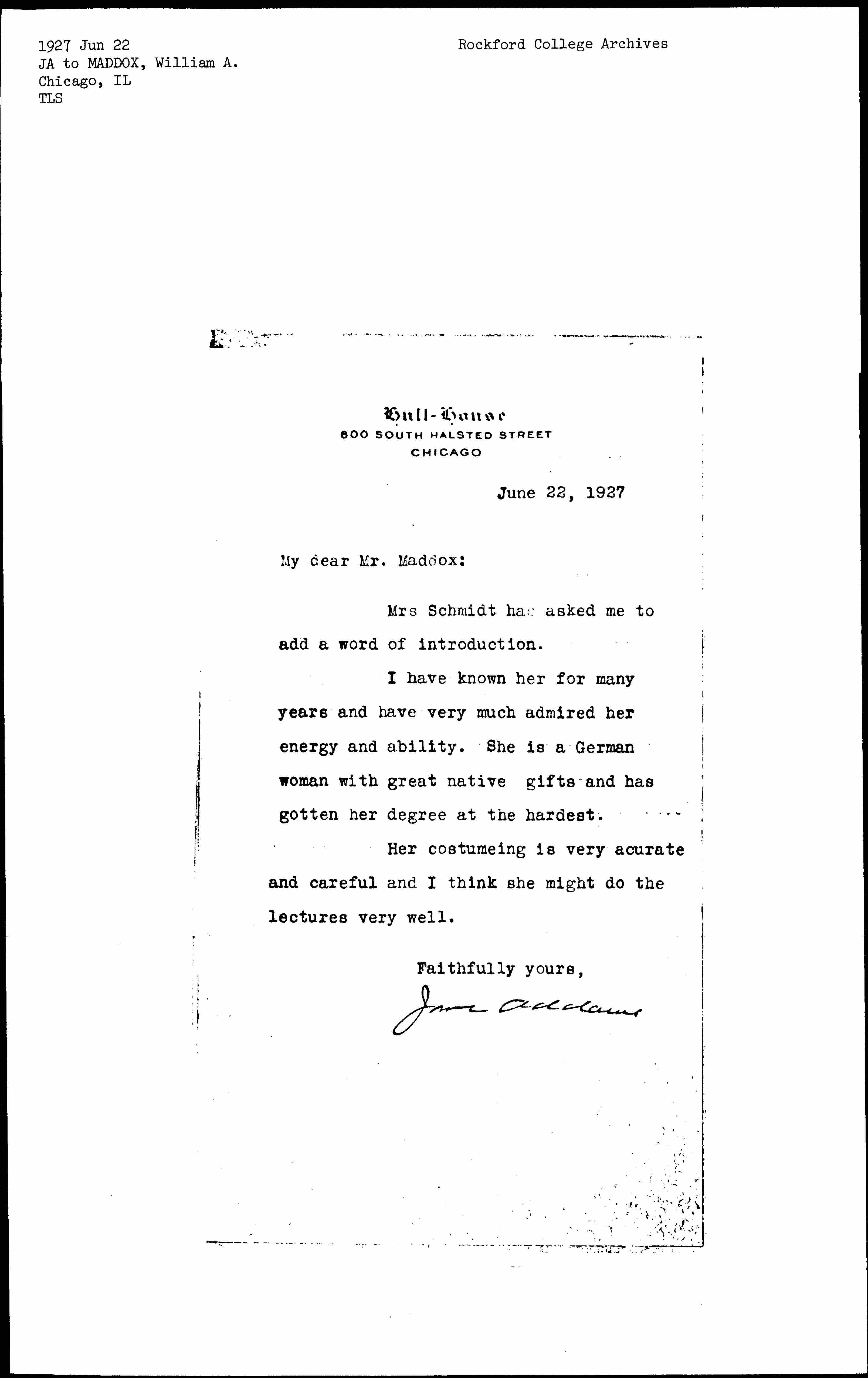 Jane Addams [signed]