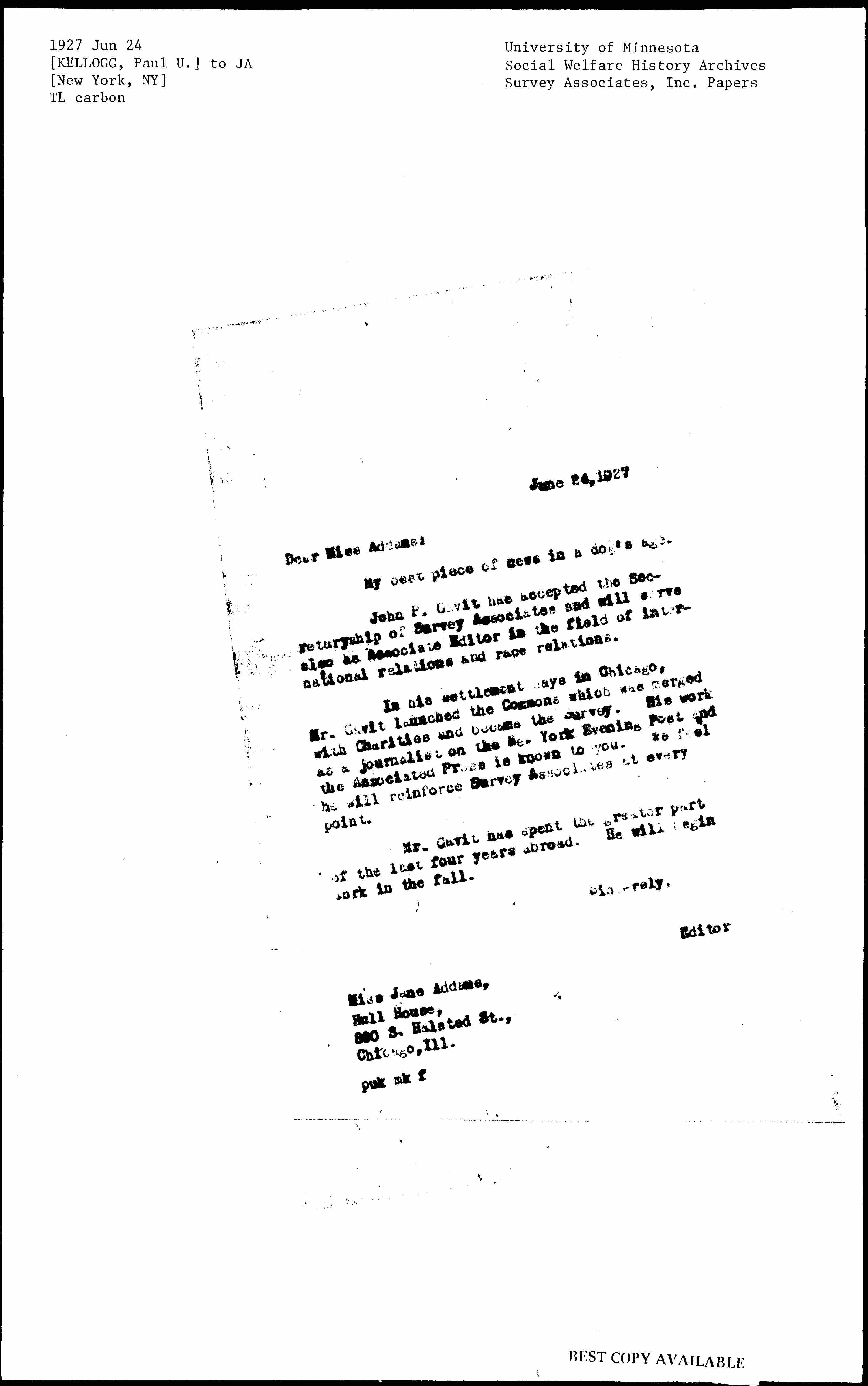 In his settlement [days] in Chicago, Mr. Gavit launched the Commons which was merged with Charities and became the Survey. His work as a journalist on the New York Evening Post and the Associated Press is known to you. We feel he will reinforce Survey Associates at every point.