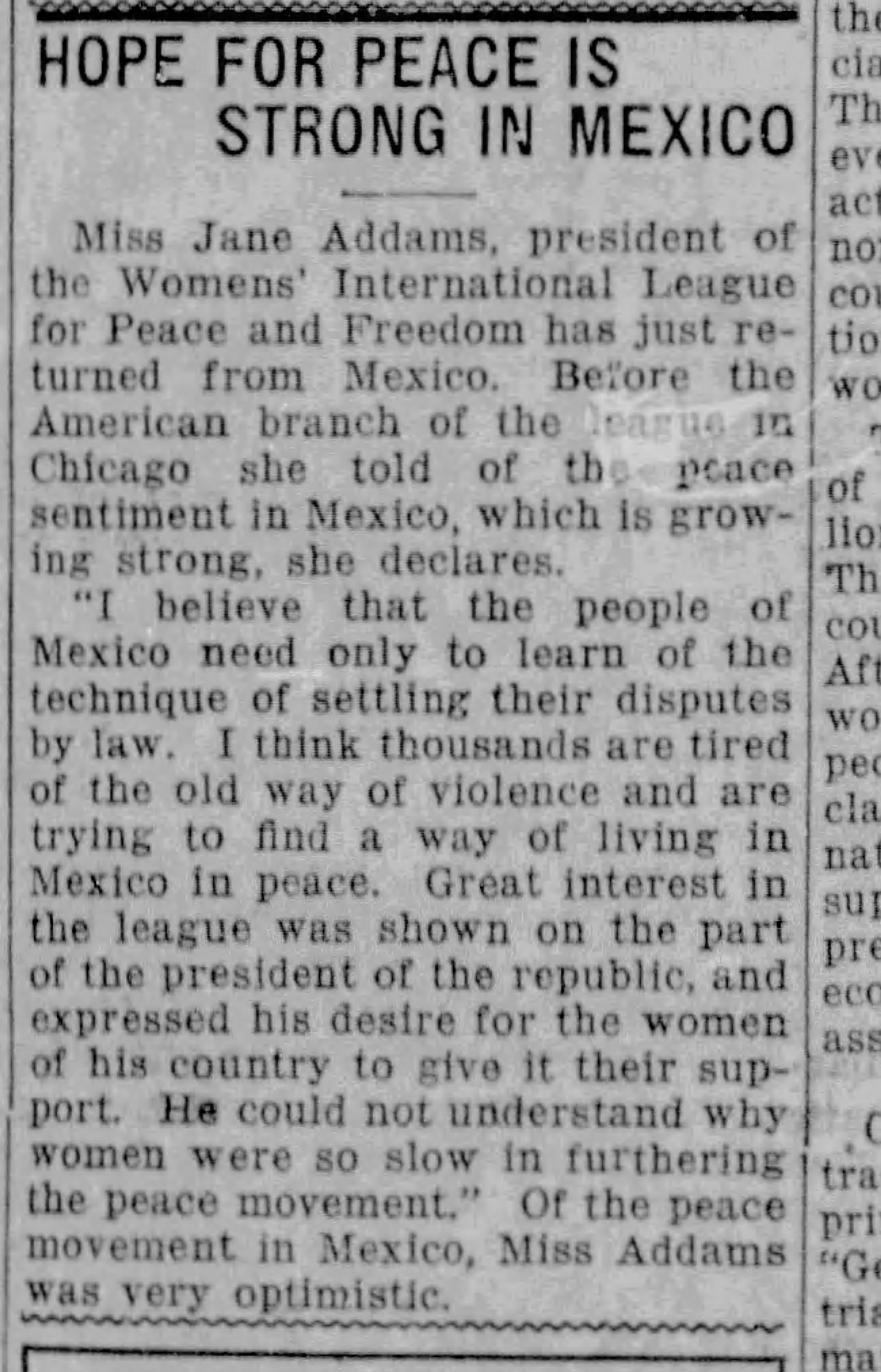 "I believe that the people of Mexico need only to learn of the technique of settling their disputes by law. I think thousands are tired of the old way of violence and are trying to find a way of living in Mexico in peace. Great interest in the league was shown on the part of the president of the republic, and expressed his desire for the women of his country to give it their support. He could not understand why women were so slow in furthering the peace movement." Of the peace movement in Mexico, Miss Addams was very optimistic.