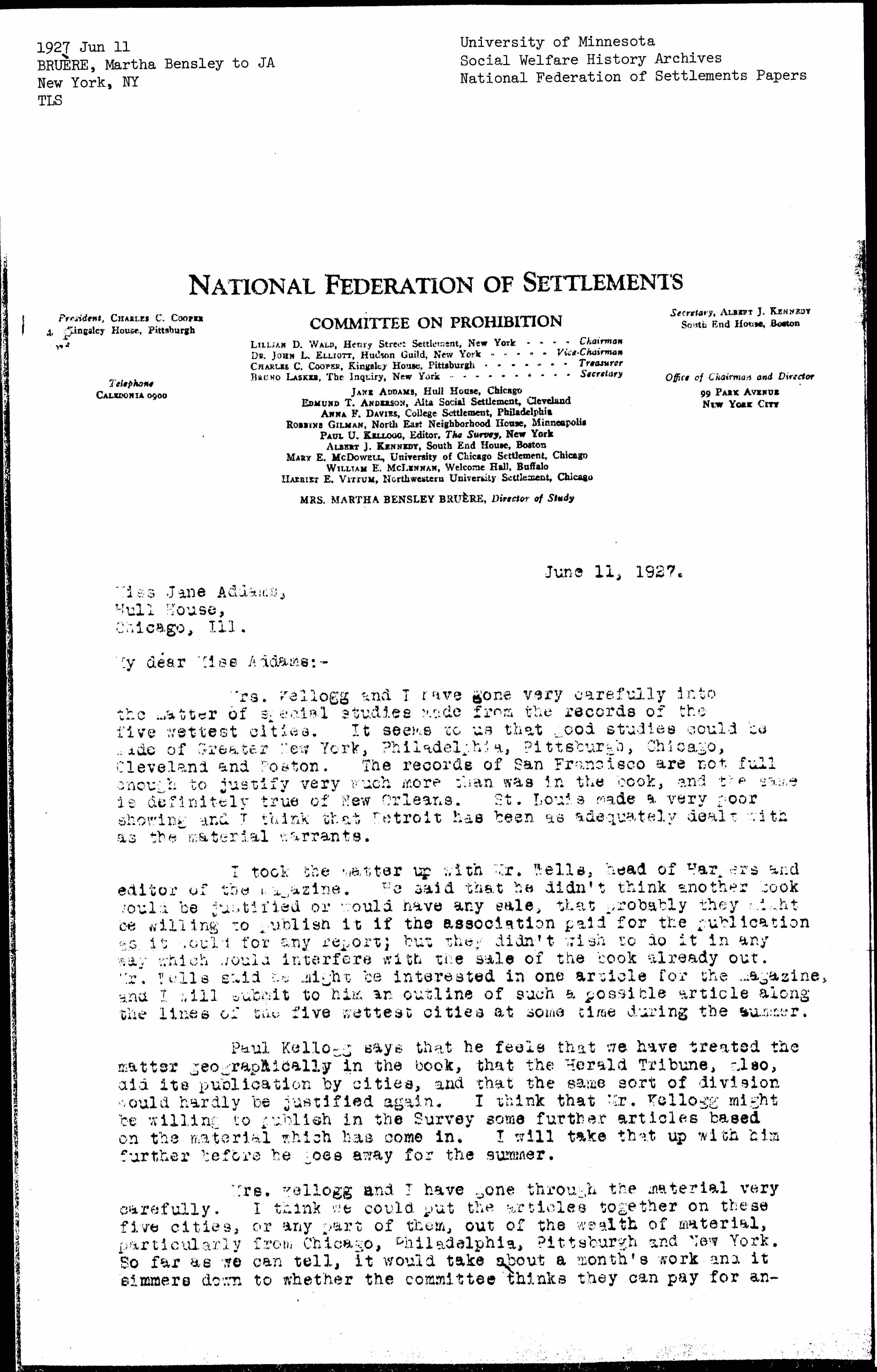 Mrs. Kellogg and I have gone very carefully into the matter of special studies made from the records of the five wettest cities. It seems to us that good studies could be made of Greater New York, Philadelphia, Pittsburgh, Chicago, Cleveland and Boston. The records of San Francisco are not full enough to justify very much more than was in the book, and the same is definitely true of New Orleans. St. Louis made a very poor showing and I think that Detroit has been as adequately dealt with as the material warrants.