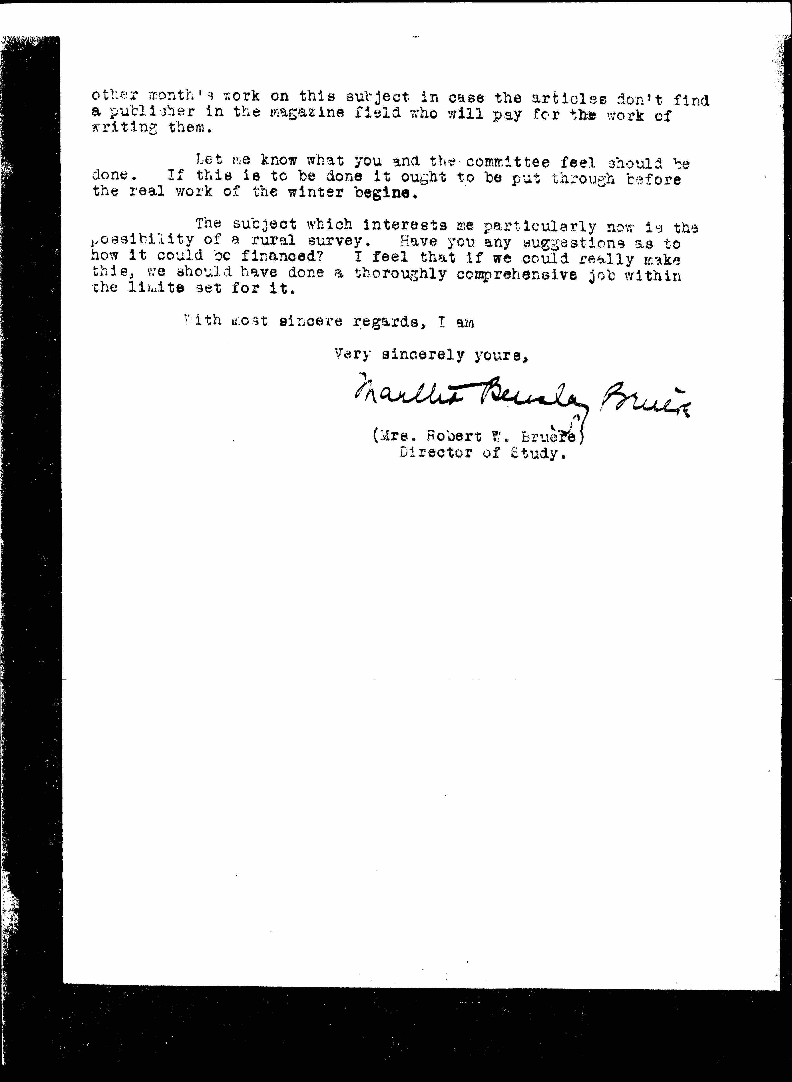 Mrs. Kellogg and I have gone through the material very carefully. I think we could put the articles together on these five cities, or any part of them, out of the wealth of material, particularly from Chicago, Philadelphia, Pittsburgh and New York. So far as we can tell, it would take about a month's work and it simmers down to whether the committee thinks they can pay for another [page 2] month's work on this subject in case the articles don't find a publisher in the magazine field who will pay for the work of writing them.