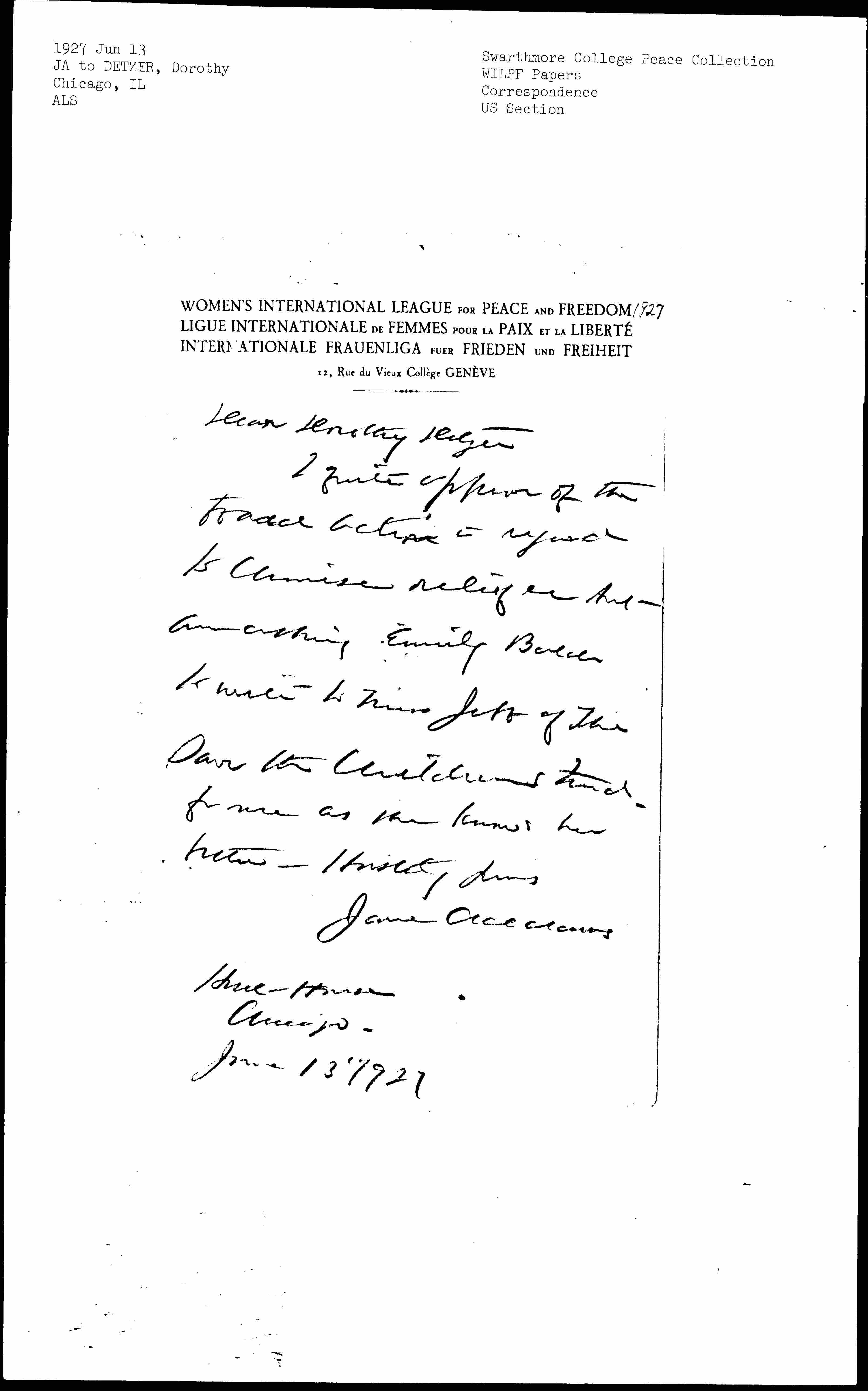 I quite approve of the board action in regard to Chinese relief but am asking Emily Balch to write to Miss Jebb of The Save the Children Fund -- for me as she knows her better. Hastily yours