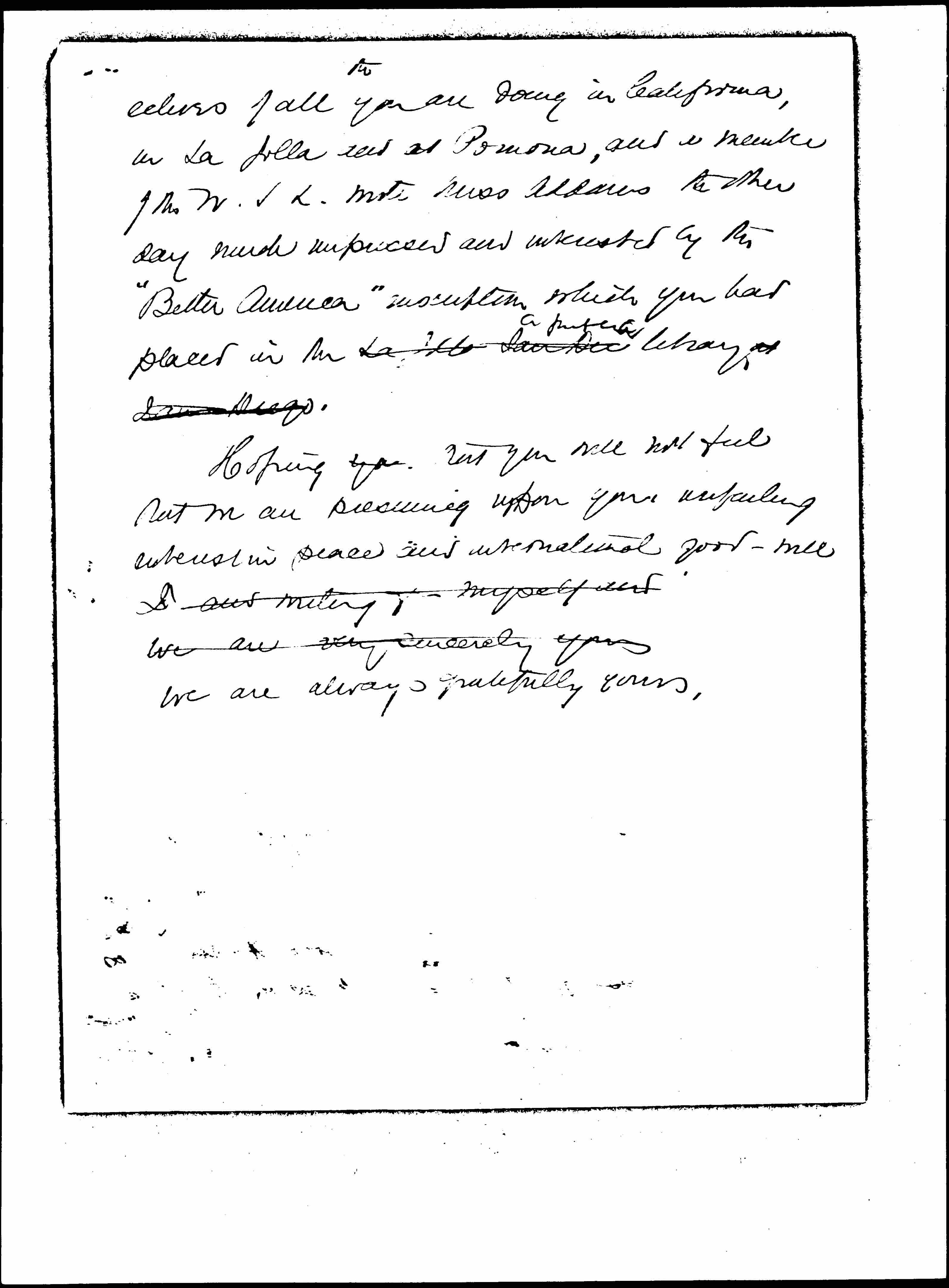 We hope very much that you will feel it a good investment to give a thousand dollars toward this undertaking which we believe has seeds of real usefulness in it. Our [illegible] Even at this distance we hear [page 3] echoes of all you are doing in California, in La Jolla and at Pomona, and a member of the W.I.L. wrote Miss Addams the other day much impressed and interested by the "Better America" subscription which you had placed in the La Jolla San Die ↑a public↓ library at San Diego.