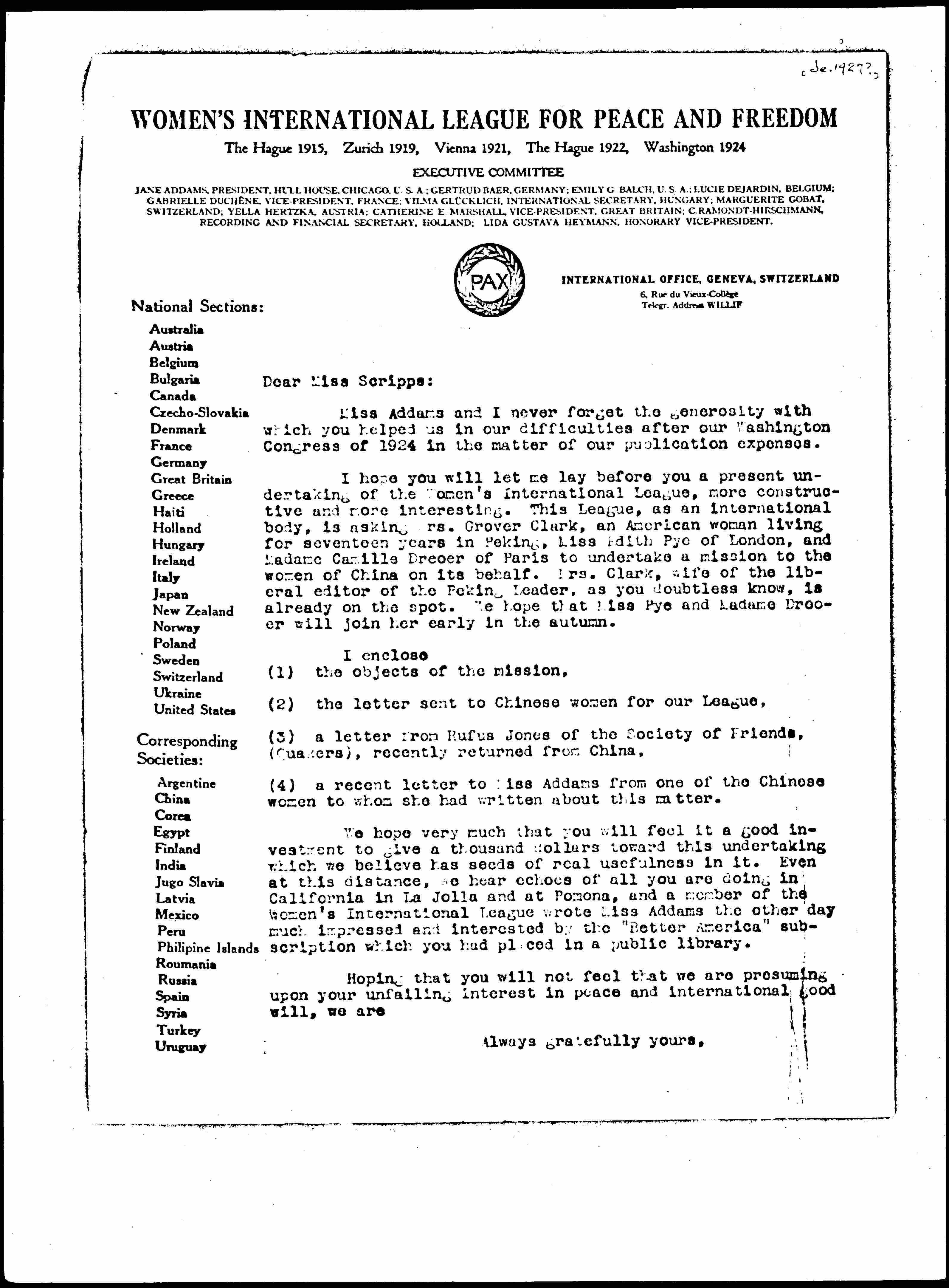 I hope you will let me lay before you a present undertaking of the Women's International League, more constructive and more interesting. This League, as an international body, is asking Mrs. Grover Clark, an American woman living for seventeen years in Peking, Miss Edith Pye of London, and Madame Camille [Drevet] of Paris to undertake a mission to the women of China on its behalf. Mrs. Clark, wife of the liberal editor of the Peking Leader, as you doubtless know, is already on the spot. We hope that Miss Pye and Madame [Drevet] will join her early in the autumn.