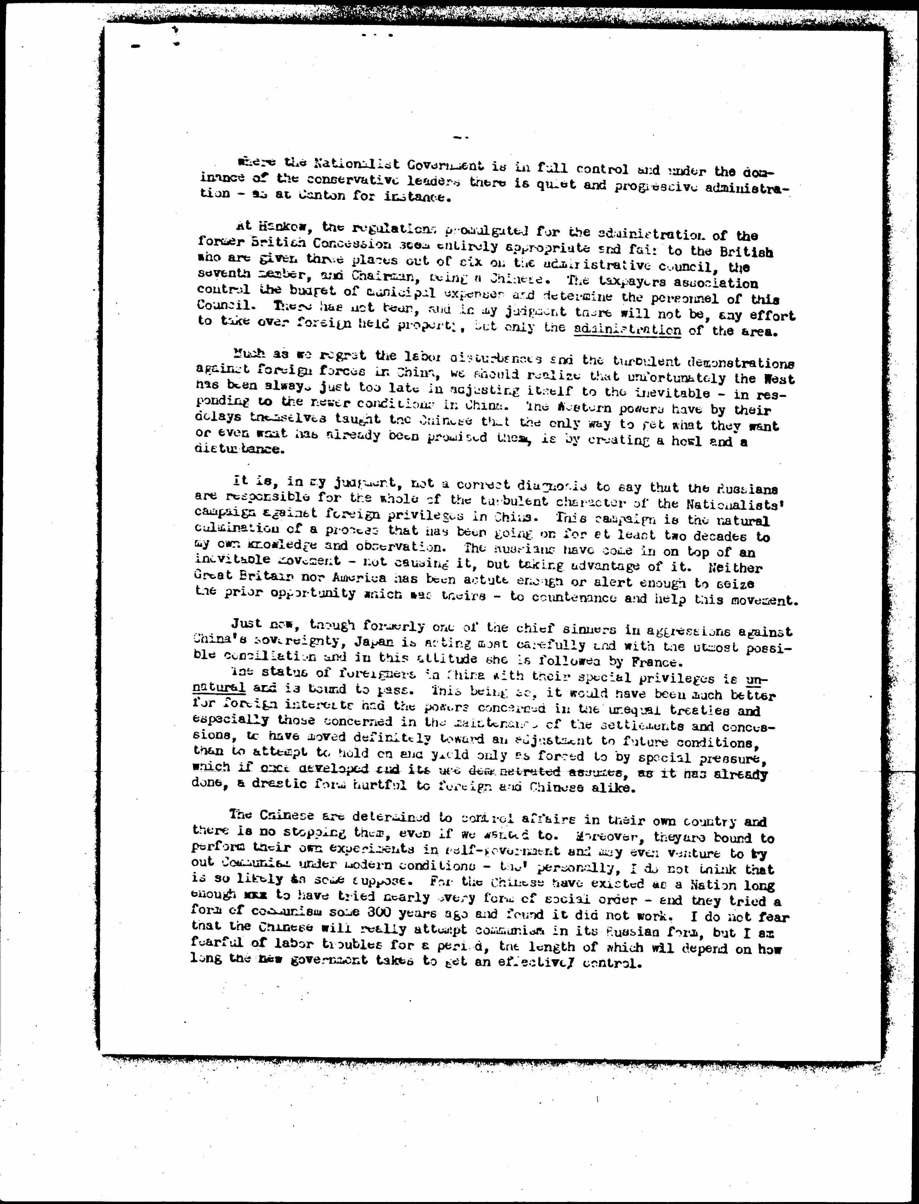 The Chinese are determined to control affairs in their own country and there is no stopping them, even if we wished to. Moreover, they are bound to perform their own experiments in self-government and may even venture to try out Communism under modern conditions -- [though] personally, I do not think that is so likely as some suppose. For the Chinese have existed as a Nation long enough [illegible] to have tried nearly every form of social order -- and they tried a form of communism some 300 years ago and found it did not work. I do not fear that the Chinese will really attempt communism in its Russian form, but I am fearful of labor troubles for a period, the length of which [will] depend on how long the new government takes to get an effective control. [page 3]