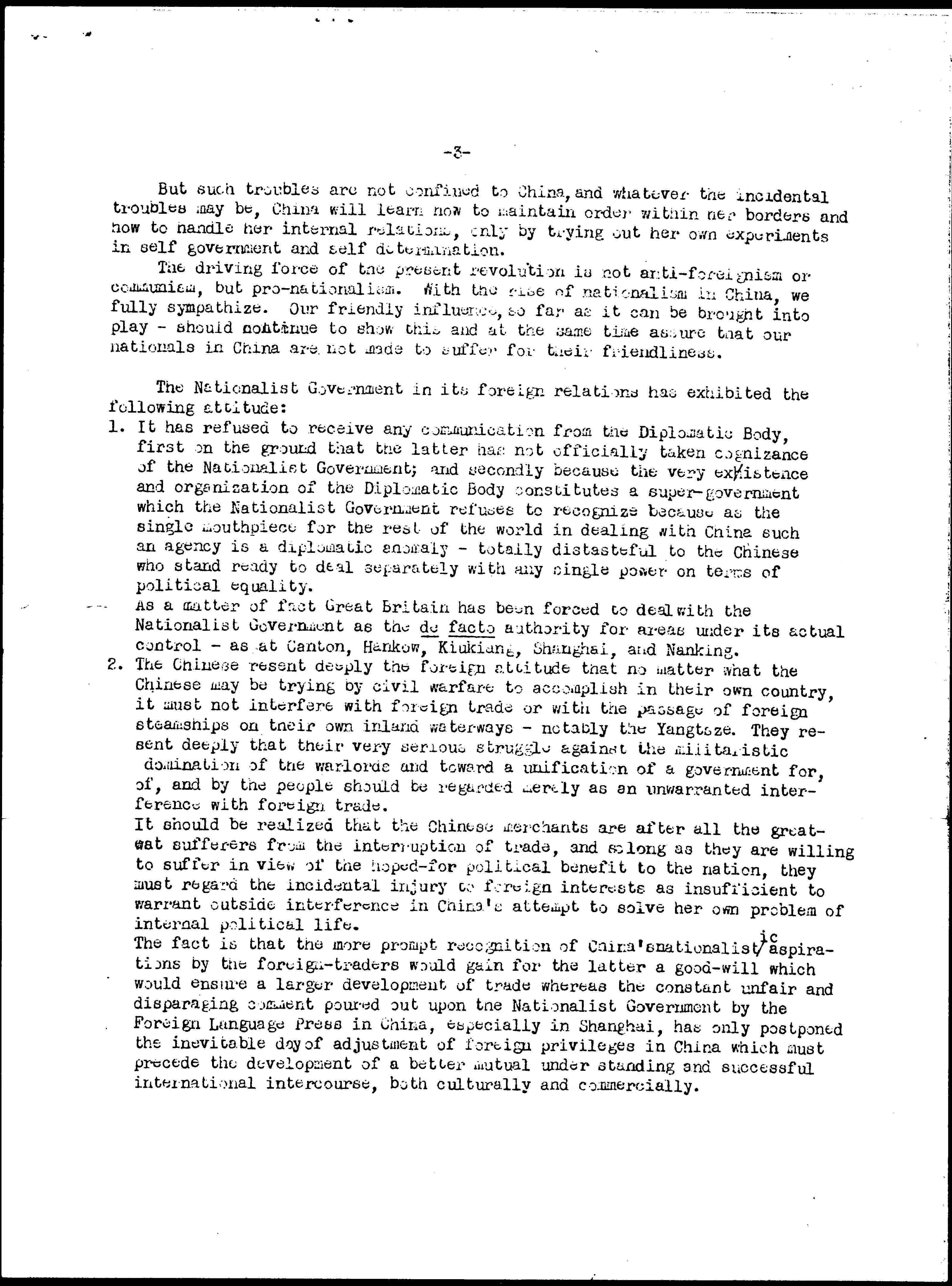 The uncertainty at Shanghai and the unfortunate incidents at Nanking are after all natural and temporary phases of the period of transition during which the forces of the Nationalist Government are not yet fully in control and depredations are committed by retreating Northern soldiers, sometimes possibly disguised as Nationalists. It may be too, that at Nanking the trouble was made by some extreme radicals of the [Kuomintang] in order to discredit the conservative leader, General [Chiang] Kai Shek. The information available up to now is not sufficient to tell when is the correct explanation. [page 2]