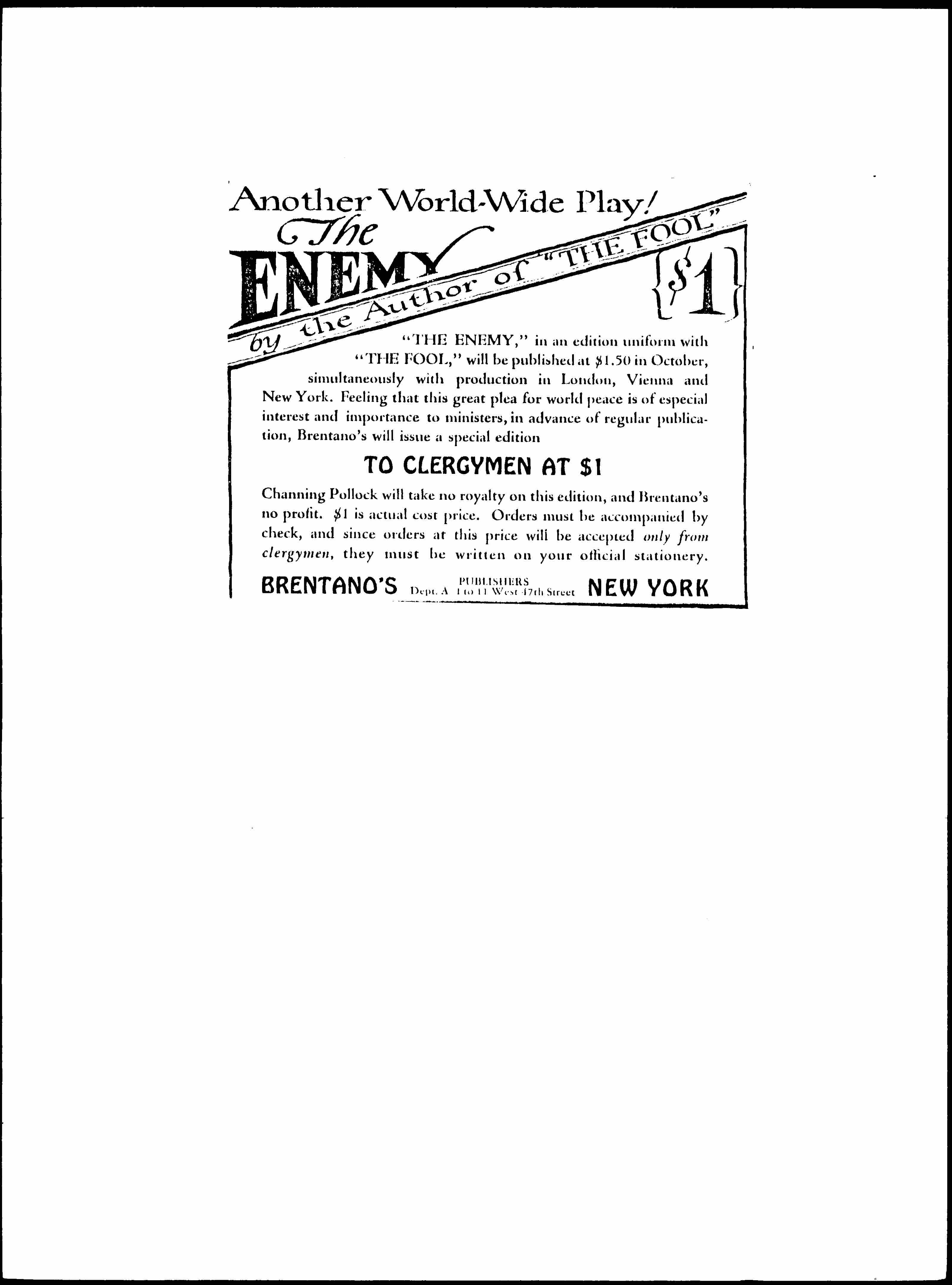 Channing Pollack will take no royalty on this edition, and Brentano's no profit. $1 is actual cost price. Orders must be accompanied by check, and since orders at this price will be accepted only from clergymen, they must be written on your official stationery.