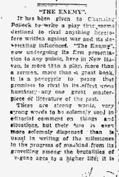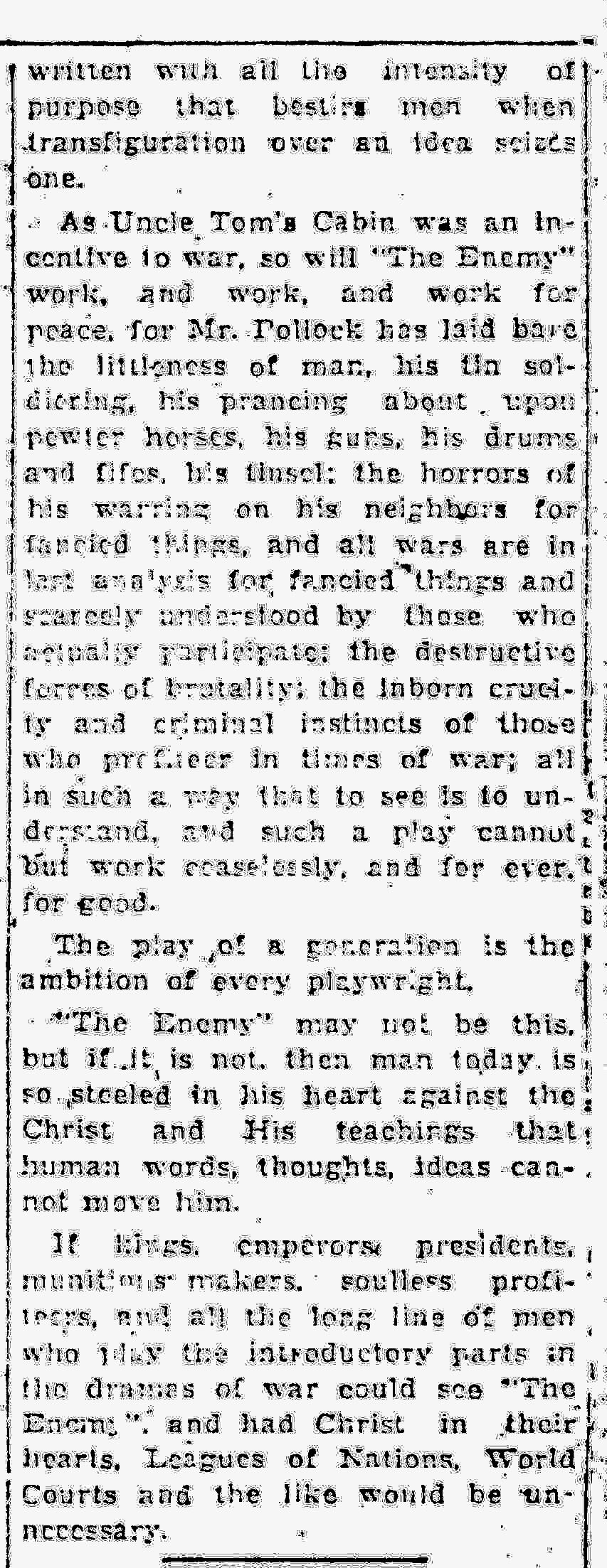 As Uncle Tom's Cabin was an incentive to war, so will "The Enemy" work, and work, and work for peace, for Mr. Pollock has laid bare the littleness of man, his tin soldiering, his prancing about upon pewter horses, his guns, his drums and fifes, his tinsel; the horrors of his warring on his neighbors for fancied things, and all wars are in last analysis for fancied things and scarcely understood by those who actually participate; the destructive forces of brutality; the inborn cruelty and criminal instincts of those who profiteer in times of war; all in such a way that to see is to understand, and such a play cannot but work ceaselessly, and for ever, for good.